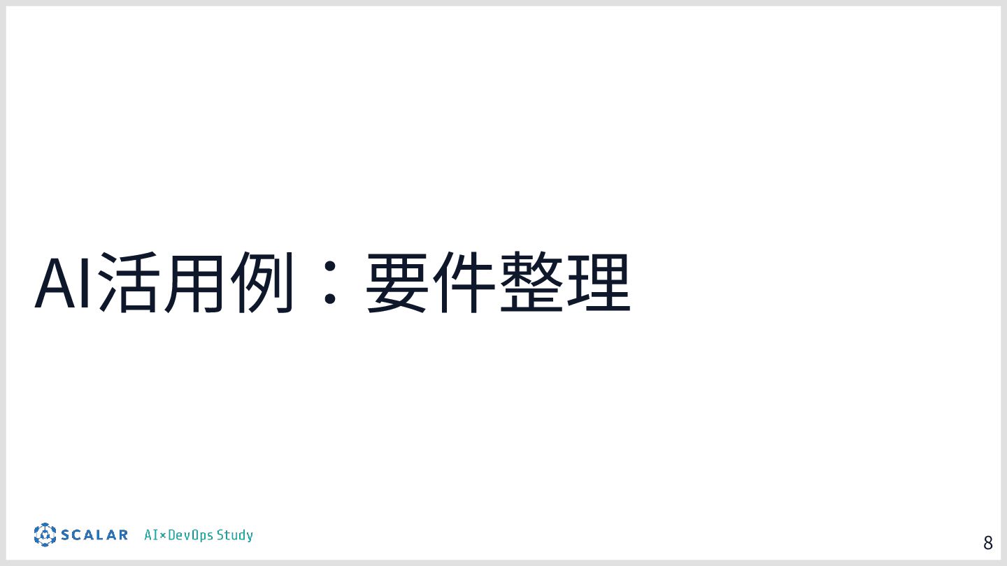 AI活用の全体像: AI活用の目的を「個人の作業効率化」から、チーム全体の「要件の認識ズレ解消」や「コード品質の統一」へと引き上げる方針を提示