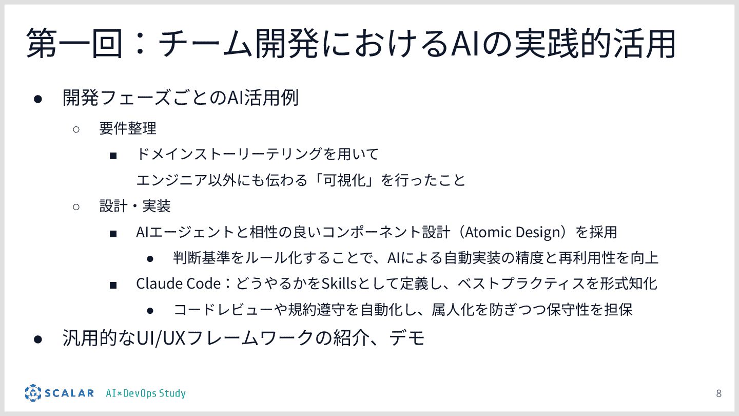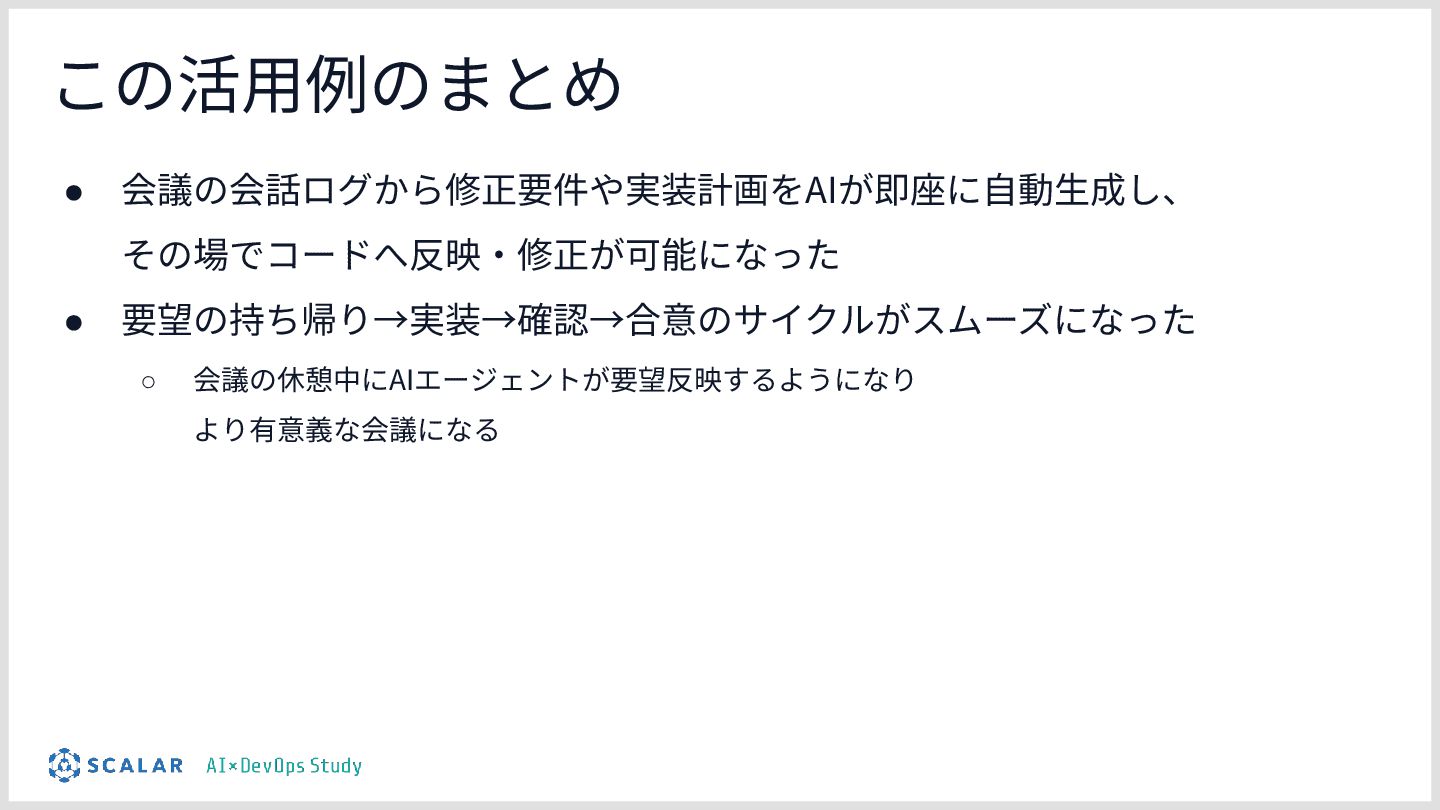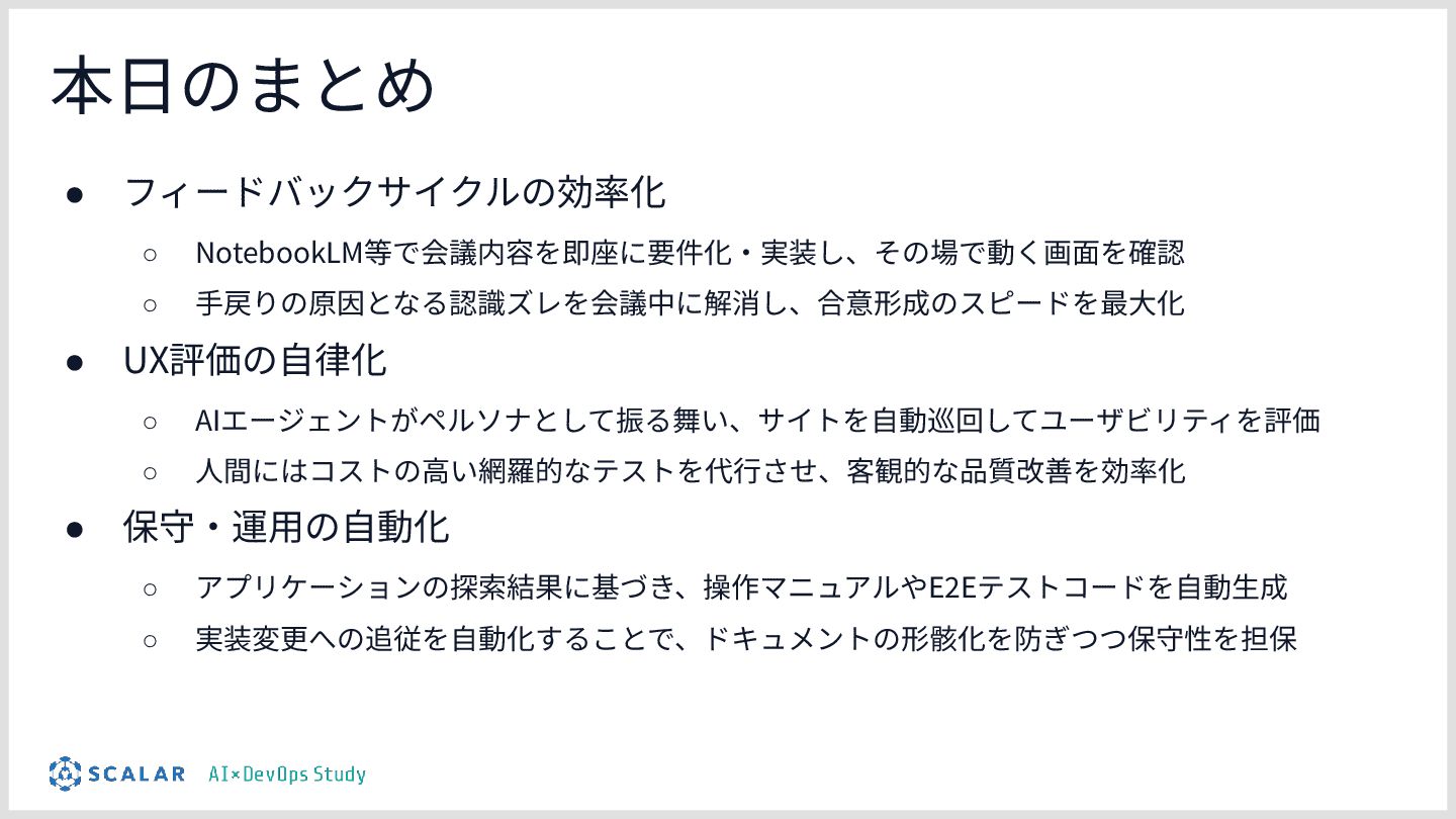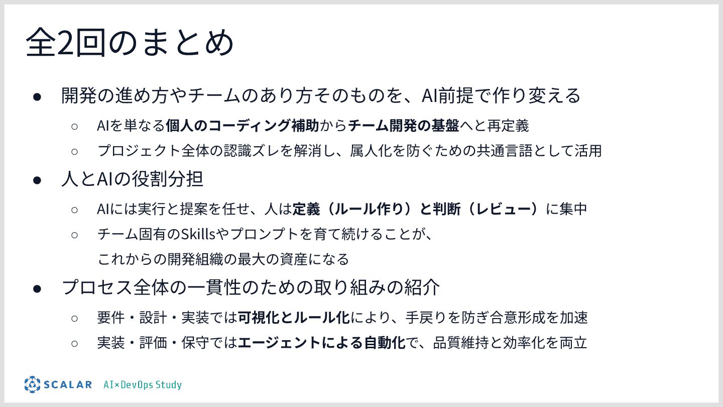 AI活用の深化:実装だけでなく、その後の「評価」や「ドキュメント化」といった周辺業務においてもAIエージェントを活用し、プロジェクト全体の品質とスピードを向上させる方針を提示。