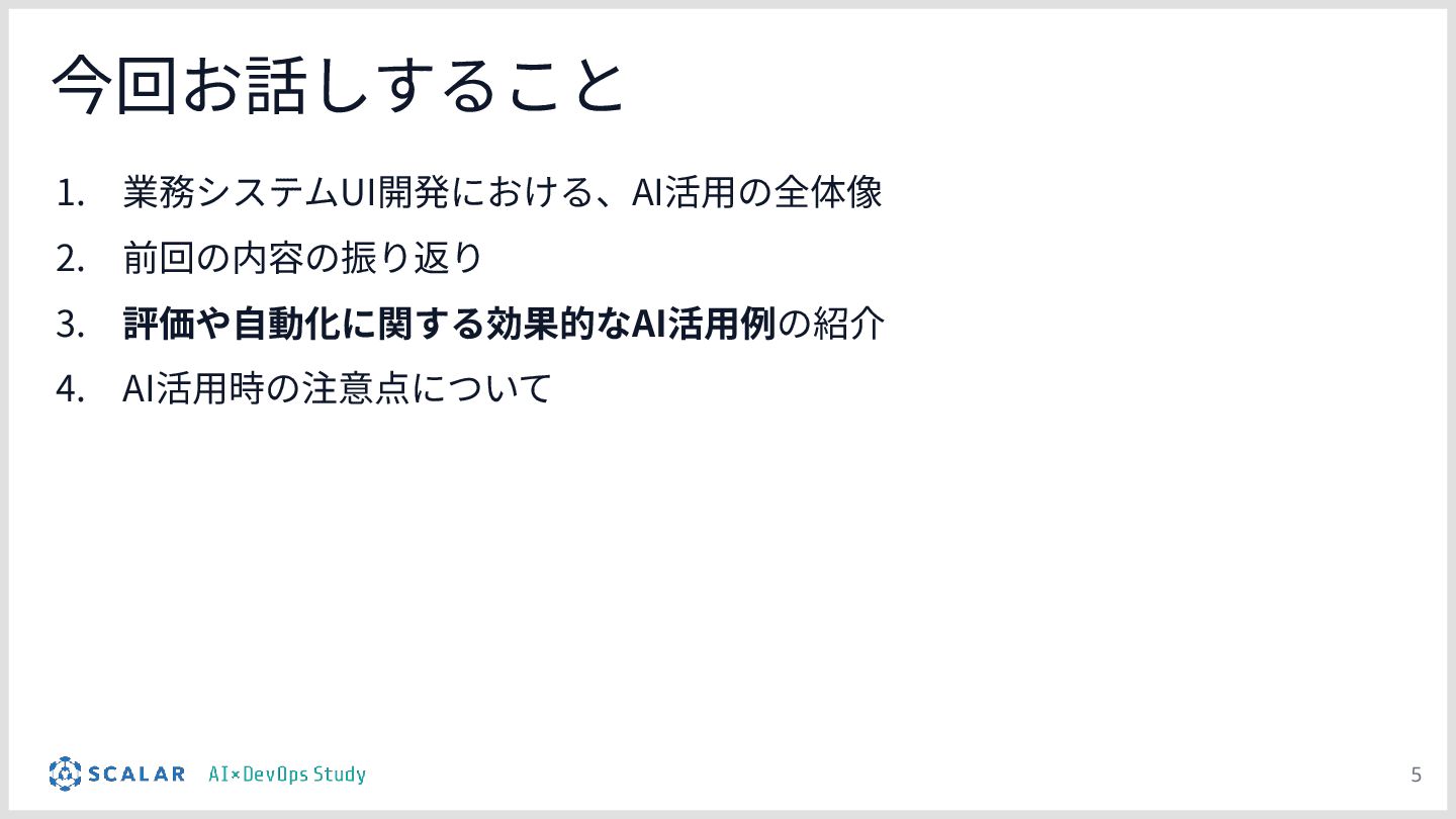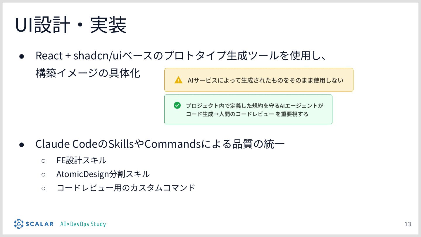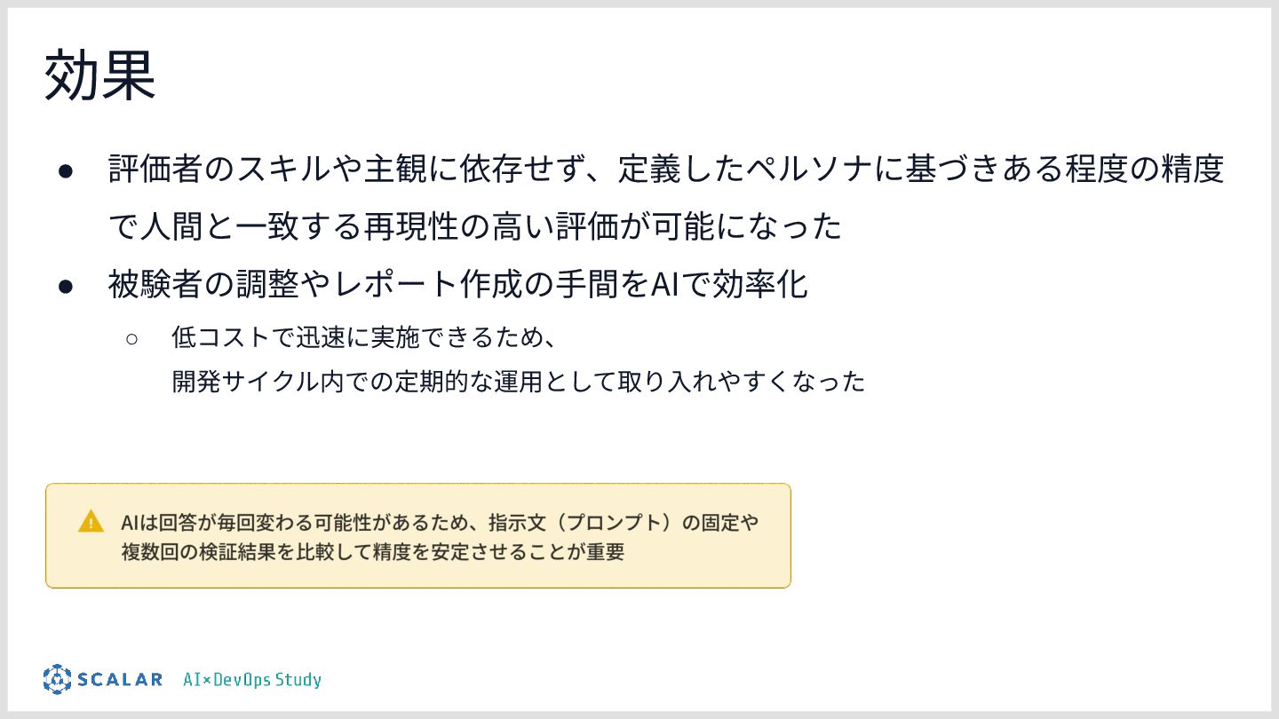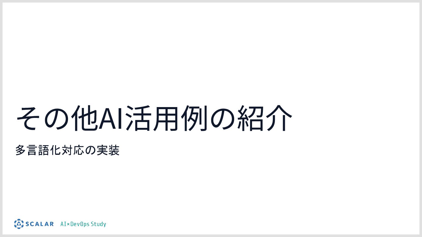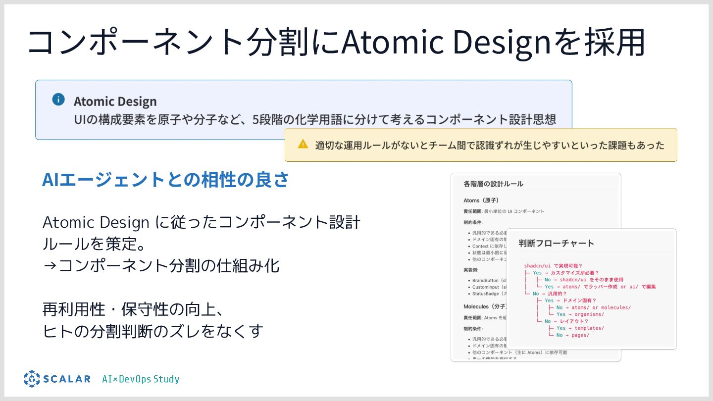 AI活用の深化:実装だけでなく、その後の「評価」や「ドキュメント化」といった周辺業務においてもAIエージェントを活用し、プロジェクト全体の品質とスピードを向上させる方針を提示。