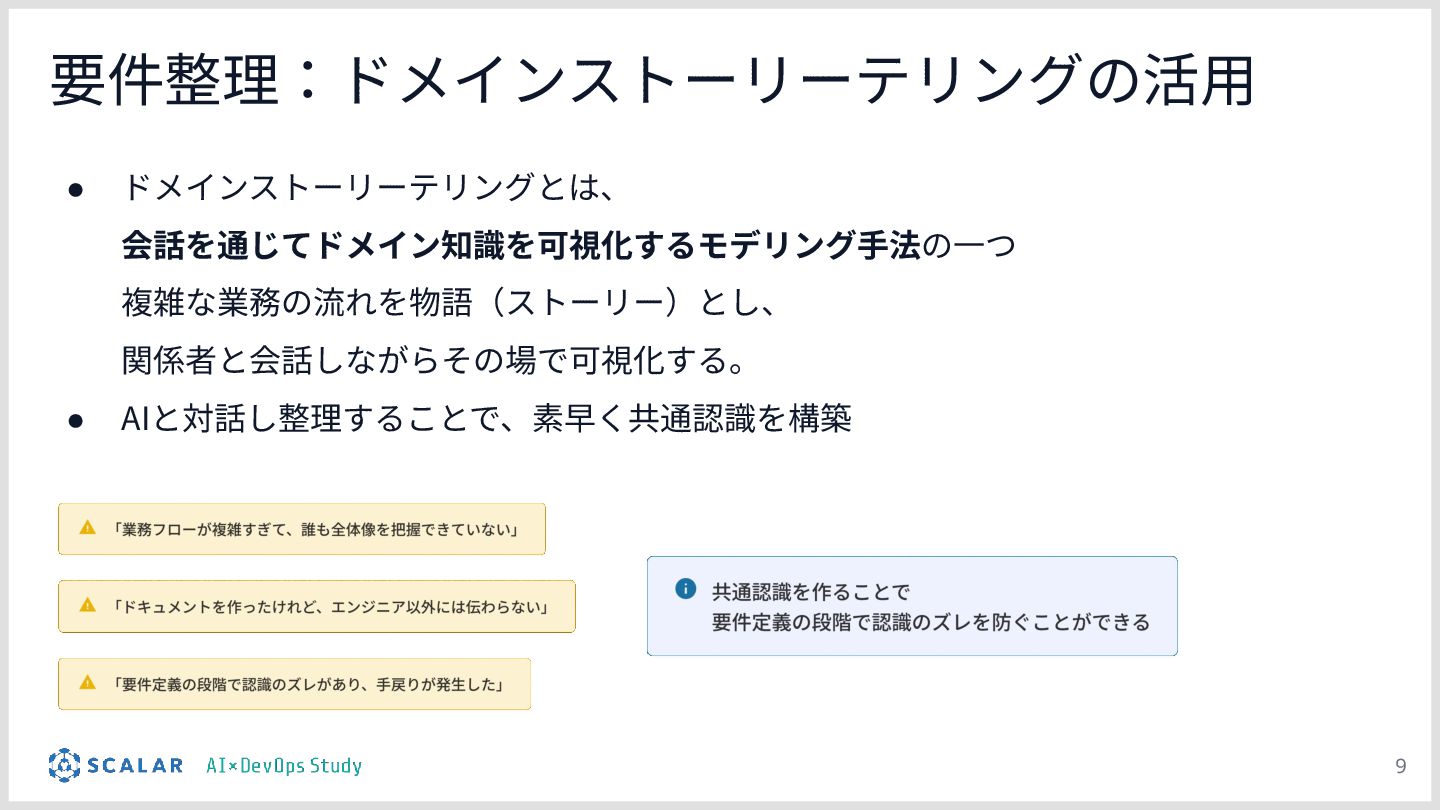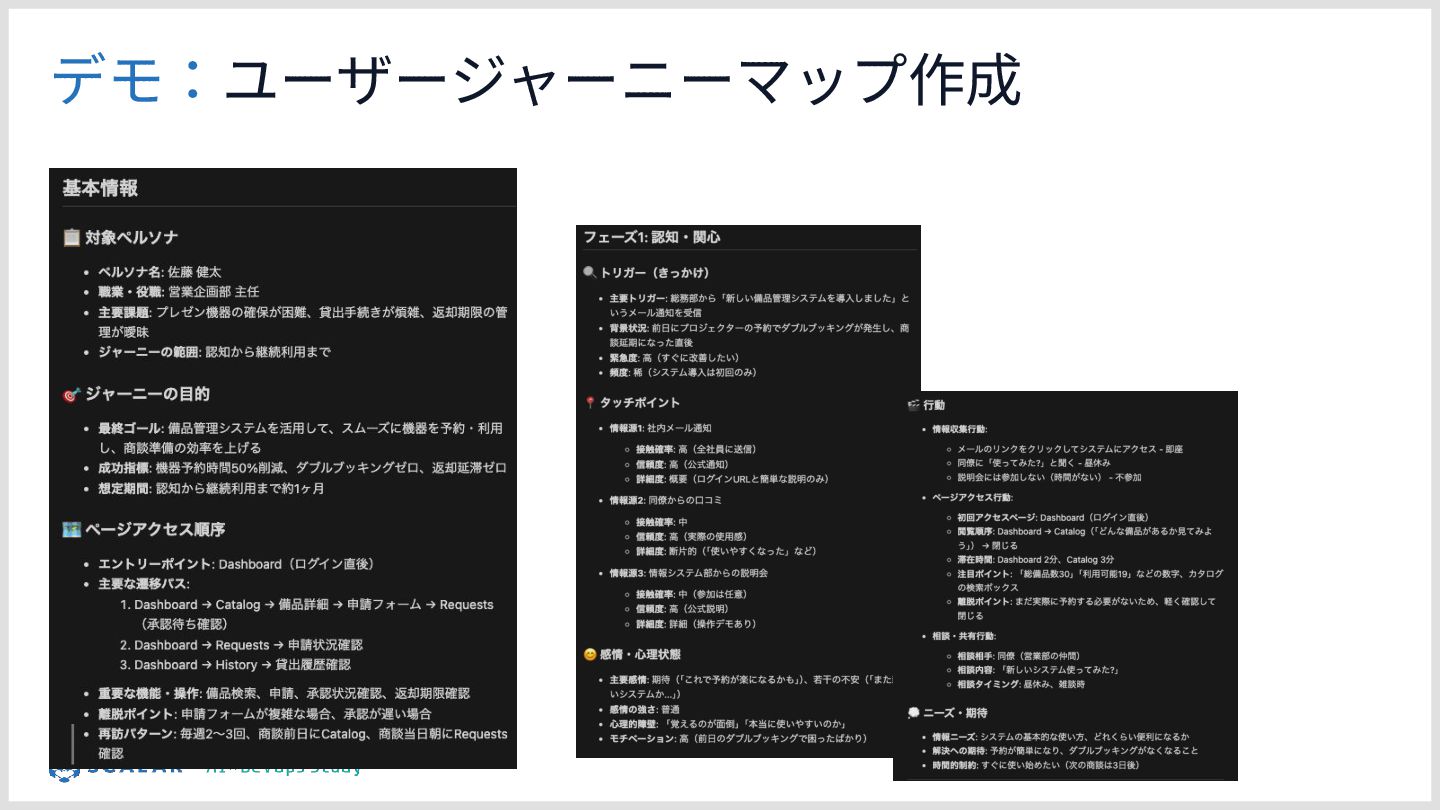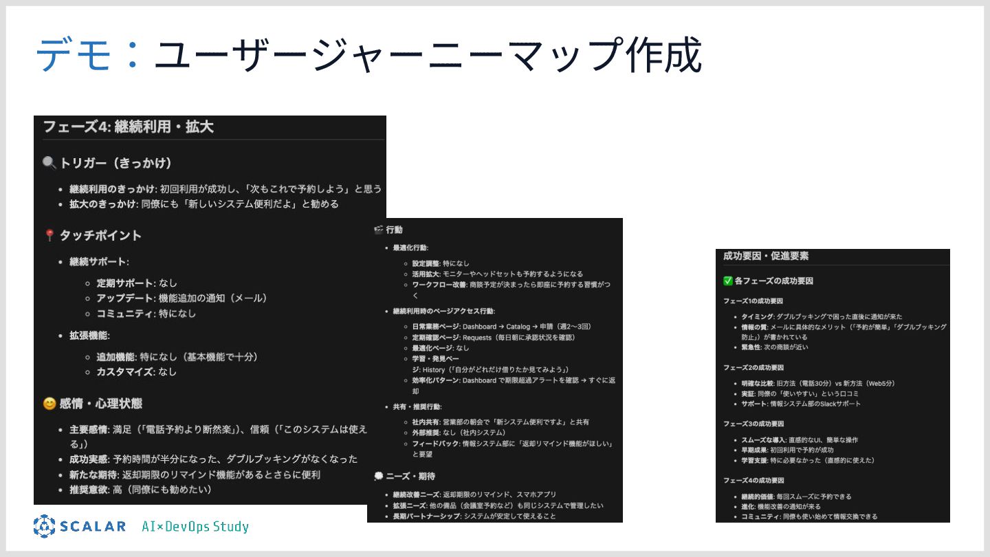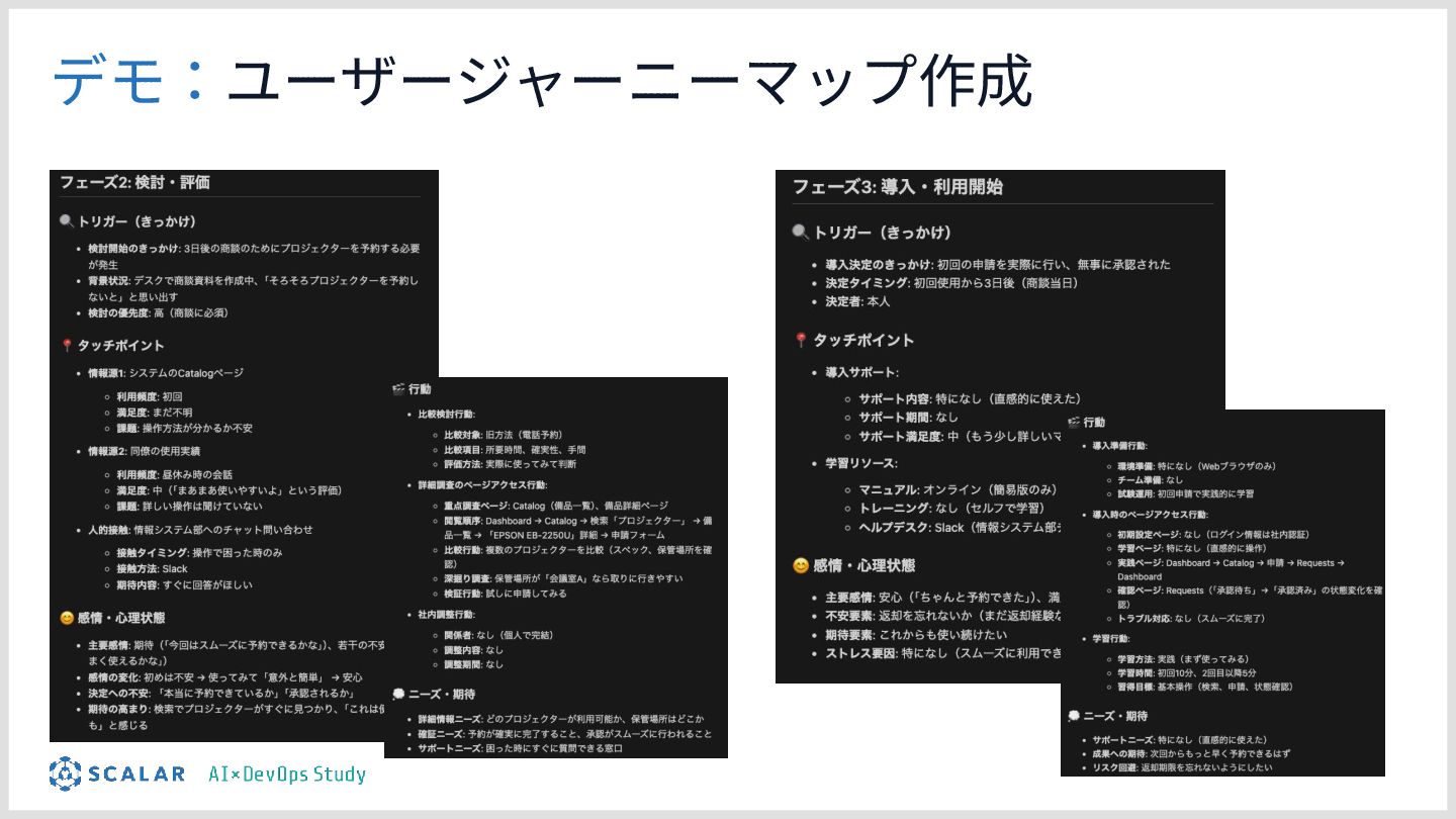 AI活用の深化:実装だけでなく、その後の「評価」や「ドキュメント化」といった周辺業務においてもAIエージェントを活用し、プロジェクト全体の品質とスピードを向上させる方針を提示。