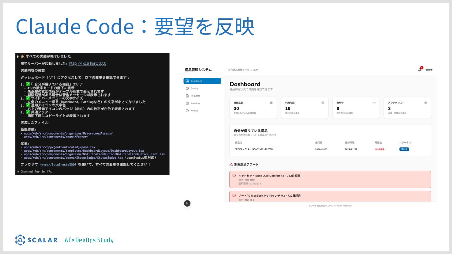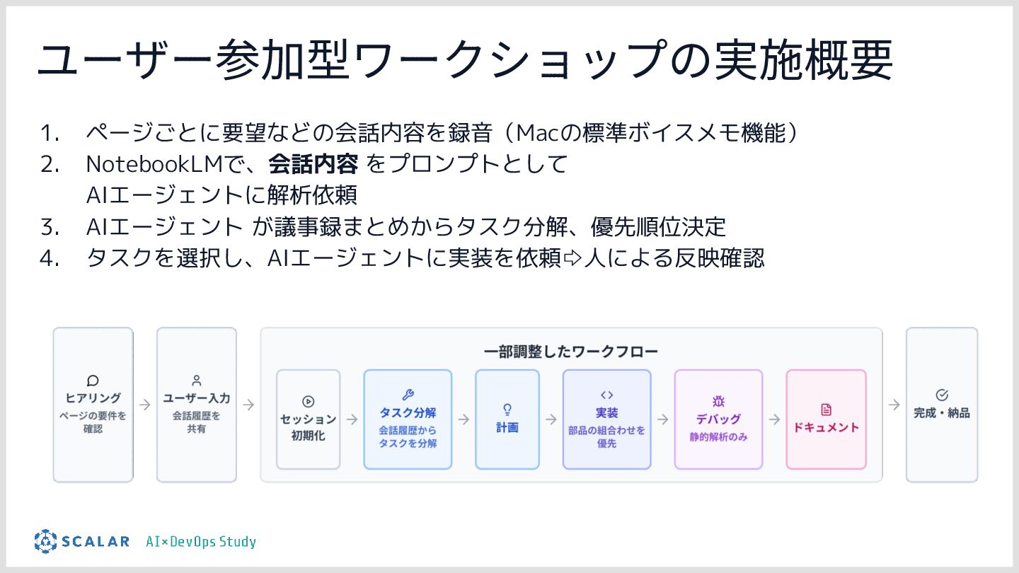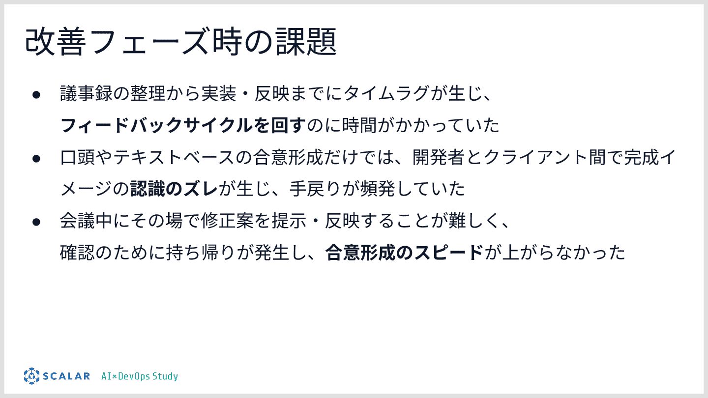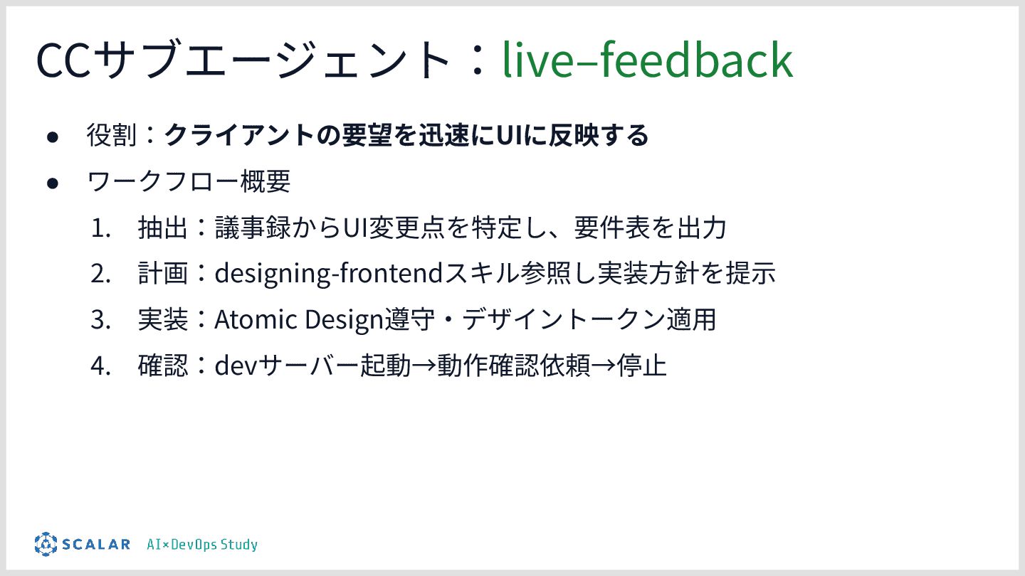 即時実装フロー:抽出した要件をAIエージェントに渡し、その場でコード修正から動作確認(devサーバー起動)までを行うことで、会議中に改善案を提示できるスピード感を実現。