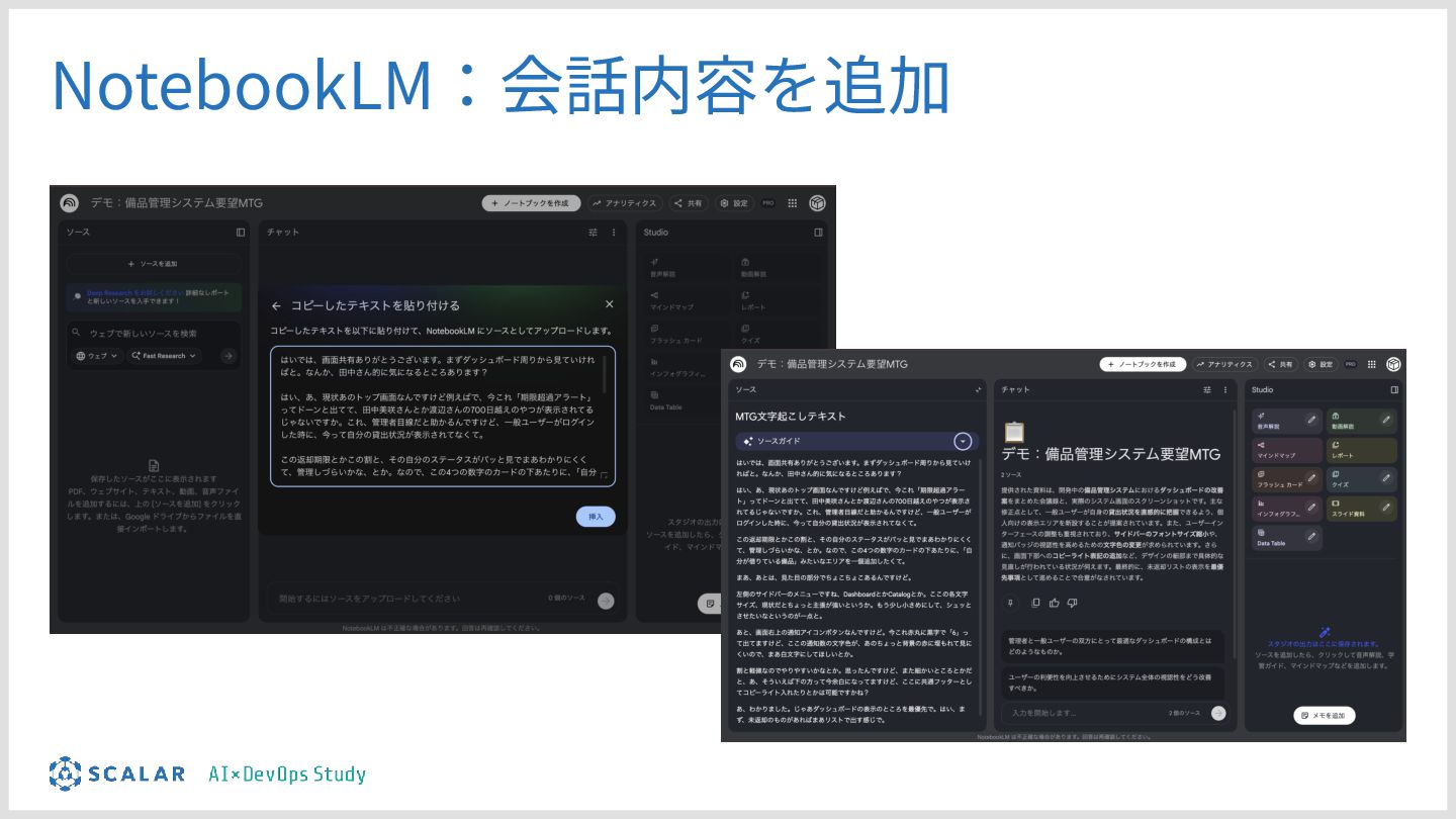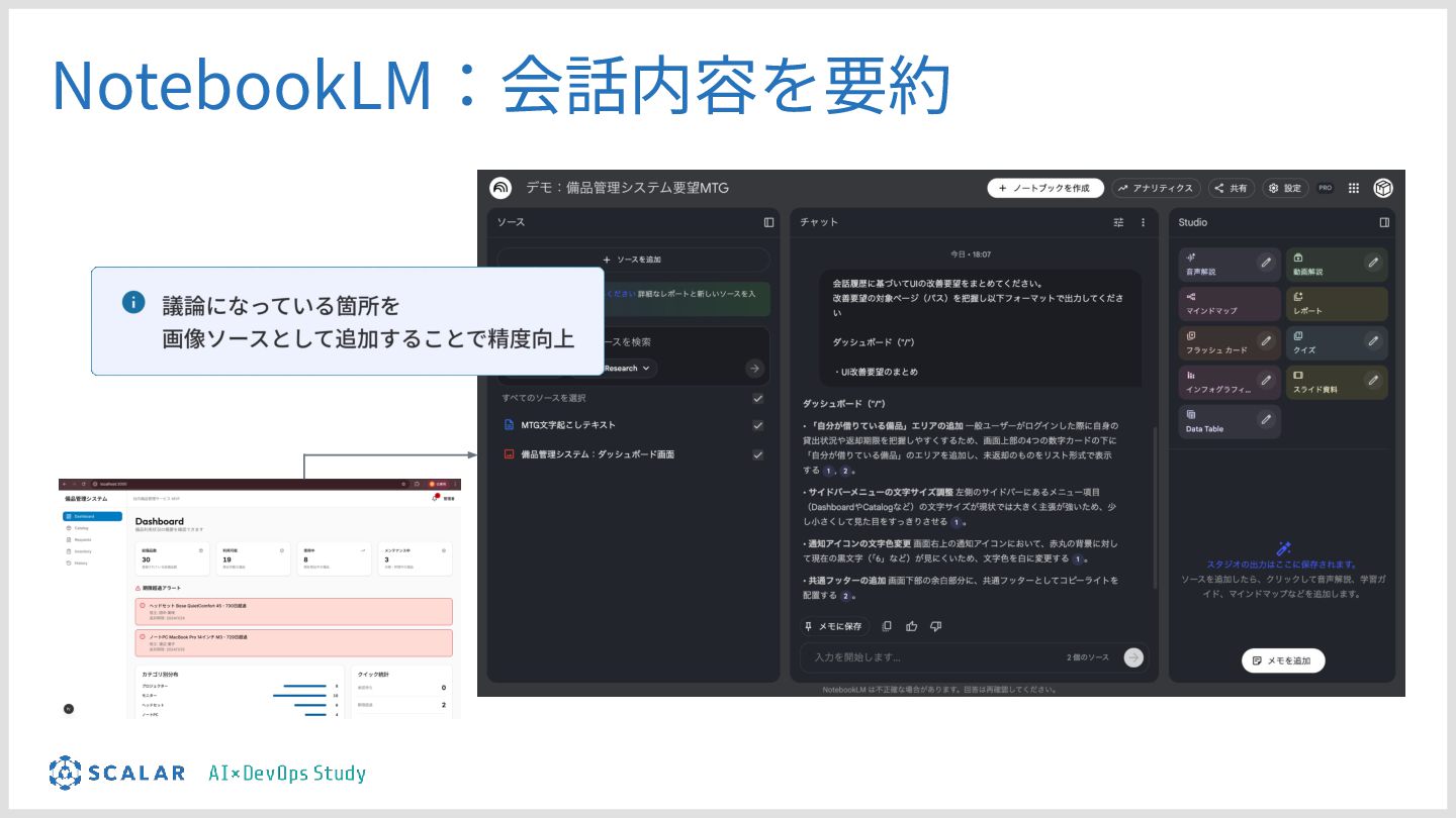 会議のマルチモーダル集約:Googleの「NotebookLM」を活用し、会議の録音データと実際の画面キャプチャ(スクリーンショット)をソースとして読み込ませることで、精度の高い要件抽出とタスク分解を自動化。