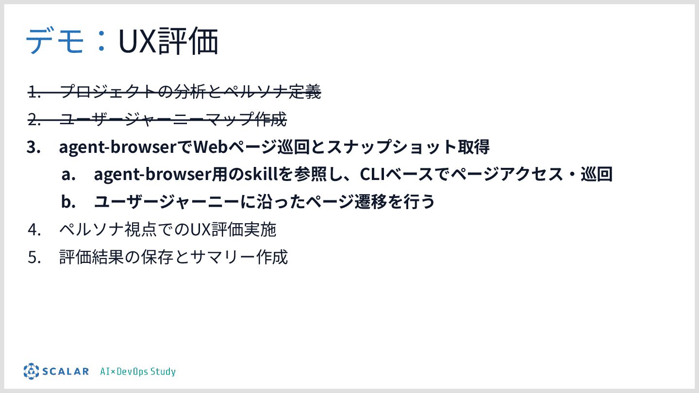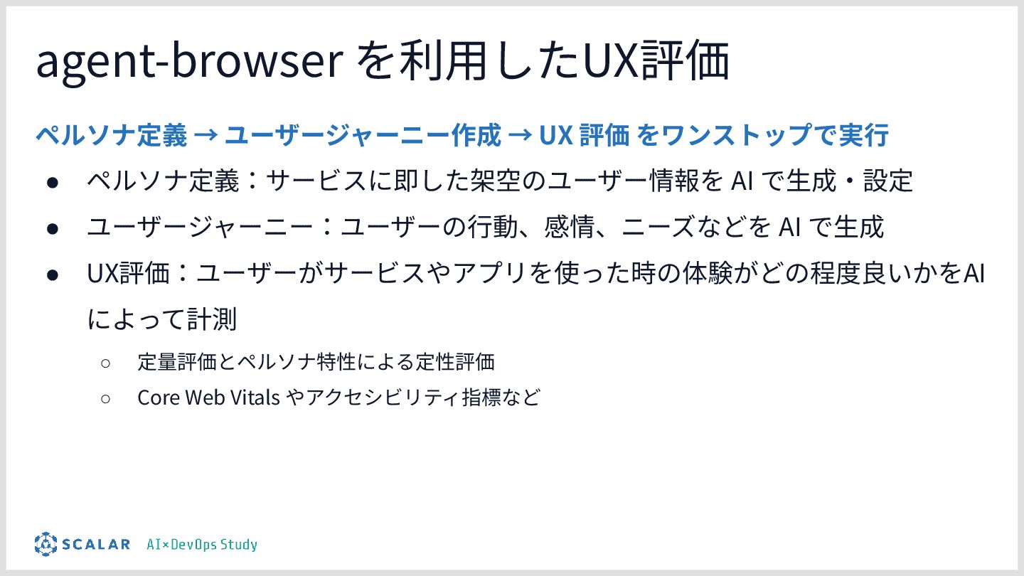 評価の自動化:Vercel製の「agent-browser」を利用し、AIがブラウザを操作してユーザー行動をシミュレーションすることで、コストと時間を抑えたUX評価を実施。
