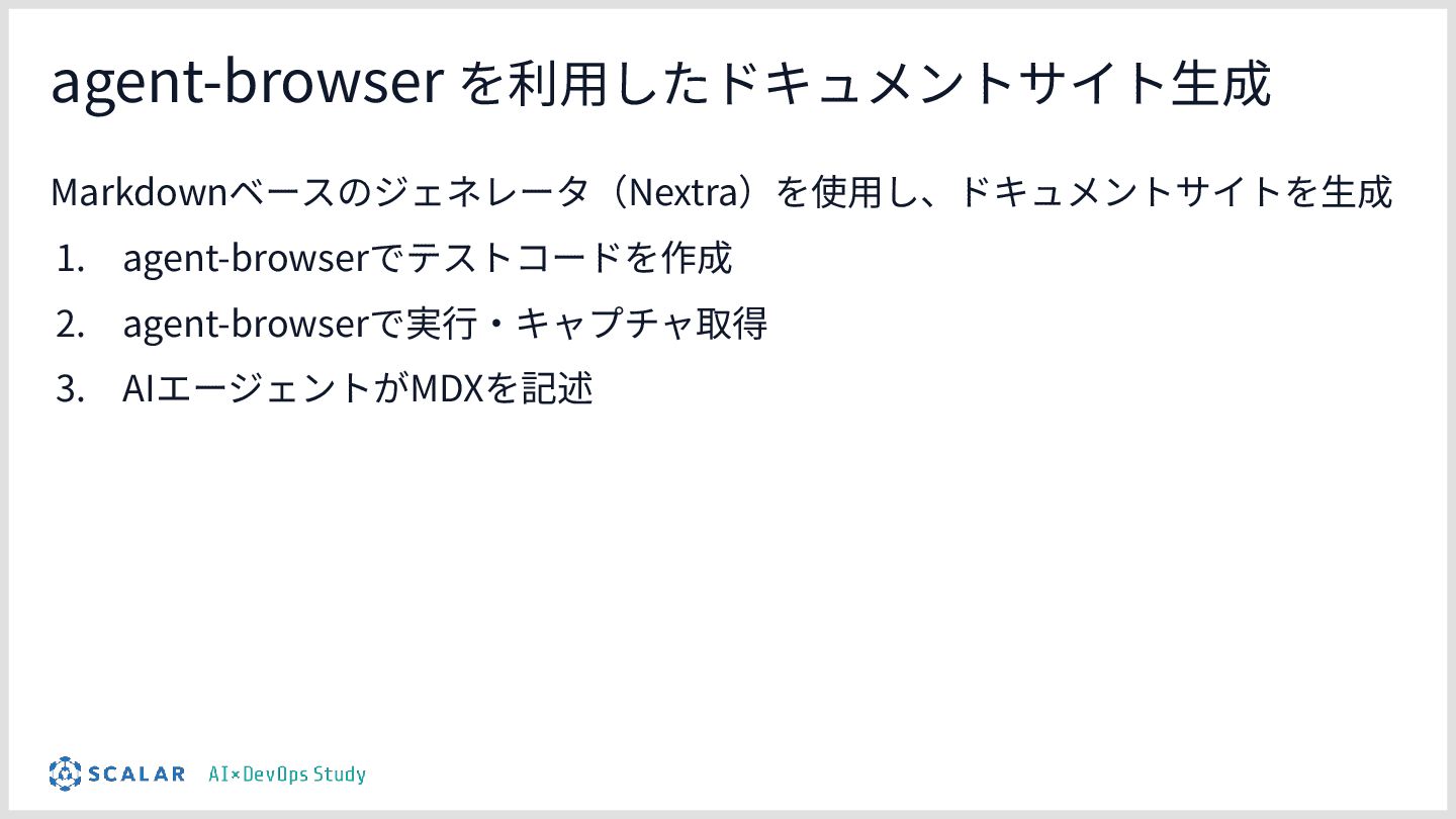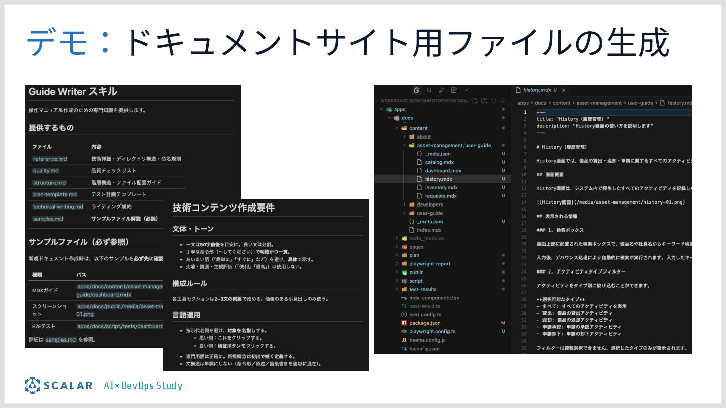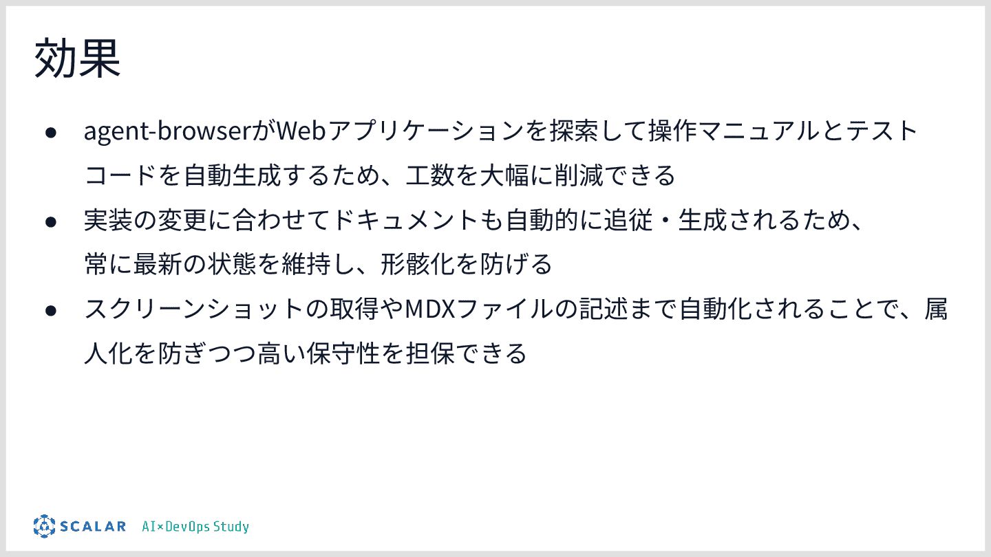 ドキュメントとテストの同期:AIエージェントがアプリケーションを探索し、E2Eテスト(Playwright)の実装、スクリーンショットの撮影、そして操作マニュアル(MDX)の執筆までを一貫して自動で行う仕組みを構築。