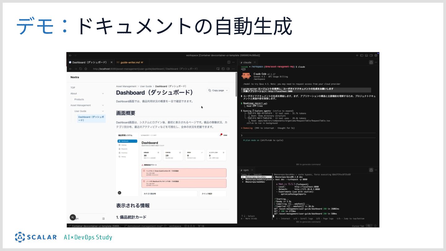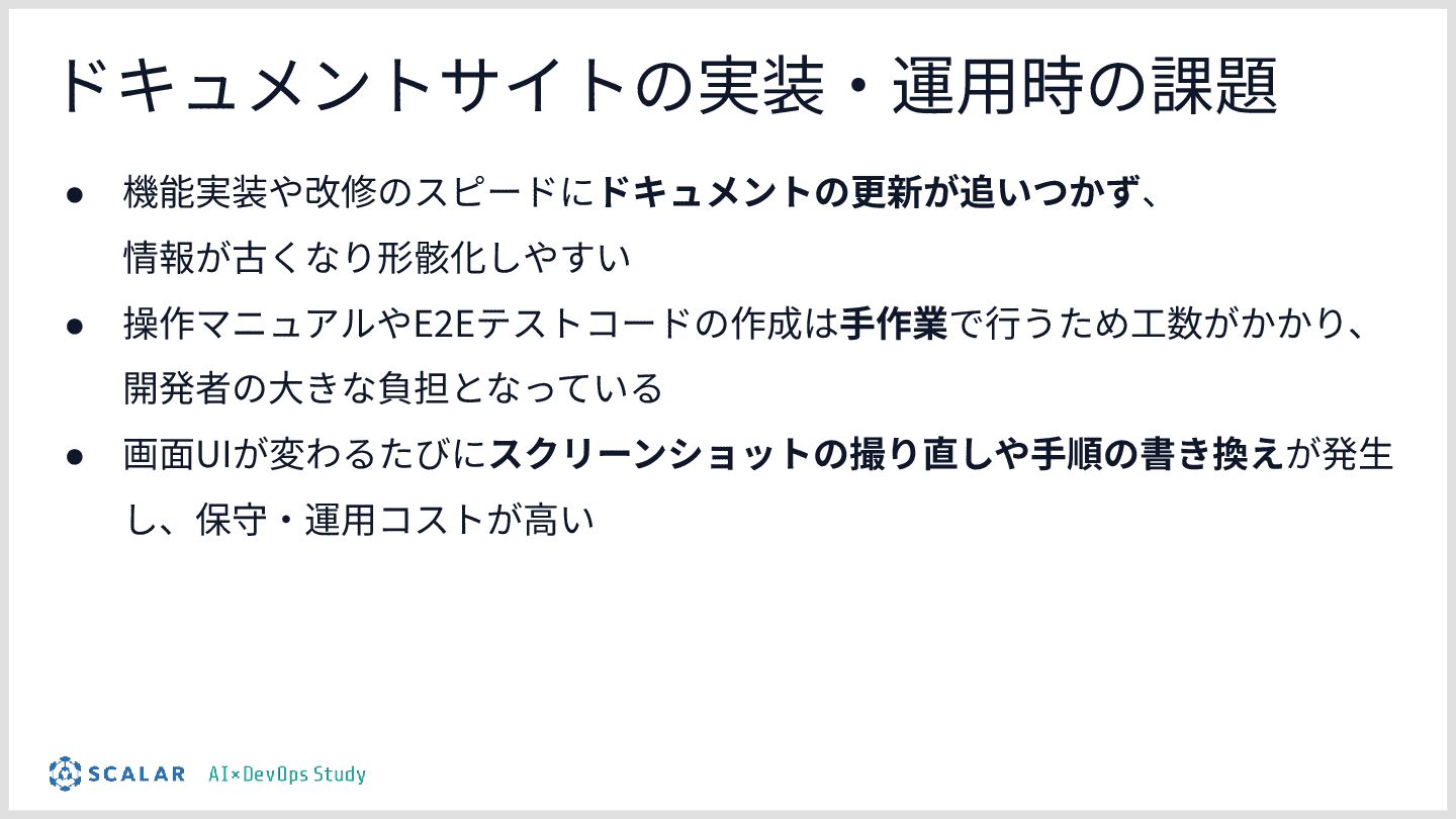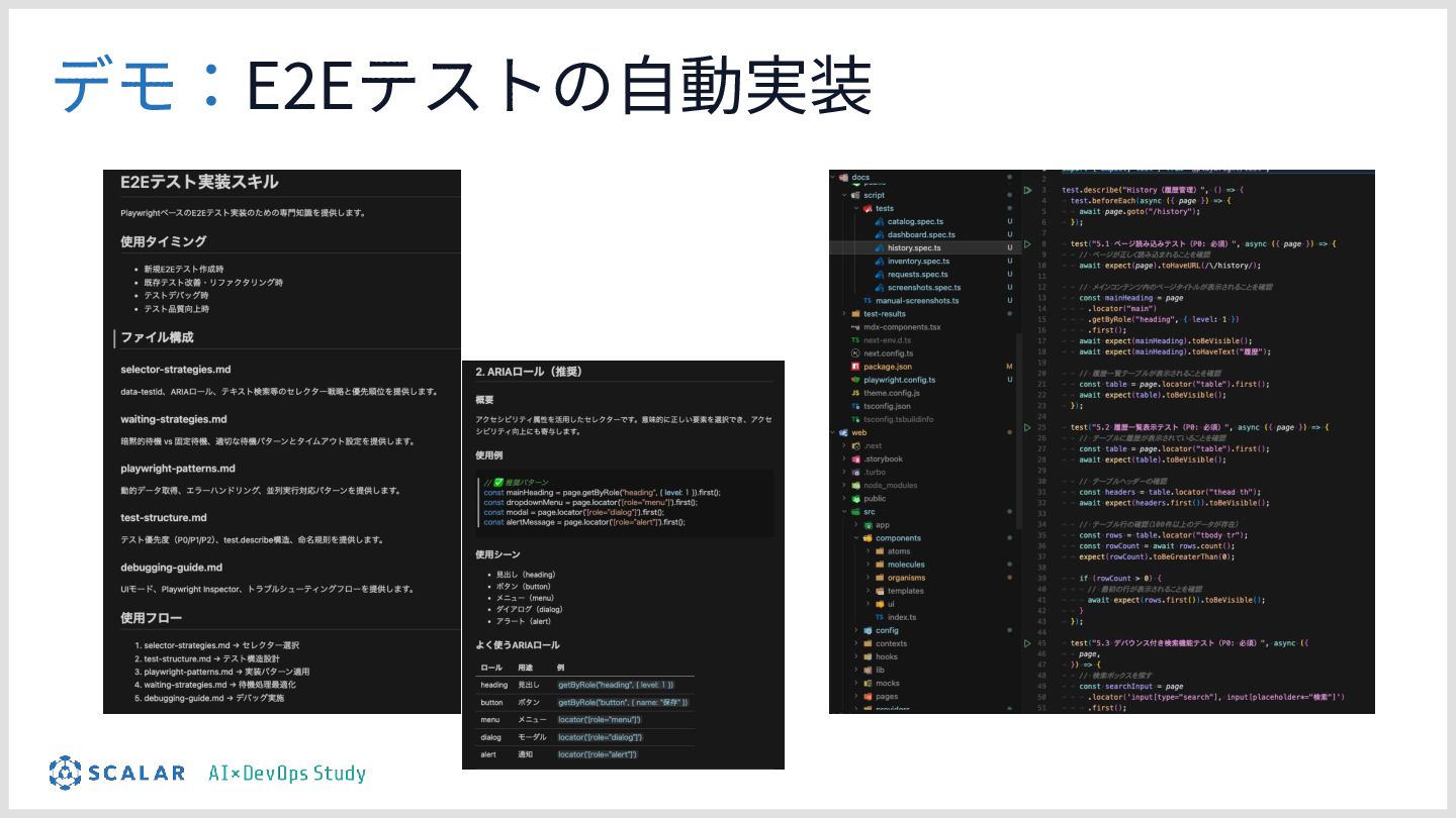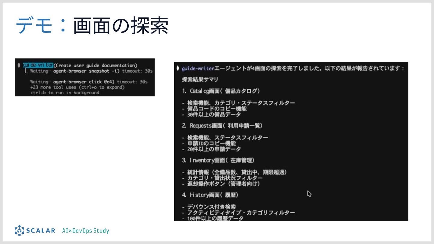 ドキュメントとテストの同期:AIエージェントがアプリケーションを探索し、E2Eテスト(Playwright)の実装、スクリーンショットの撮影、そして操作マニュアル(MDX)の執筆までを一貫して自動で行う仕組みを構築。