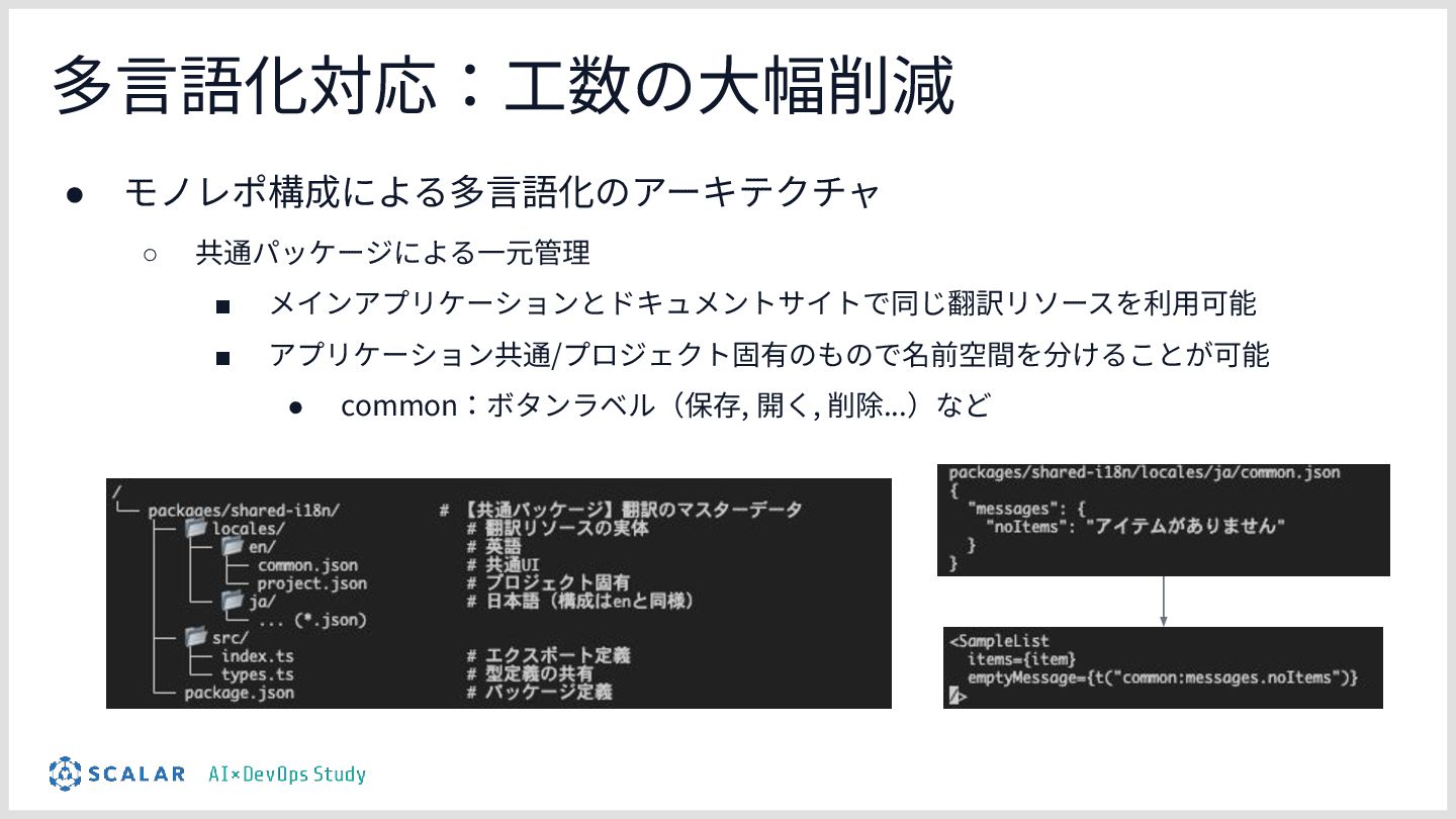 多言語化とチーム規約:モノレポ構成による翻訳リソースの一元管理で工数を削減しつつ、AI活用においては「人のレビューを怠らない」「プロンプトを疑う」といったチーム内の運用ルールを徹底することの重要性を強調。