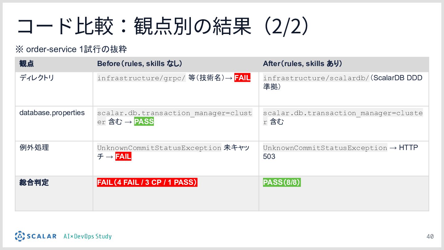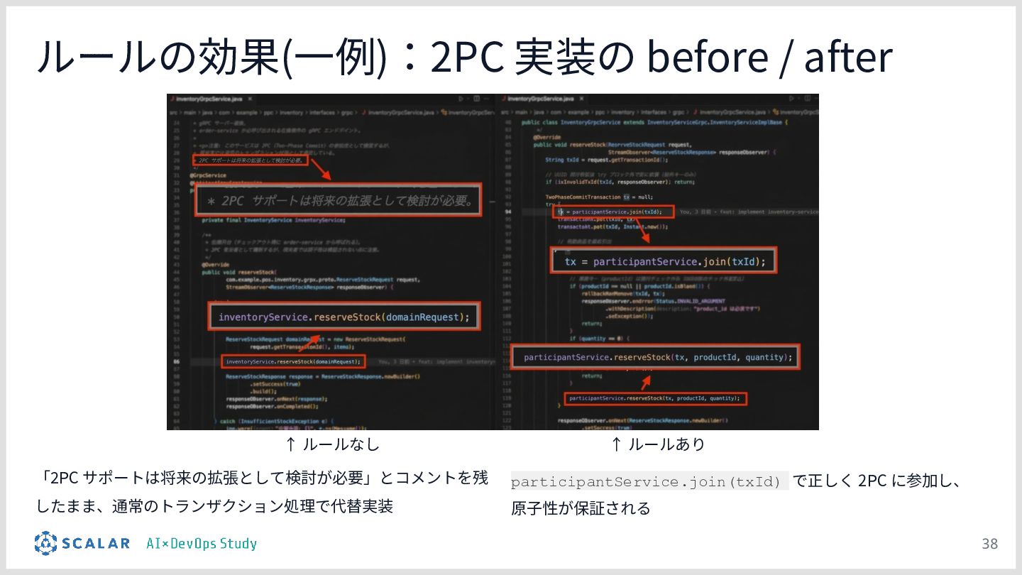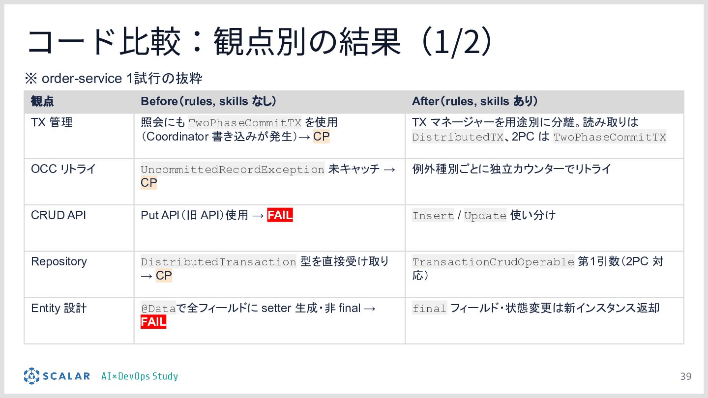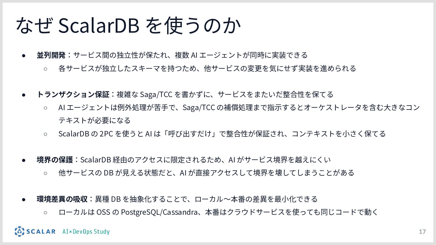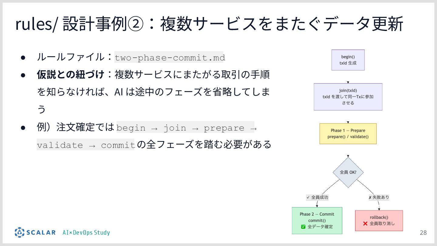 複雑な要件への対応課題:ScalarDBを用いた分散トランザクション(2PC)やマイクロサービス構成といった高度なアーキテクチャにおいて、事前のコンテキスト共有がない単なるAIへの指示出し(Vibe Coding)では、解釈のブレや規約違反が発生しやすい問題を解説します。