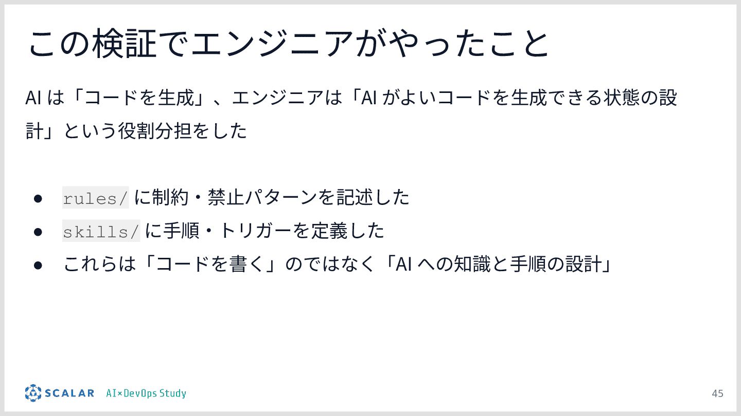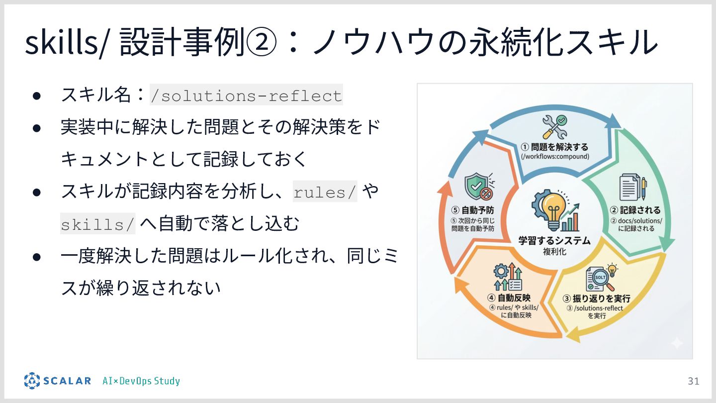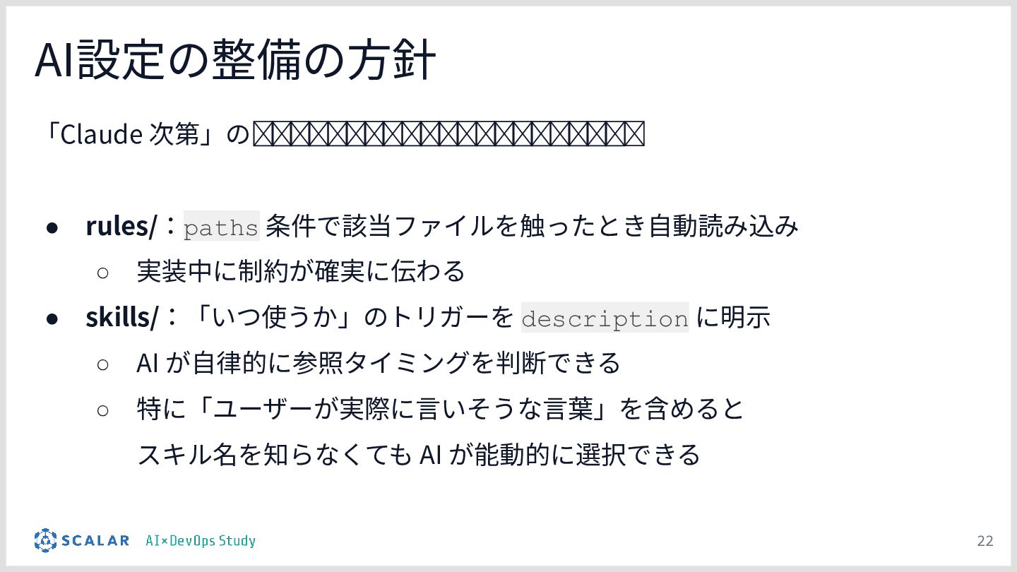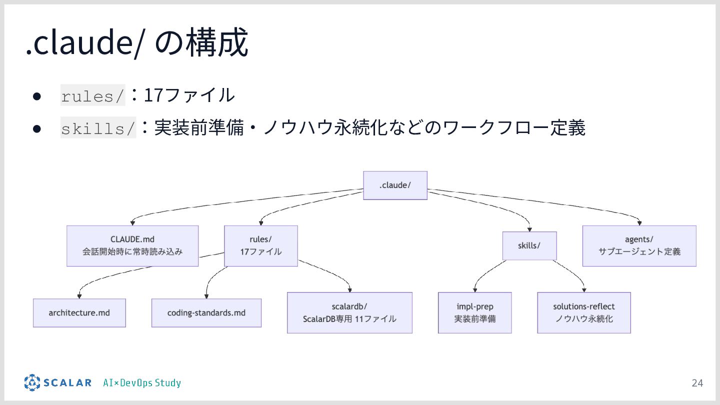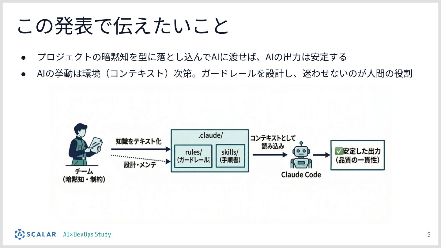 暗黙知の明文化(仮説):プロジェクトの暗黙知をClaude Codeのプロジェクト設定(.claude/)に明文化し、絶対ルール(rules/)と標準ワークフロー(skills/)を持たせる「ガードレール設計」の有効性について説明します。
