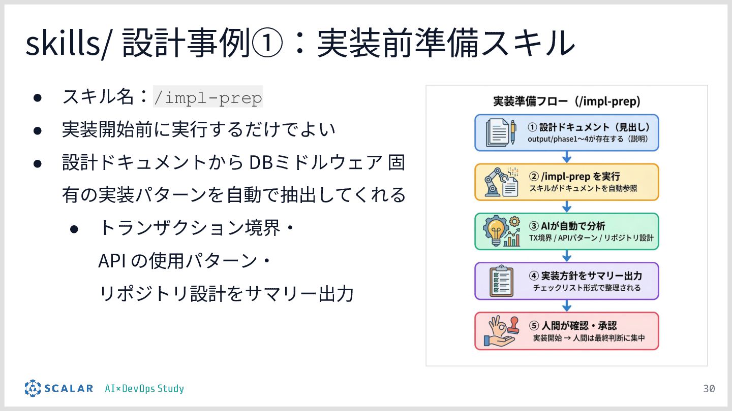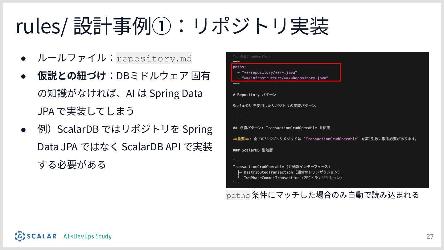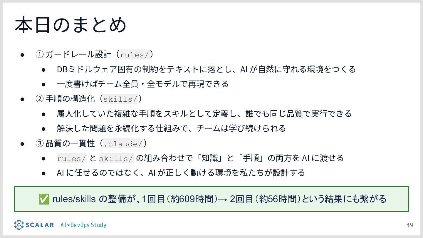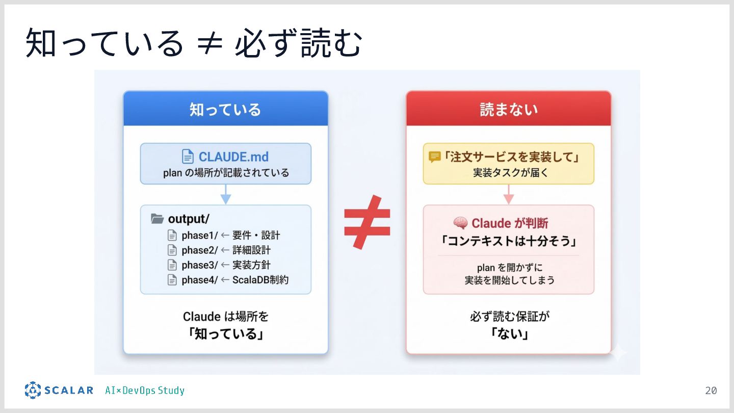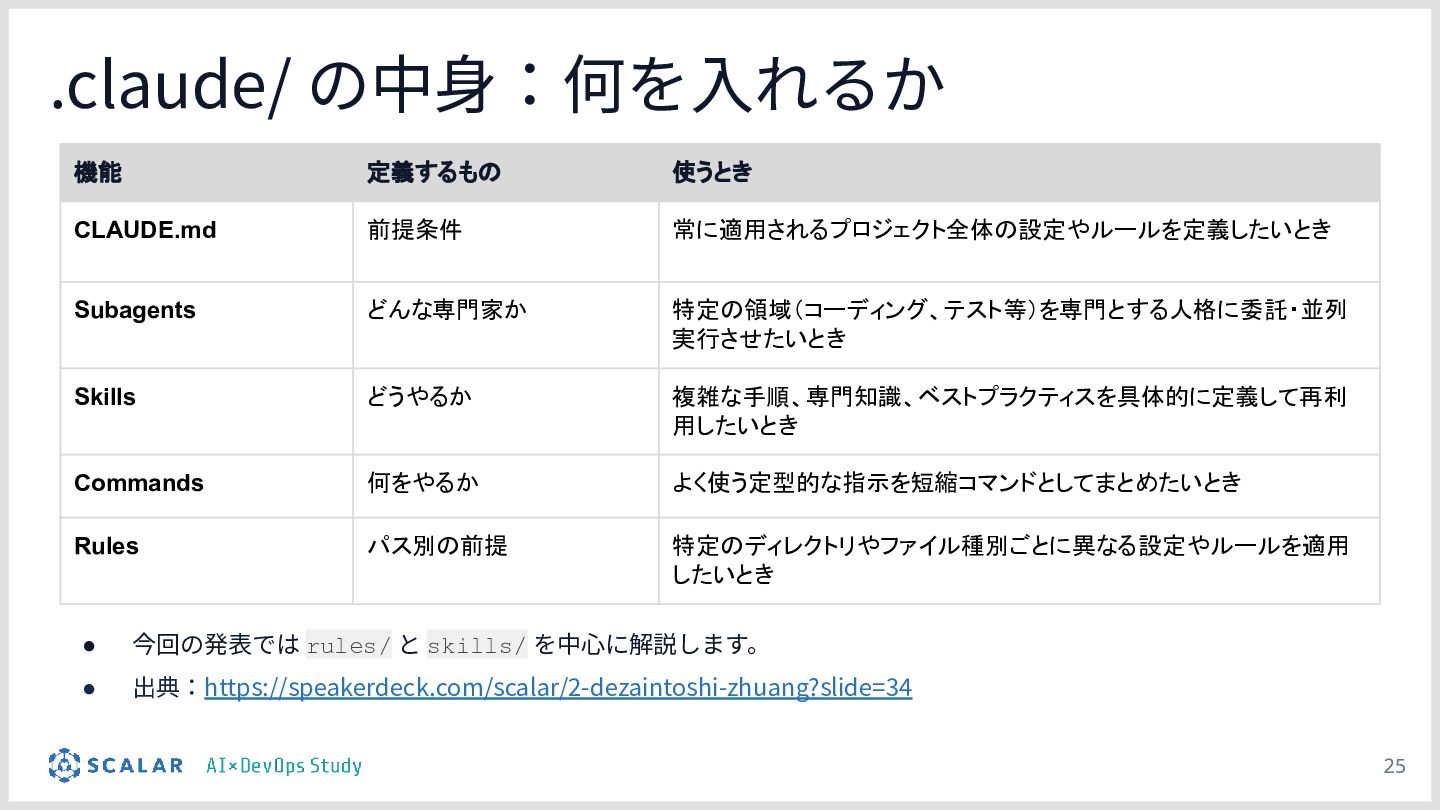 暗黙知の明文化(仮説):プロジェクトの暗黙知をClaude Codeのプロジェクト設定(.claude/)に明文化し、絶対ルール(rules/)と標準ワークフロー(skills/)を持たせる「ガードレール設計」の有効性について説明します。