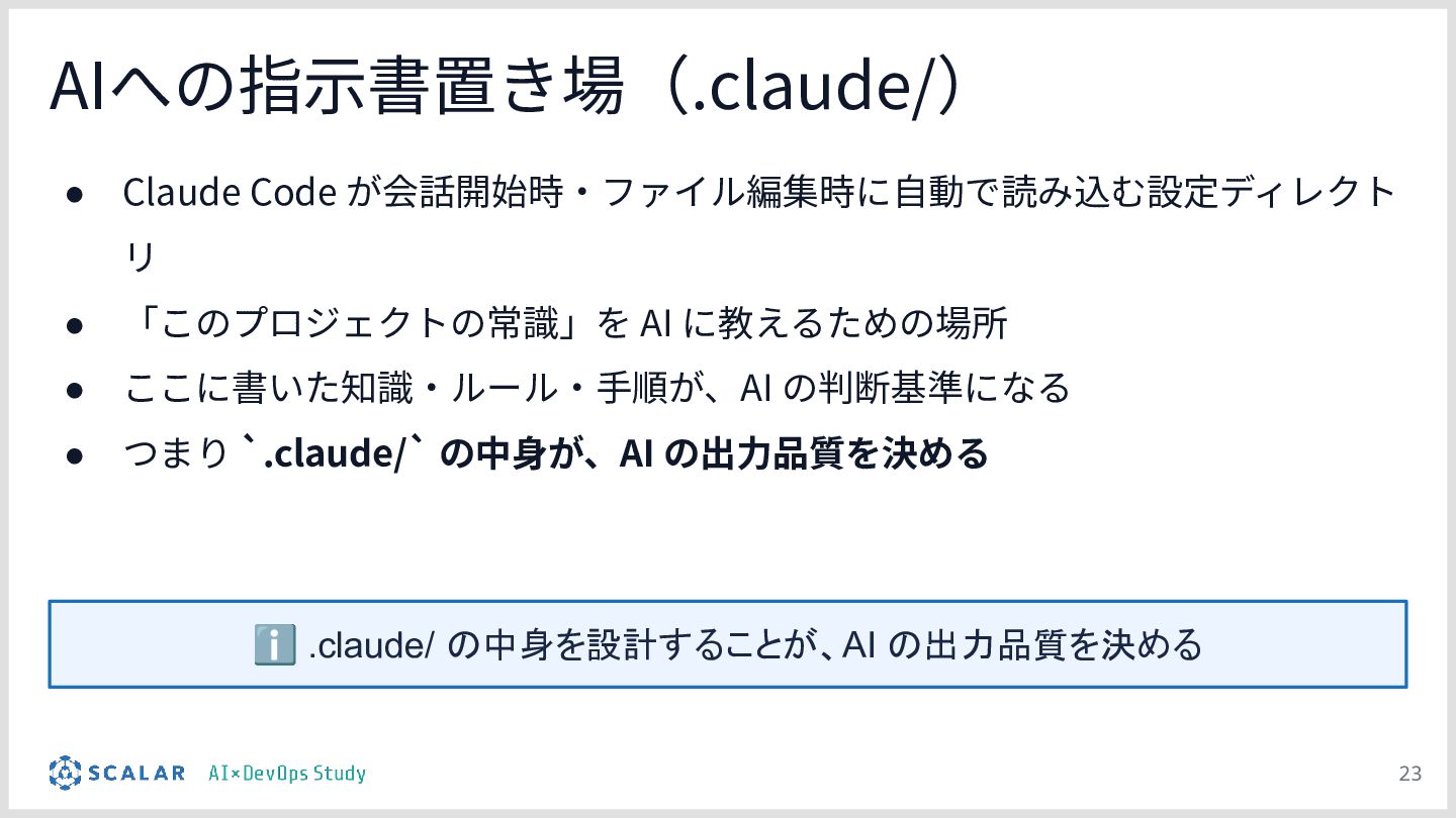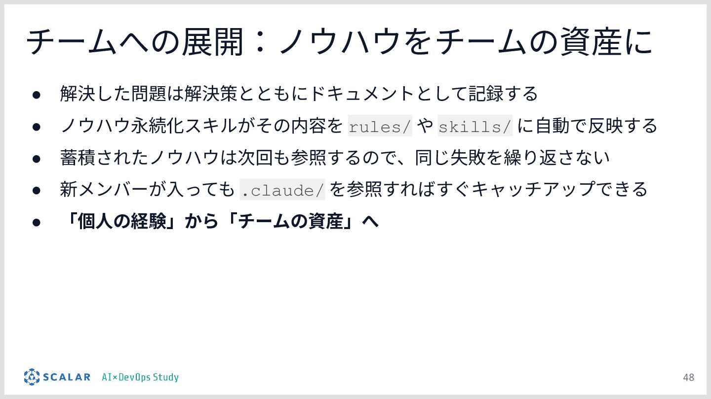 チーム資産としての運用:整備された .claude/ ディレクトリが、単なる設定ファイルを超えて「プロジェクトの資産(チームの共通言語)」として機能し、持続的な品質担保に繋がることを考察としてまとめます。