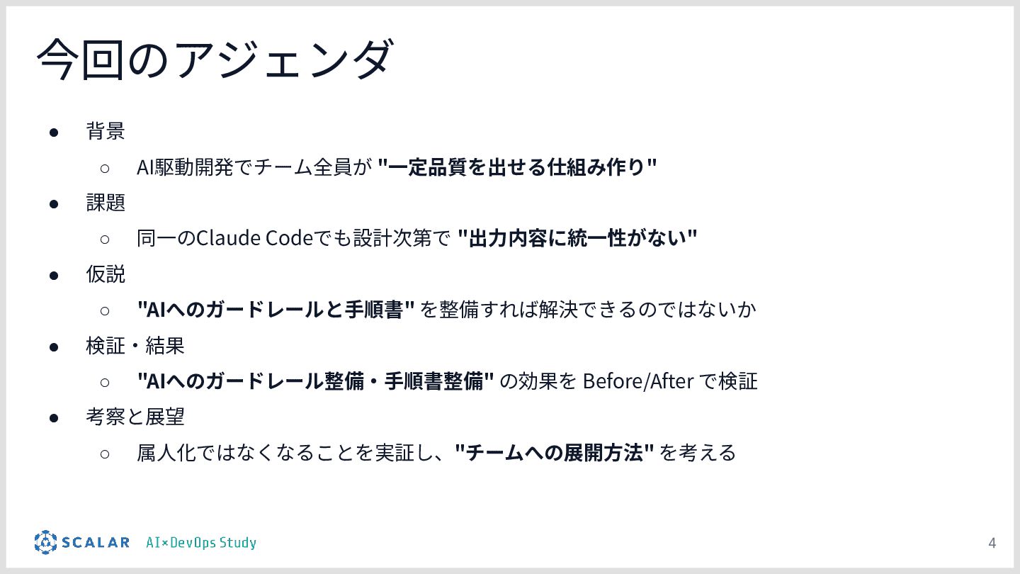 複雑な要件下でのAI駆動開発において、個人のプロンプト力に依存せず、 チーム全体で高品質なコードを安定して出力するための「エージェント設計(ガードレール構築)」に焦点を当てます。