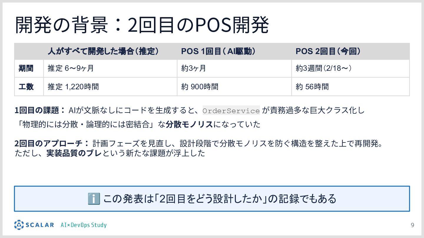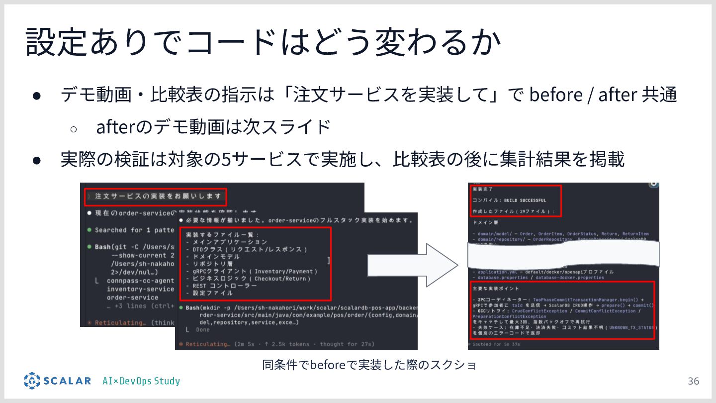差分比較デモ:POSシステム(在庫引当・決済等の注文サービス)の実装を題材に、「設定を持たないClaude Code(Before)」と「プロジェクト設計を反映したClaude Code(After)」に対して同一の指示を出し、出力を比較します。