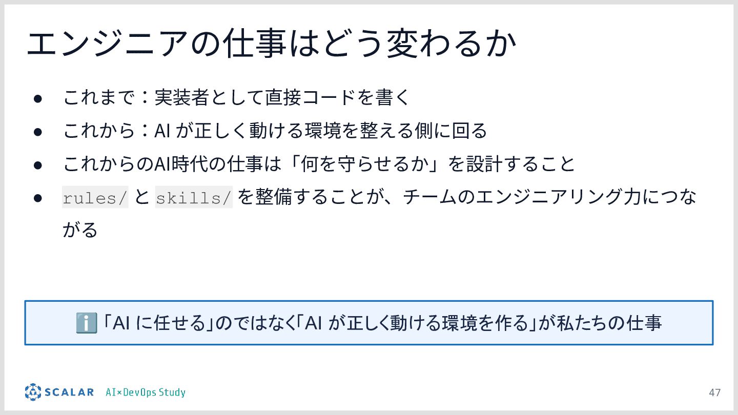 新しい開発スタイル:AIを単なる「実行役」とし、人間は「コンテキストとガードレールの設計」に責任を持つという、これからのエンジニアの役割のシフトと、チーム全員が一定品質を出せる仕組み作りについて提示します。
