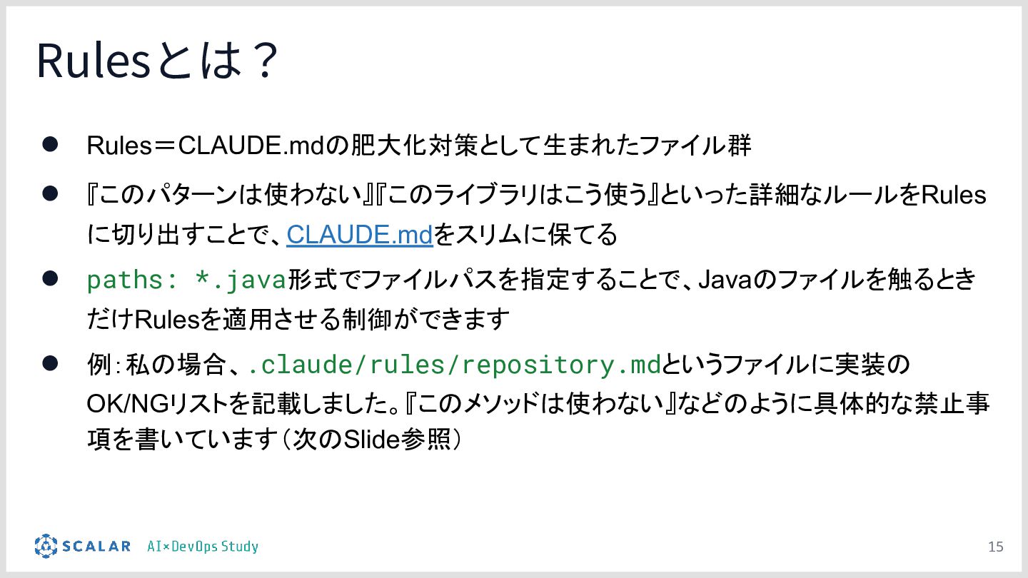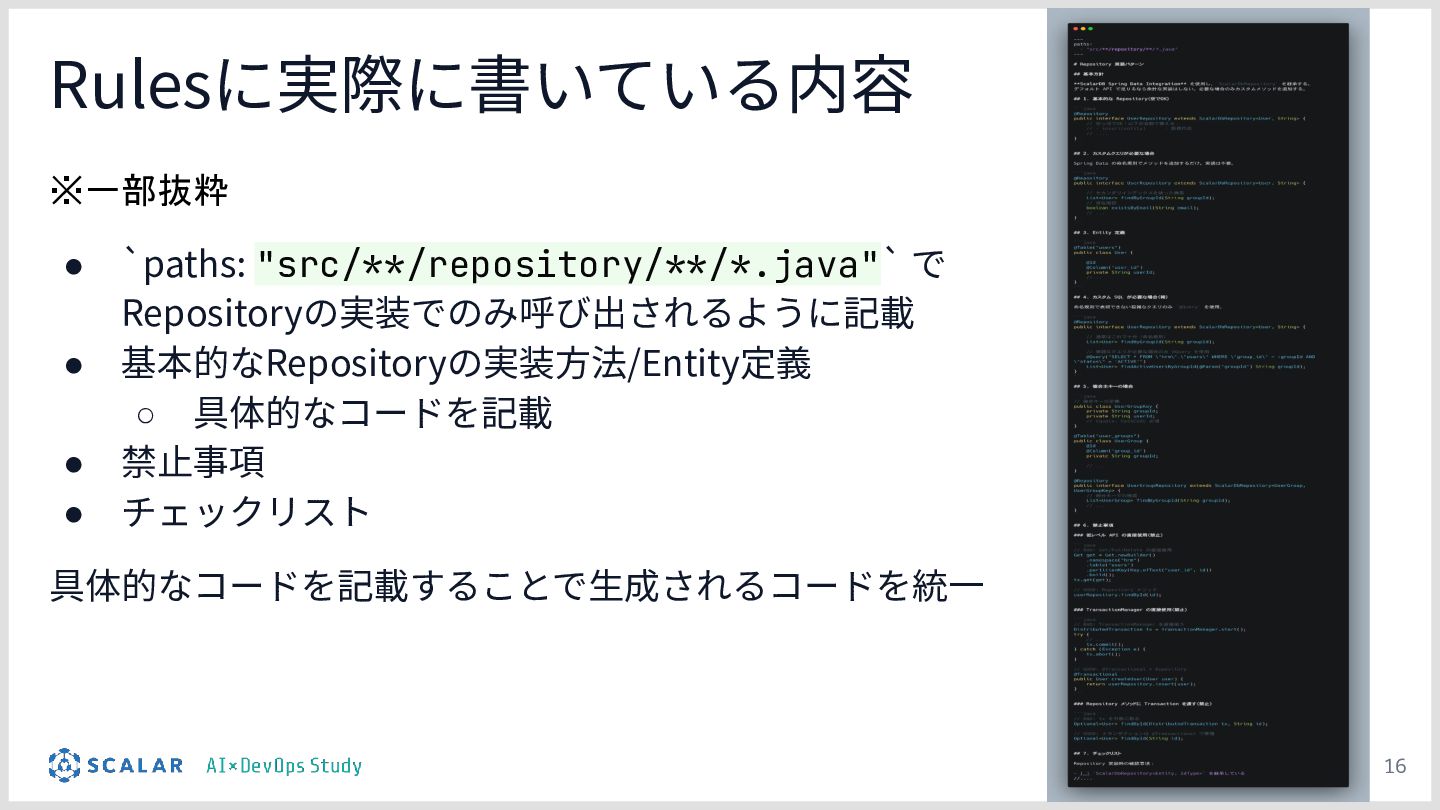 1についてはFE・BEそれぞれの実装規約をRulesとして定義することで、担当領域外の知識がなくても画面からAPIまで一気通貫で実装できる環境を実現、2についてはJava 21・Spring Bootの使用規約をSKILLsおよびRulesとして定義することで、AIが生成するコードの品質を安定させました。