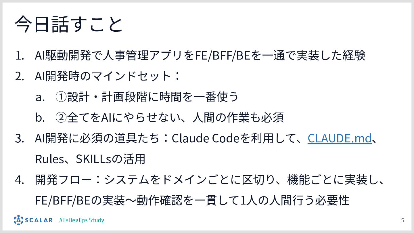 Claude Codeを活用し、人事管理アプリをJavaやSpring Boot、Next.jsで実装しました。AI駆動開発時の重要な点として、