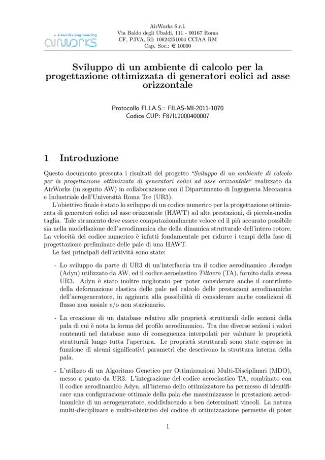 CF, P.IVA, RI: 10624251004 CCIAA RM Cap. Soc.: e 10000 References [1] Hodges, D.H., Ormiston, R.A., “Stability of Elastic Bending and Torsion of Uniform Cantilever Rotor Blades in Hover with Variable Structural Coupling,” NASA TN D- 8192, April 1976. [2] Hodges D.H., Dowell E., “Nonlinear equation of motion for the elastic bending and torsion of twisted non uniform rotor blades,” December 1974 , NASA Technical Report D7818 [3] Molica Colella M. (2010), “Risposta e Stabilita’ di Velivoli Tiltrotor,” PhD Thesis (in italian) , University Roma Tre, Rome, Italy [4] G. Bernardini, C. Testa, M. Gennaretti, Optimal Design of Tonal Noise Control Inside Smart-Stiffened Cylindrical Shells, Journal of Vibration and Control, Vol. 18, No. 8, SAGE (2012), pp. 1233-1246. [5] D. Calcagni, G. Bernardini, F. Salvatore, Automated Marine Propeller Optimal De- sign Combining Hydrodynamics Models and Neural Networks, Proceedings of 11th In- ternational Conference on Computer Applications and Information Technology in the Maritime Industries, Liege, Belgium, 2012 April 16-18, Venice (2011). [6] J.H. Holland, Adaptation in Nature and Artificial Systems, University of Michigan Press, Ann Arbor (1975). [7] R.E. Smith, E. Smuda, Adaptively Resizing Populations: Algorithm, Analysis, and First Results, Complex Systems, Vol. 9, No. 1, Complex Systems Publications, Inc. (1995), pp. 47-72. [8] D.E. Goldberg, Optimal Initial Population Size for Binary-Coded Genetic Algorithms, (TCGA Report No. 85001). University of Alabama, Tuscaloosa, Ala. : Clearinghouse for Genetic Algorithms, Dept. of Engineering Mechanics, Tuscaloosa (1985). [9] R.T. Hatfka, Z. Gurdal, Element of Structural Optimization, Kluwer Academic Pub- lishers, Dordrecht (1992). [10] G. Rudolph, Evolutionary Search Under Partially Ordered Sets, (Tech. Rep. CI- 67/99) Univ. Dortmund, Dept. Comput. Sci./LS11, Dortmund (1999). [11] E. Zitzler, K. Deb, L. Thiele, Comparison of Multiobjective Evolutionary Algorithms: Empirical Results, Evol. Comput., Vol. 8, No. 2, PubMed (2000), pp. 173-195. [12] D.P. Raymer, Enhancing Aircraft Conceptual Design Using Multidisciplinary Opti- mization, PhD Thesis, Royal Institute of Technology, Stockholm (2002). 29