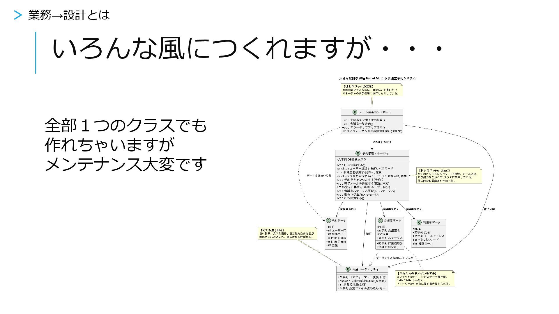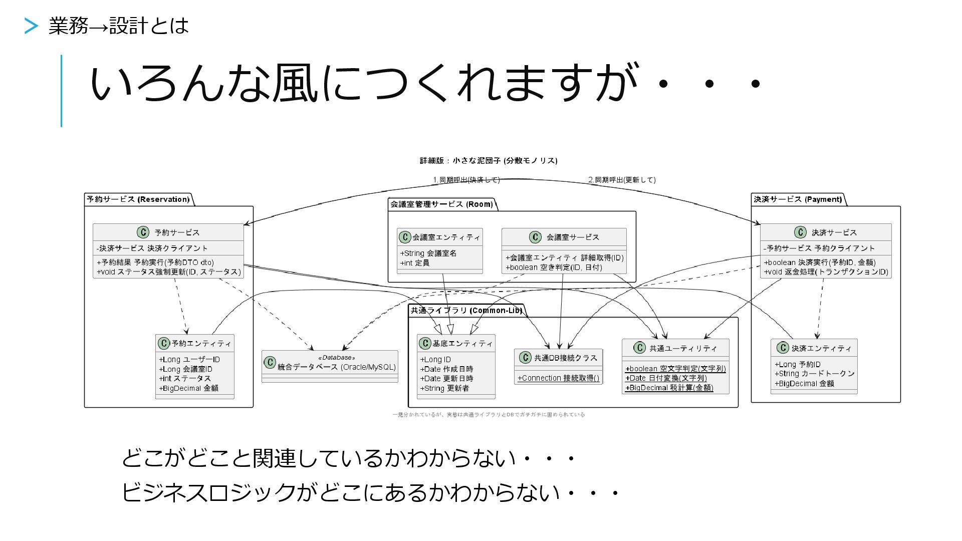 いろんな風につくれますが・・・ どこがどこと関連しているかわからない・・・ ビジネスロジックがどこにあるかわからない・・・ > 業務→設計とは