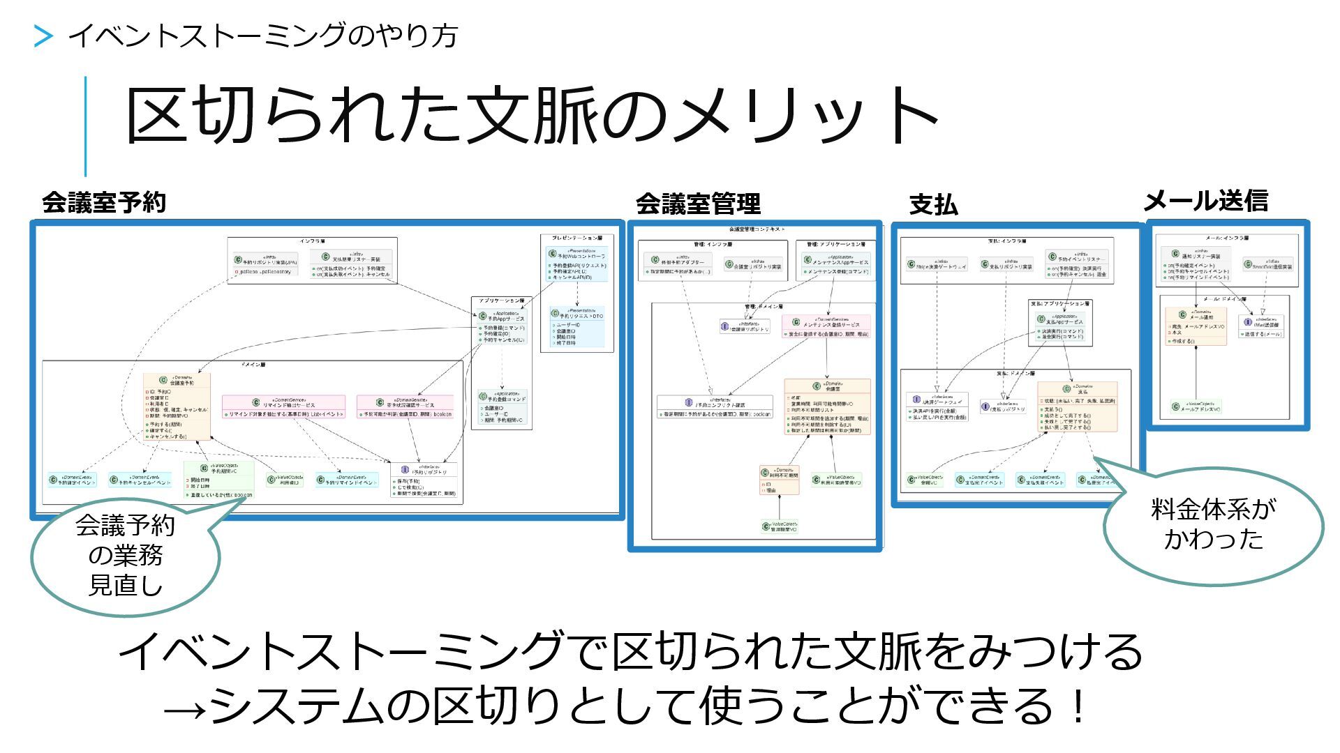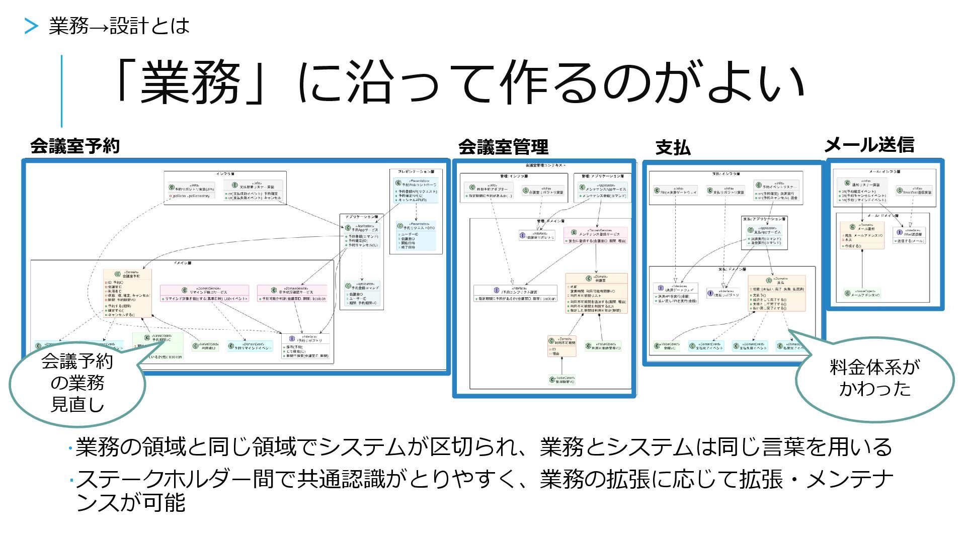 「業務」に沿って作るのがよい ·業務の領域と同じ領域でシステムが区切られ、業務とシステムは同じ言葉を用いる ·ステークホルダー間で共通認識がとりやすく、業務の拡張に応じて拡張・メンテナ ンスが可能 会議室予約 支払 メール送信 会議室管理 料金体系が かわった