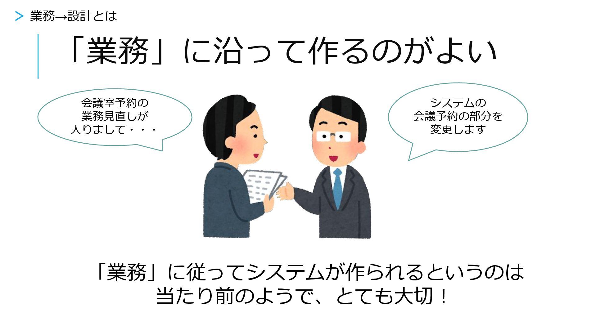 「業務」に沿って作るのがよい 「業務」に従ってシステムが作られるというのは 当たり前のようで、とても大切! 会議室予約の 業務見直しが 入りまして・・・ システムの 会議予約の部分を 変更します >