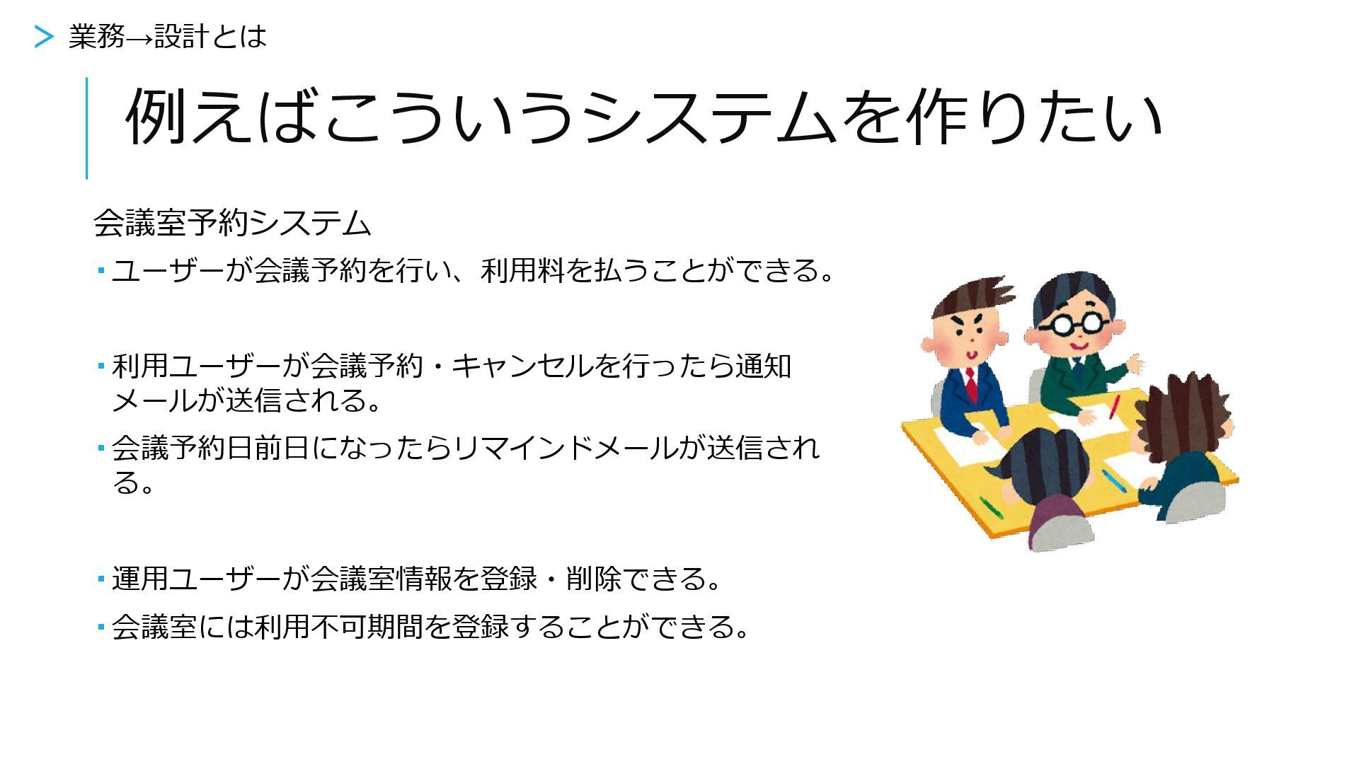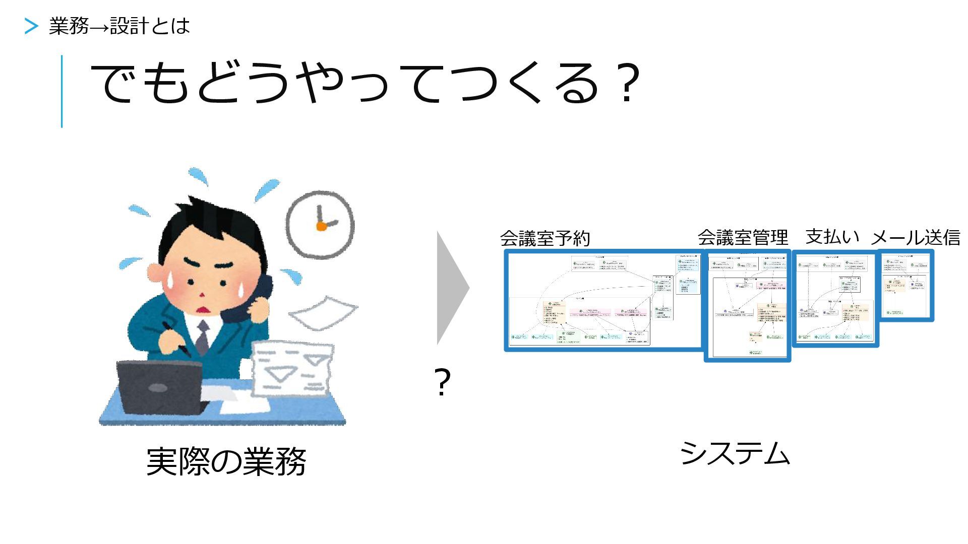 でもどうやってつくる? ? > 業務→設計とは 実際の業務 システム 会議室予約 支払い メール送信 会議室管理