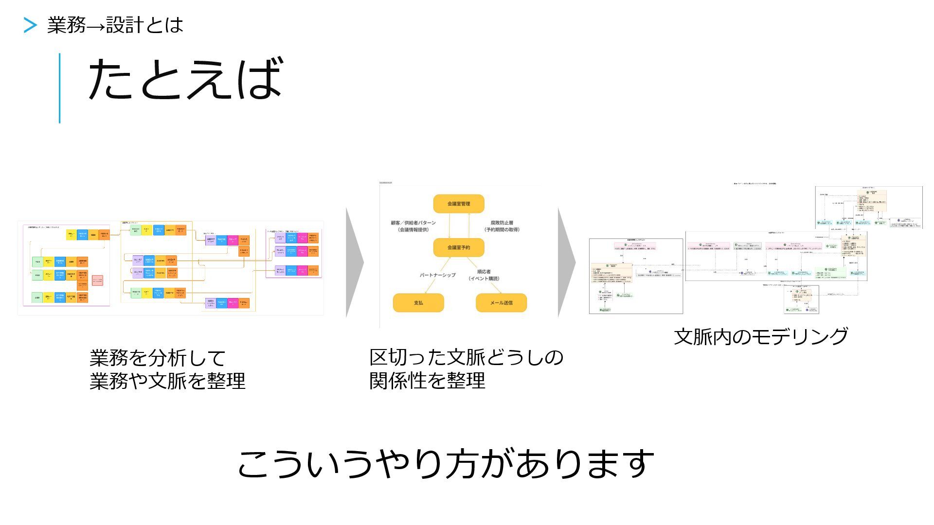 たとえば 業務を分析して 業務や文脈を整理 区切った文脈どうしの 関係性を整理 文脈内のモデリング こういうやり方があります > 業務→設計とは