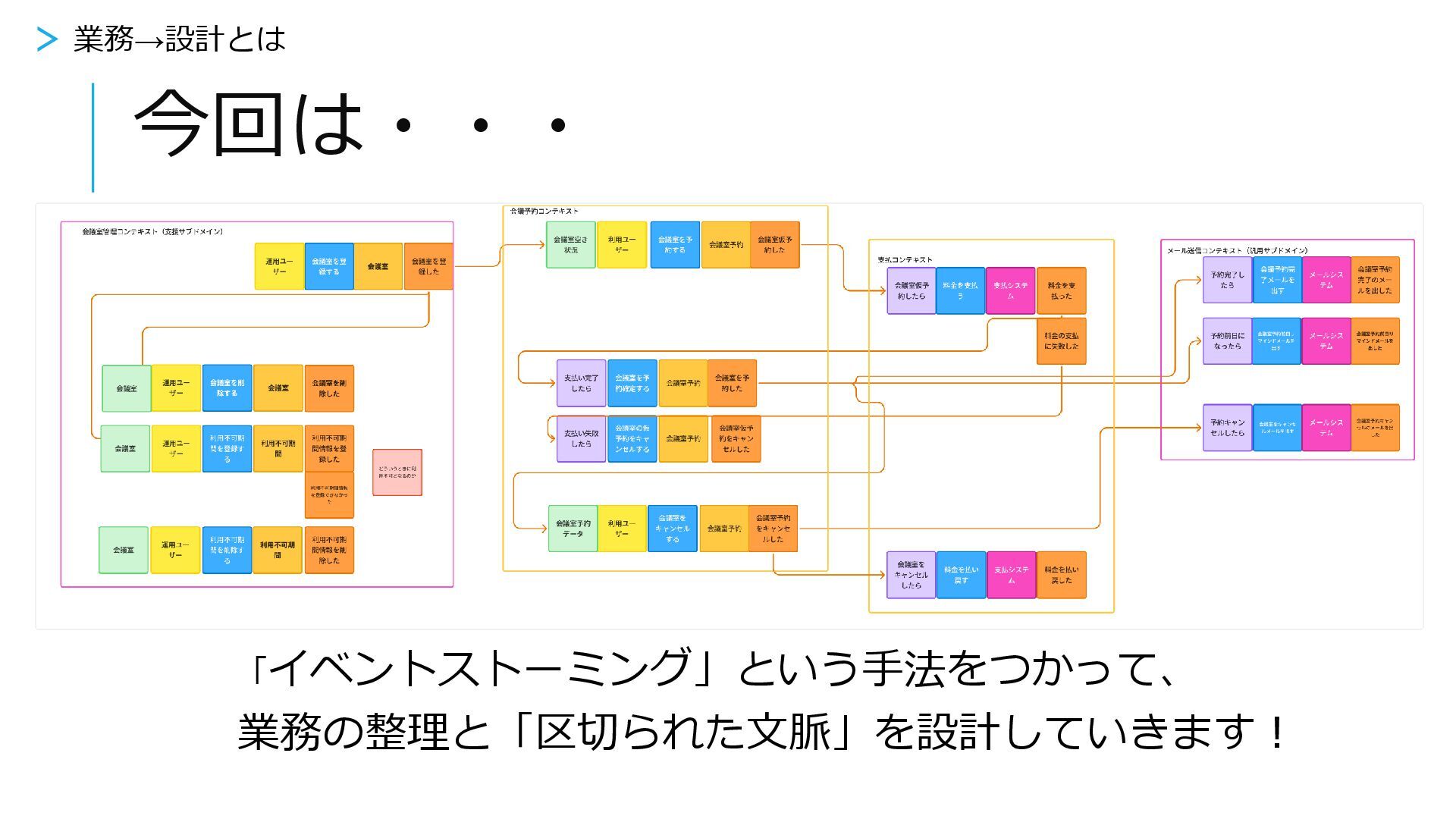今回は・・・ 「イベントストーミング」という手法をつかって、 業務の整理と「区切られた文脈」を設計していきます! > 業務→設計とは