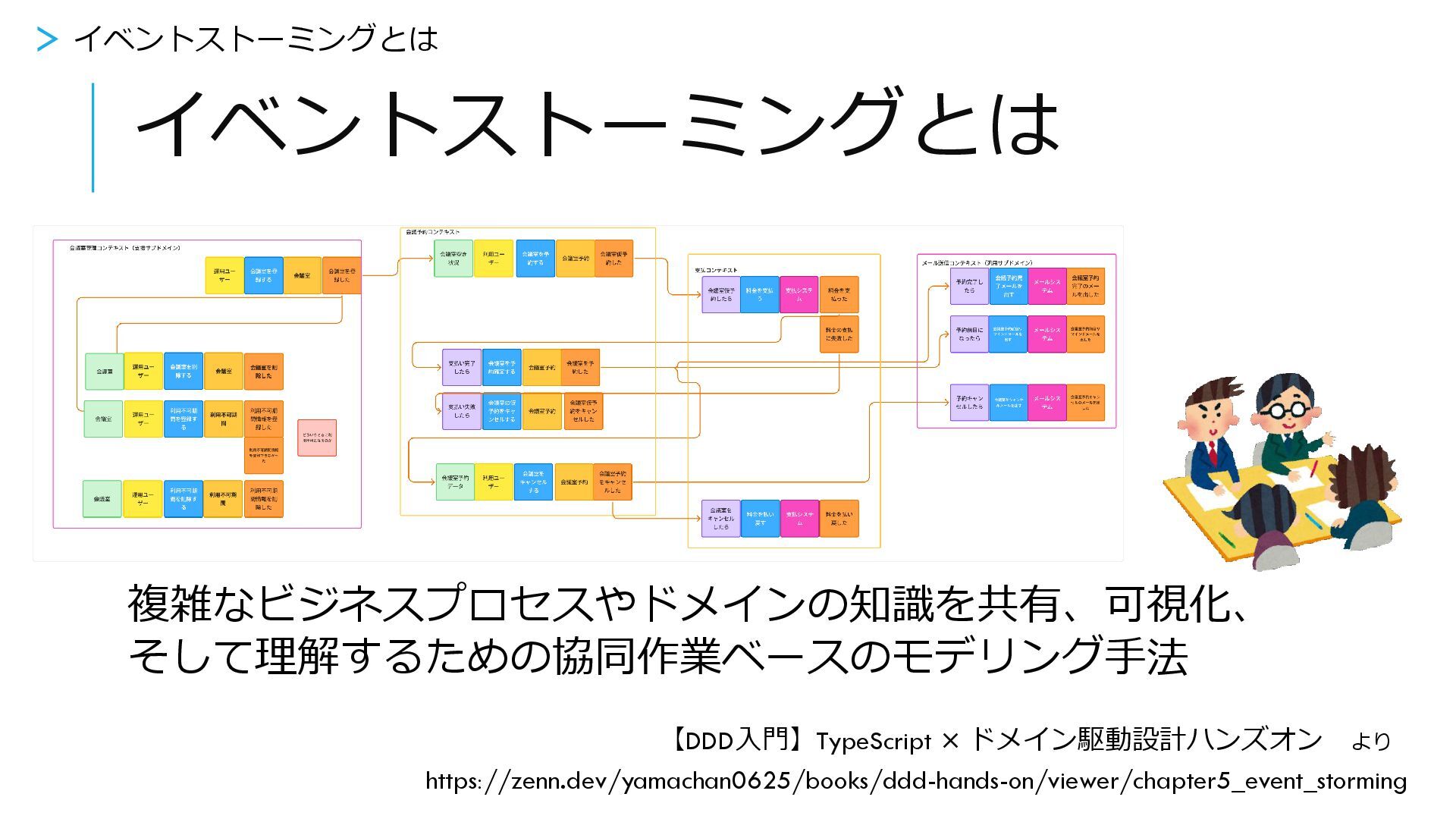 イベントストーミングとは 複雑なビジネスプロセスやドメインの知識を共有、可視化、 そして理解するための協同作業ベースのモデリング手法 > イベントストーミングとは https://zenn.dev/yamachan0625/books/ddd-hands-on/viewer/chapter5_event_storming 【DDD入門】TypeScript × ドメイン駆動設計ハンズオン より