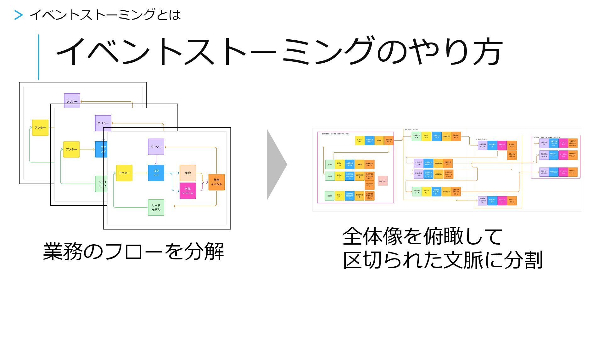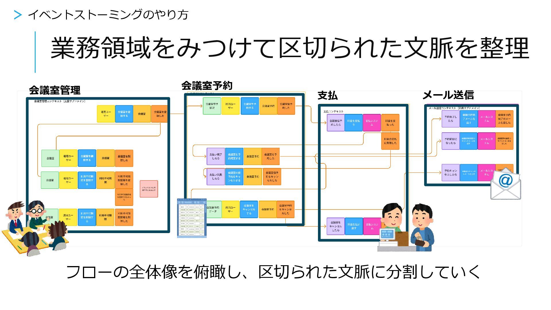 イベントストーミングのやり方 > イベントストーミングとは 業務のフローを分解 全体像を俯瞰して 区切られた文脈に分割