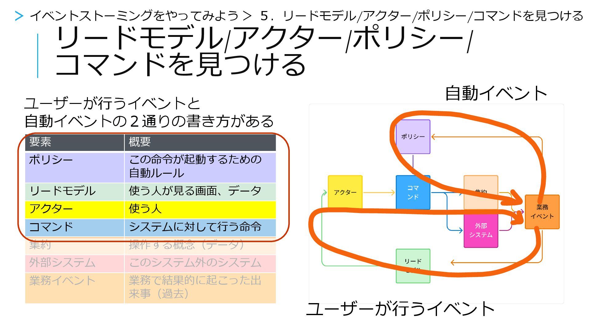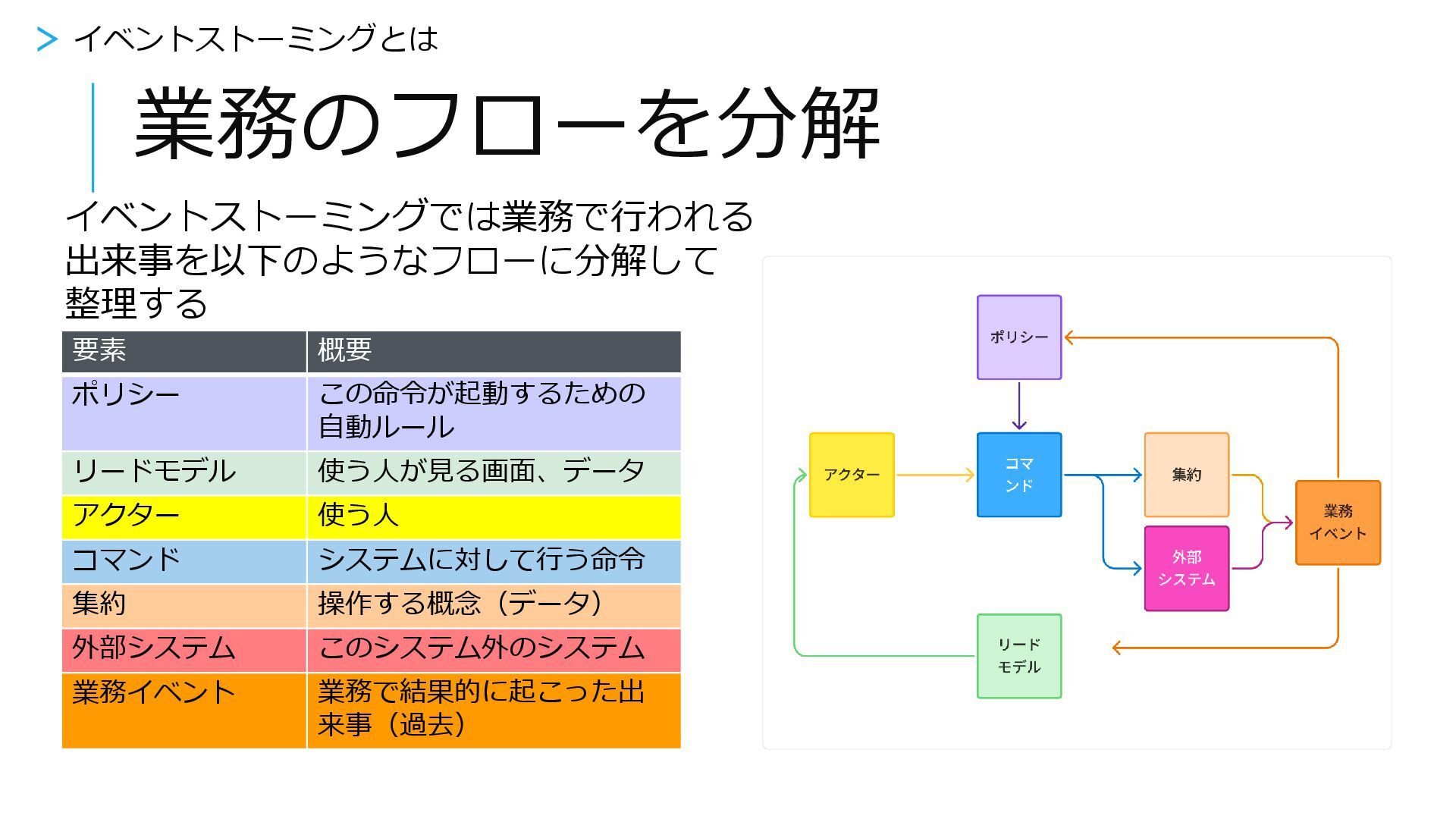 ユーザーが行うイベント 【業務イベント】 業務で起こった 出来事(過去) 【リードモデル】 使う人が見る画面、 データ 【アクター】 使う人 【コマンド】
