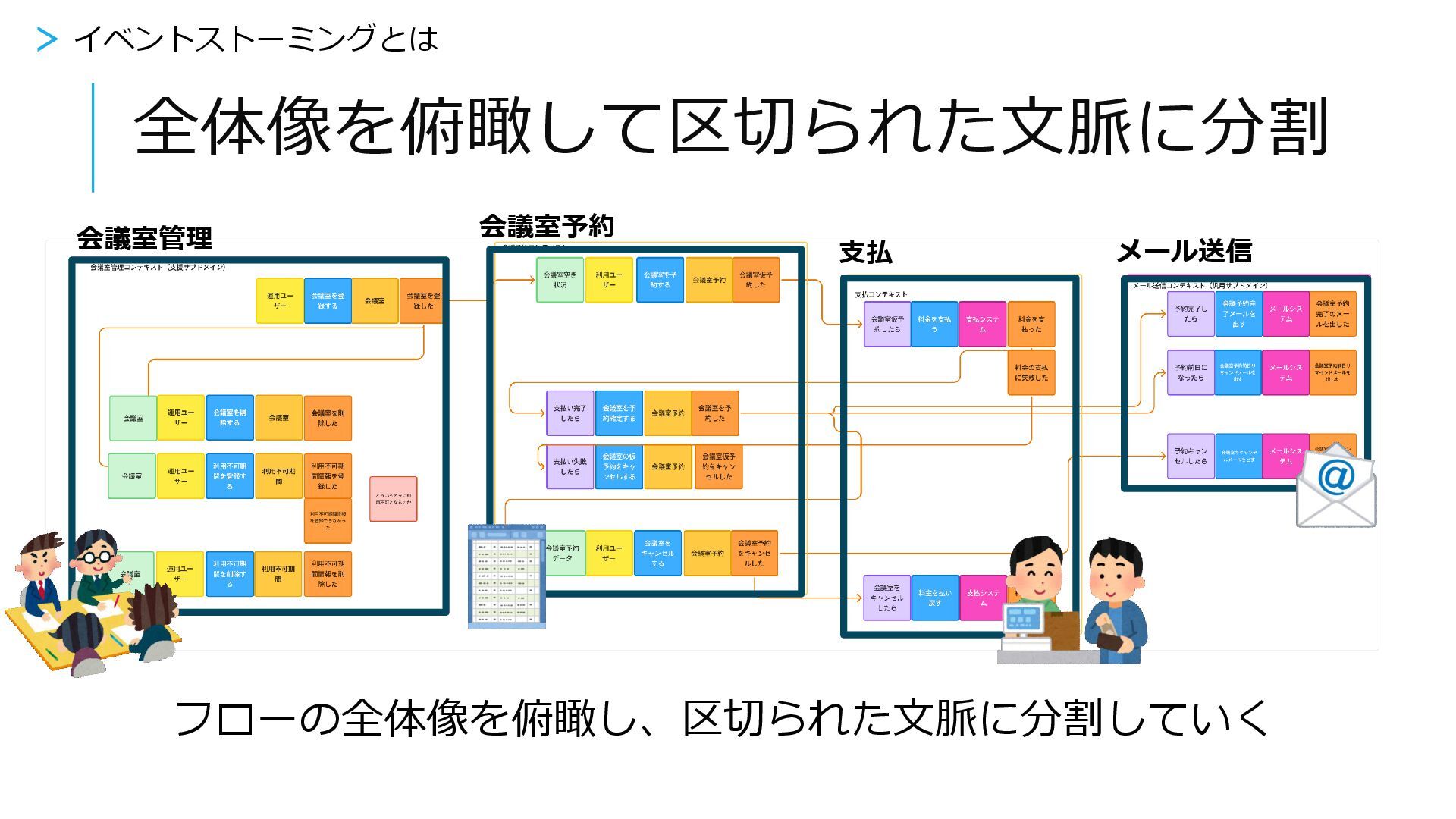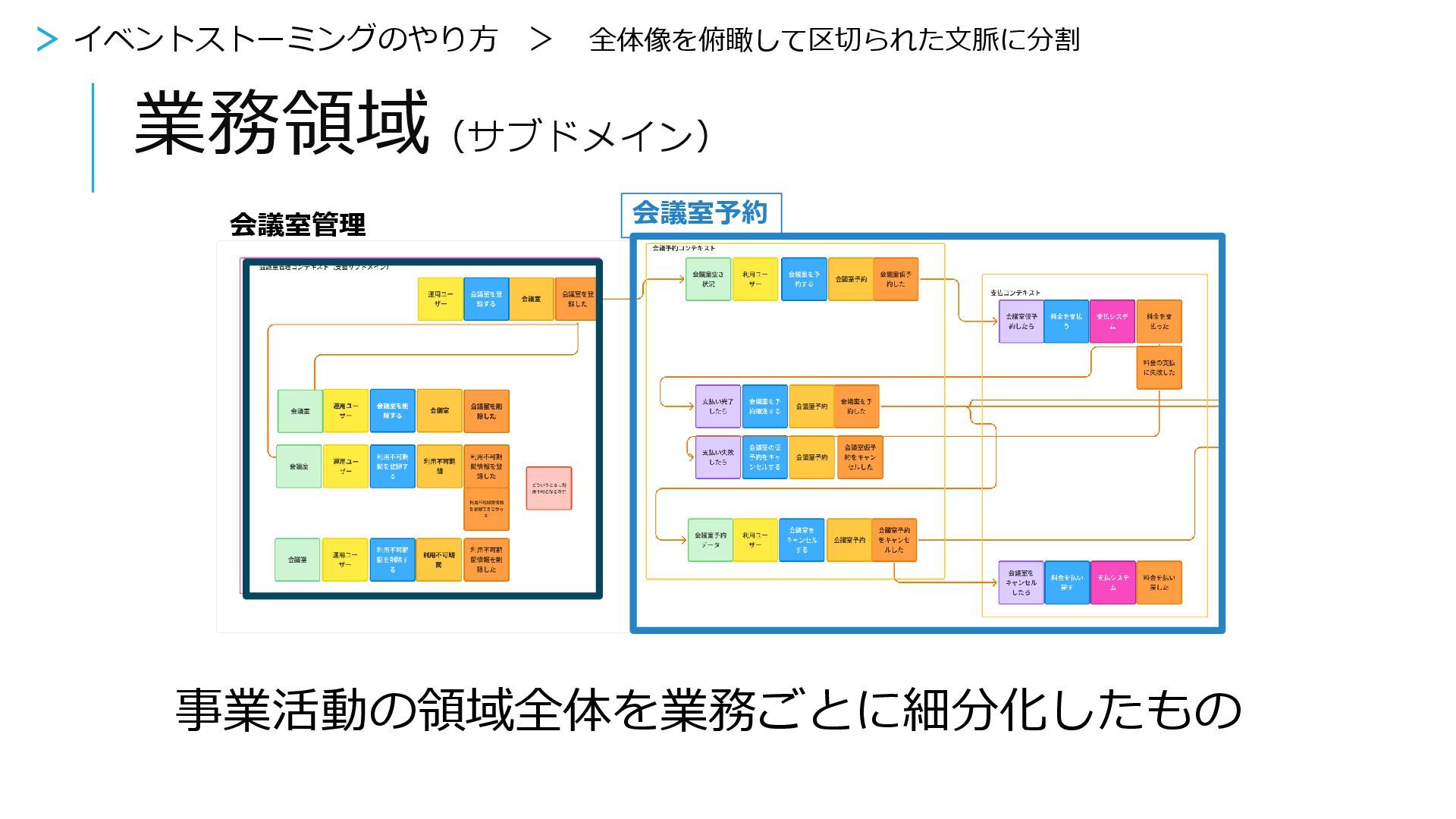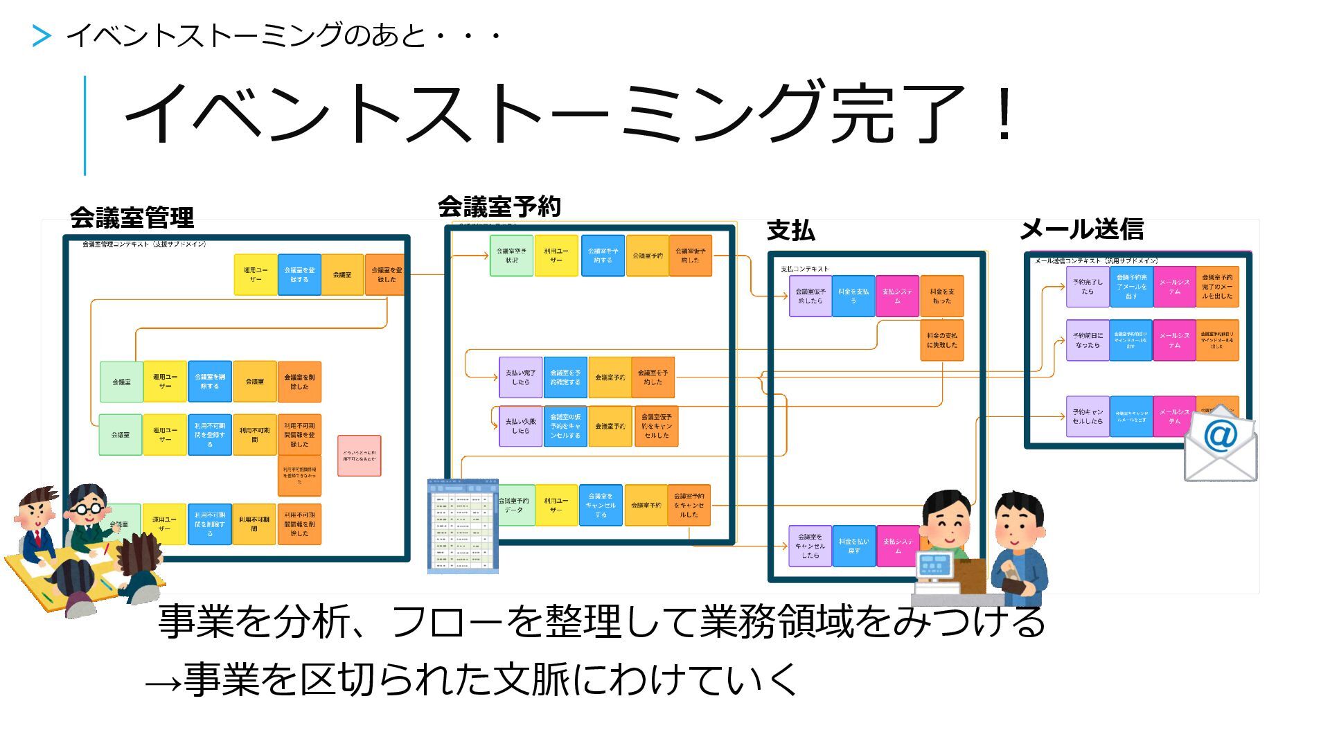 イベントストーミング完了! 事業を分析、フローを整理して業務領域をみつける →事業を区切られた文脈にわけていく > イベントストーミングのあと・・・ 支払 会議室管理 会議室予約 メール送信