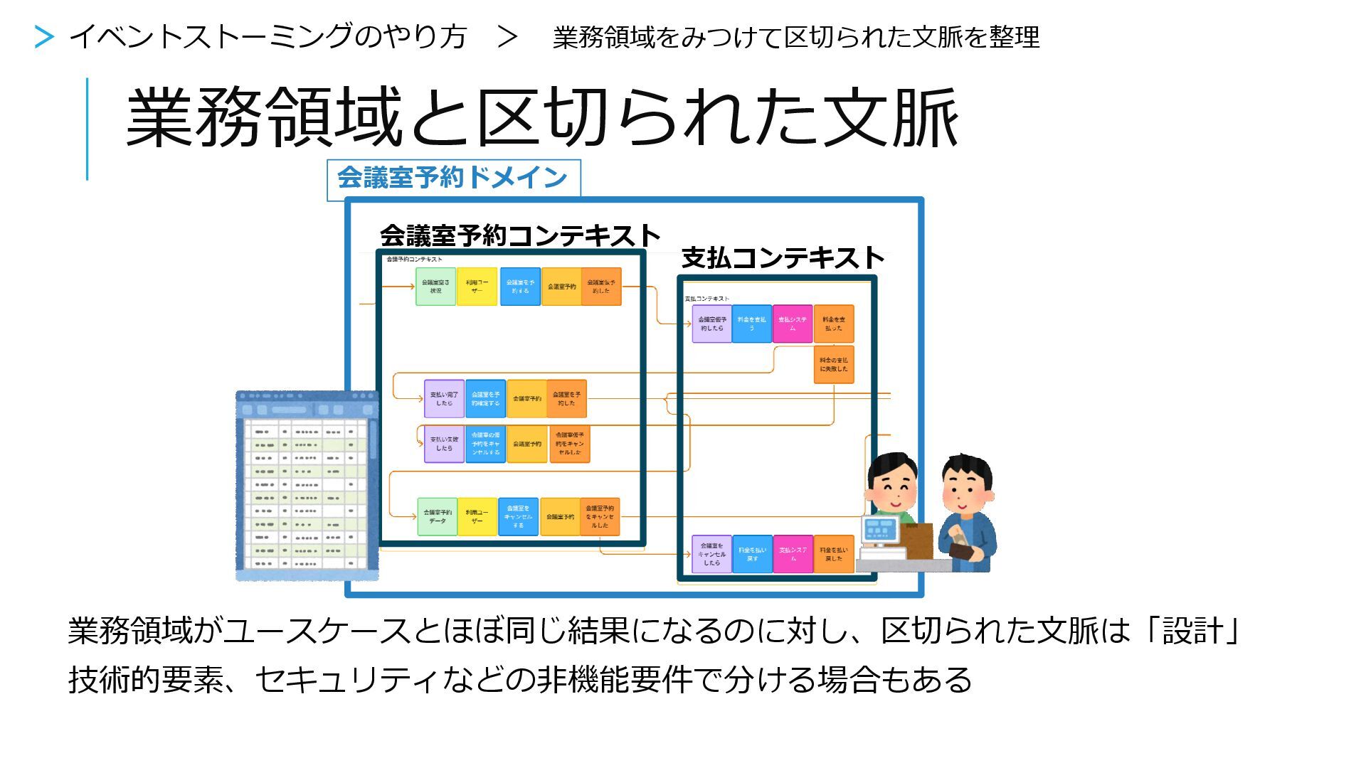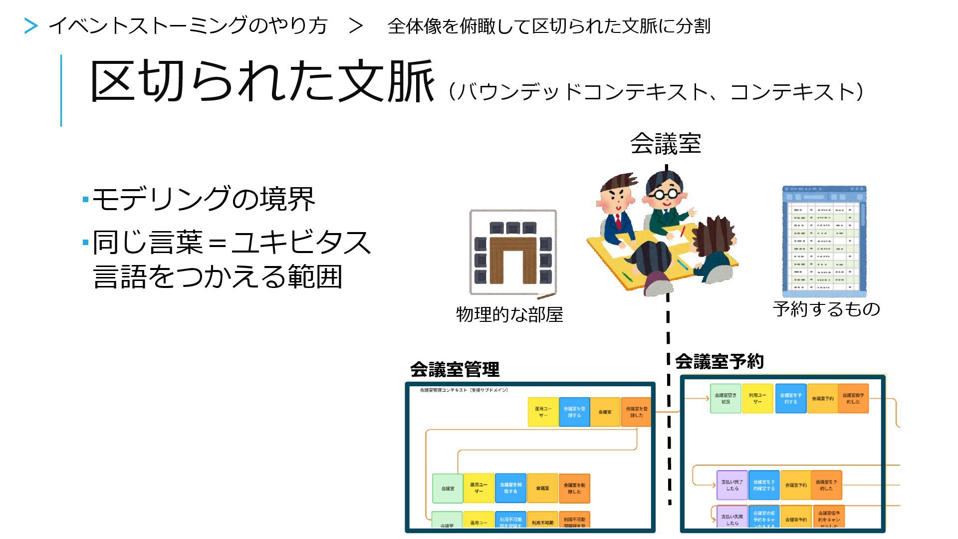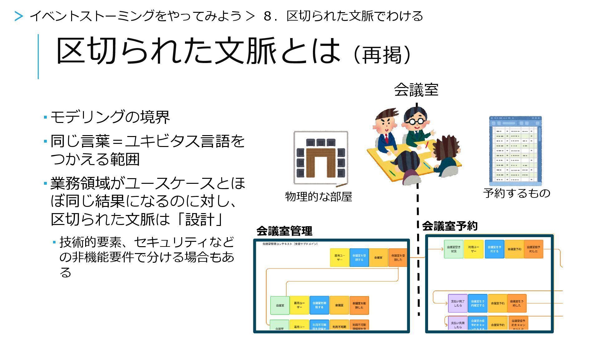 区切られた文脈は「設計」 技術的要素、セキュリティなど の非機能要件で分ける場合もあ る 予約するもの 物理的な部屋 会議室 区切られた文脈とは(再掲) > イベントストーミングをやってみよう > 8.区切られた文脈でわける