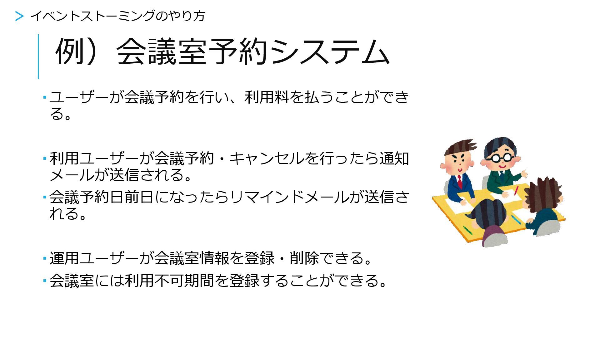 例えばこういうシステムを作りたい 会議室予約システム ユーザーが会議予約を行い、利用料を払うことができる。 利用ユーザーが会議予約・キャンセルを行ったら通知 メールが送信される。 会議予約日前日になったらリマインドメールが送信され る。