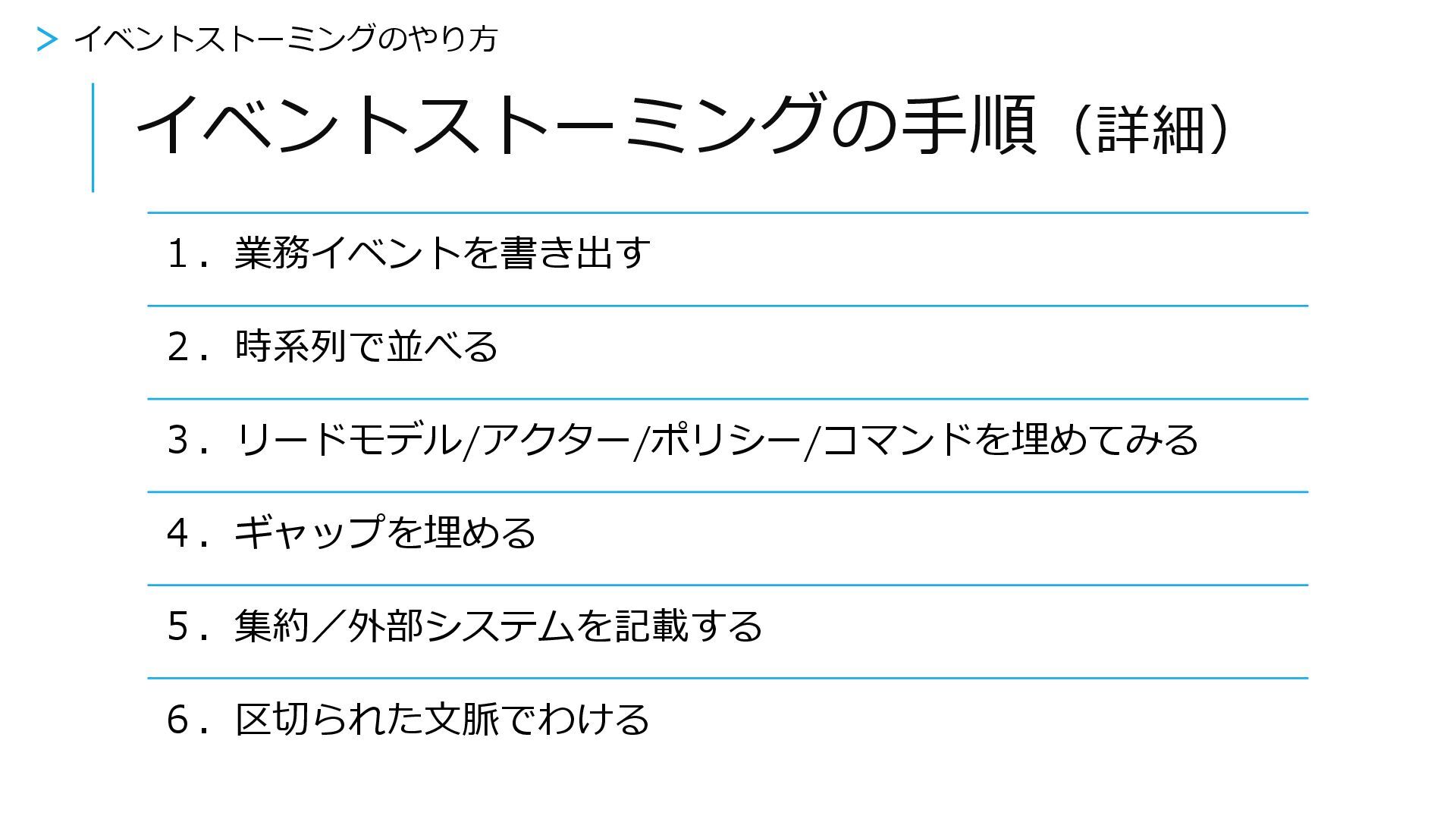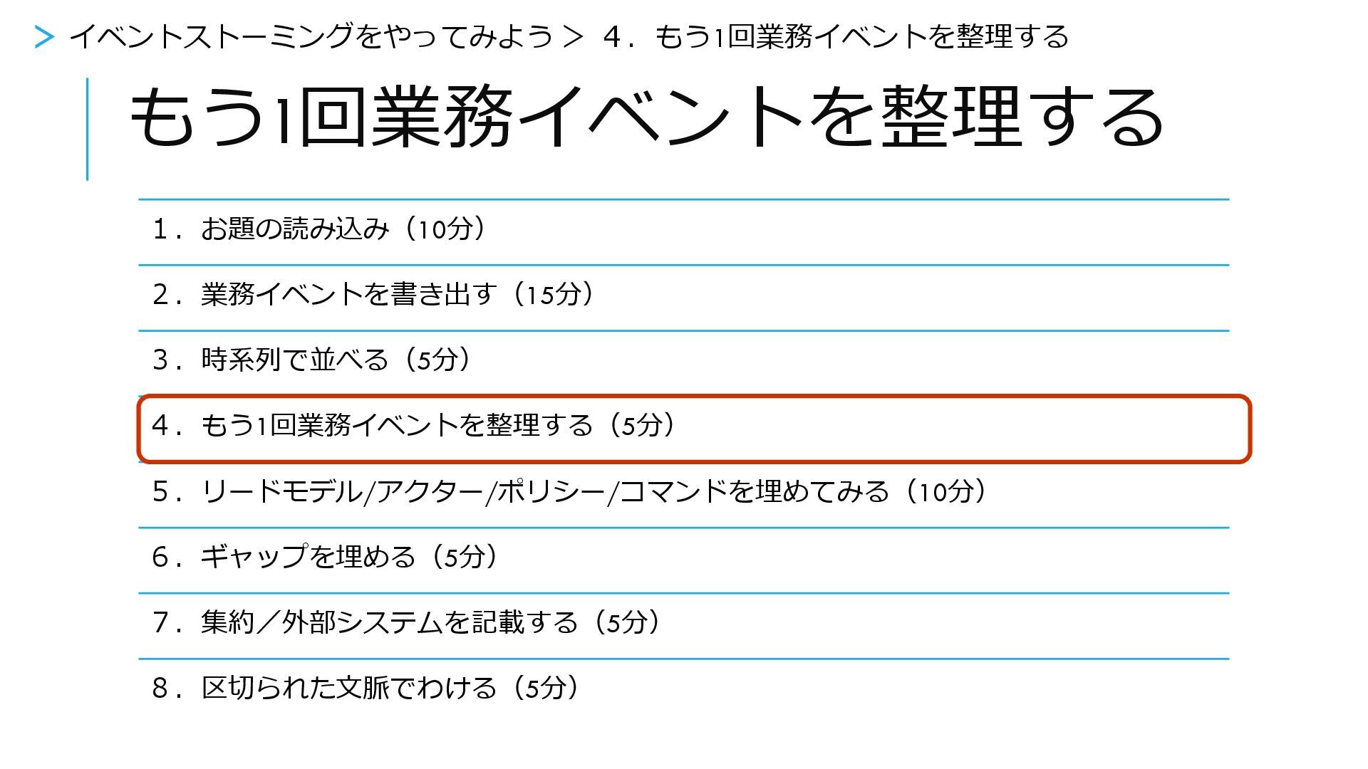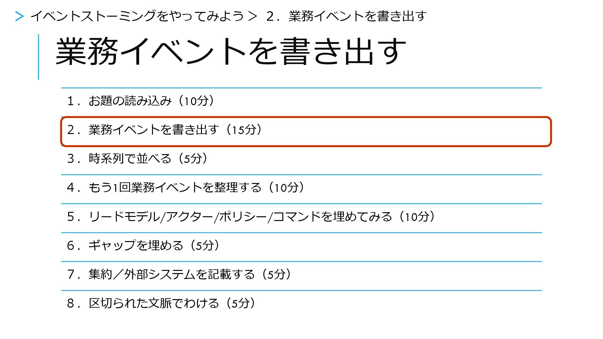 もう1回業務イベントを整理する 1.お題の読み込み(10分) 2.業務イベントを書き出す(15分) 3.時系列で並べる(5分) 4.もう1回業務イベントを整理する(5分) 5.リードモデル/アクター/ポリシー/コマンドを埋めてみる(10分) 6.ギャップを埋める(5分) 7.集約/外部システムを記載する(5分) 8.区切られた文脈でわける(5分) >