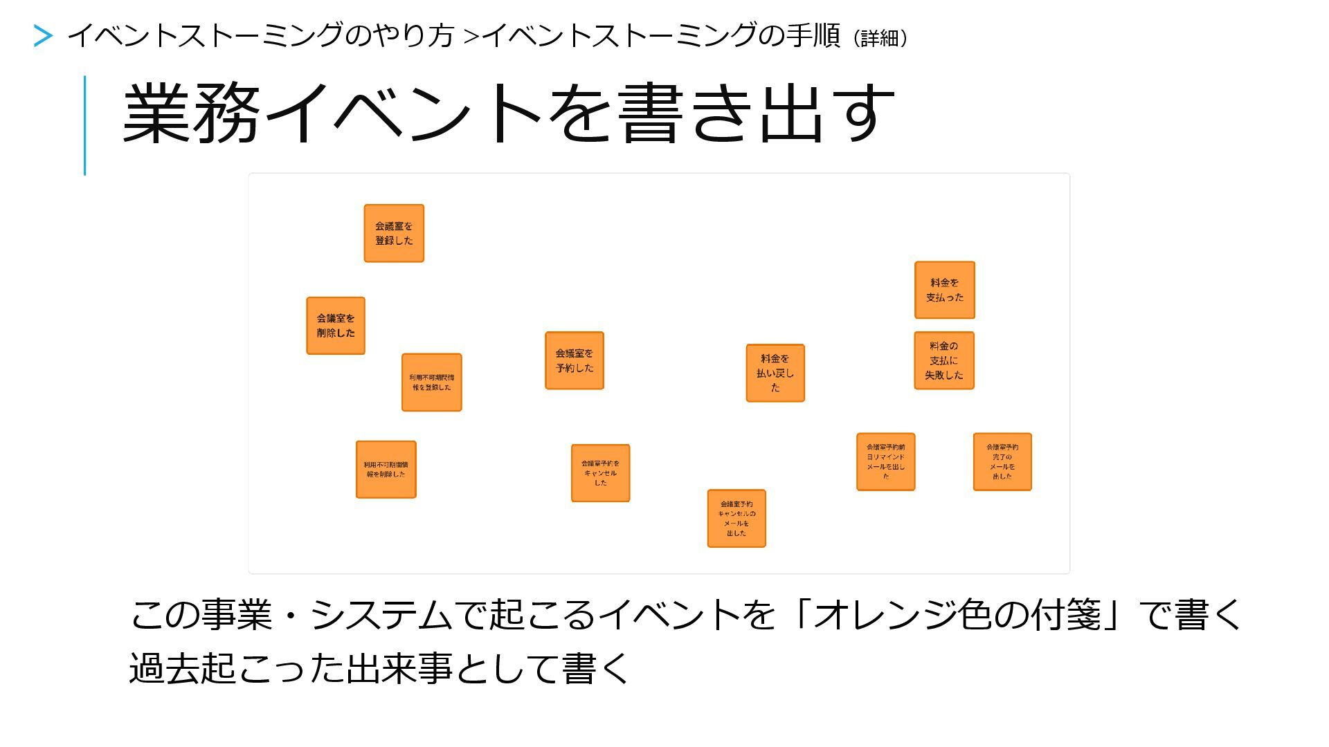 業務イベントを書き出す > イベントストーミングをやってみよう > 2.業務イベントを書き出す この事業・システムで起こるイベントを「オレンジ色の付箋」で書く 過去起こった出来事として書く