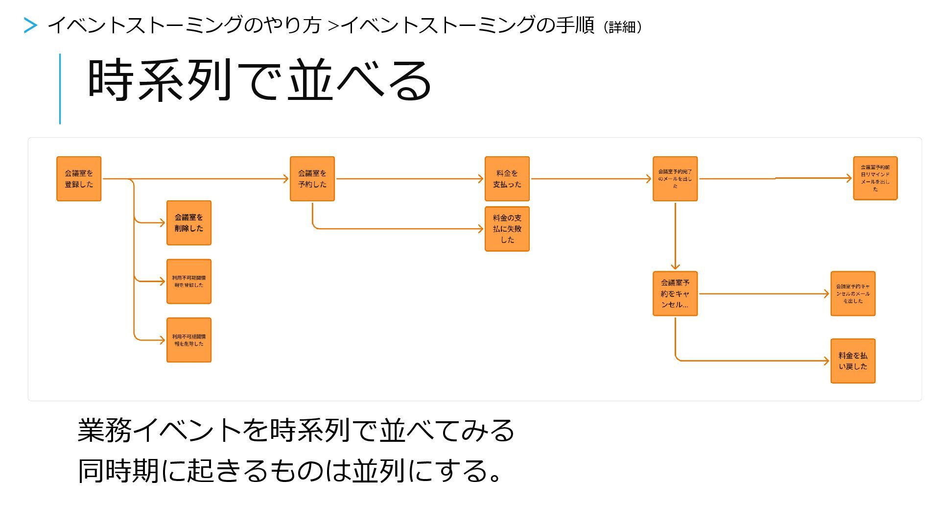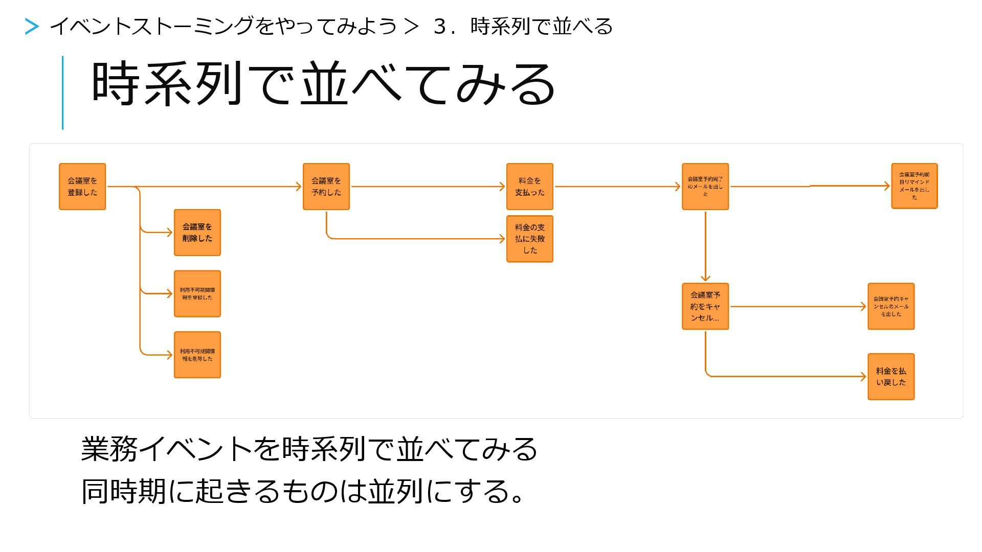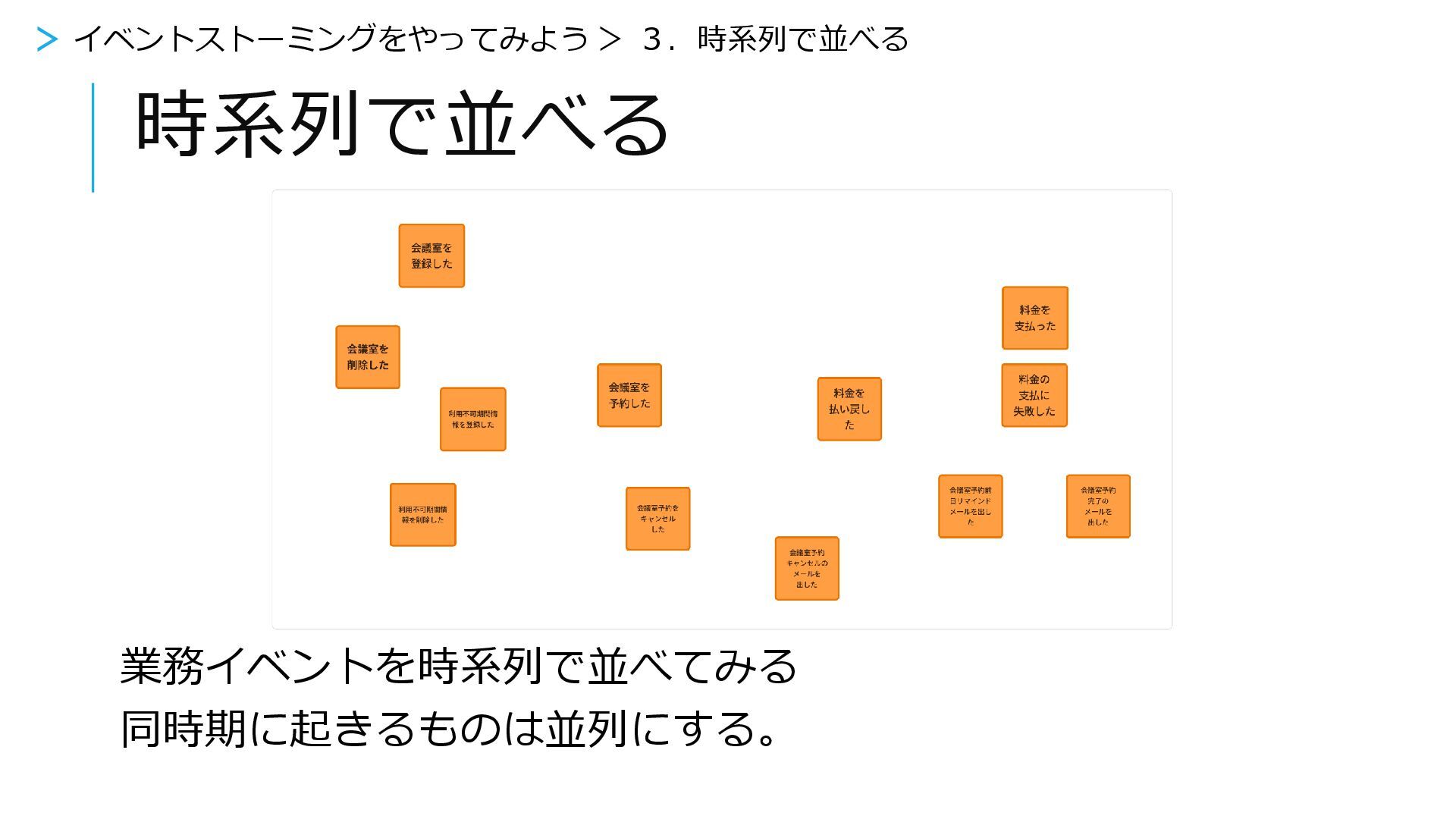 時系列で並べてみる > イベントストーミングをやってみよう > 3.時系列で並べる 業務イベントを時系列で並べてみる 同時期に起きるものは並列にする。