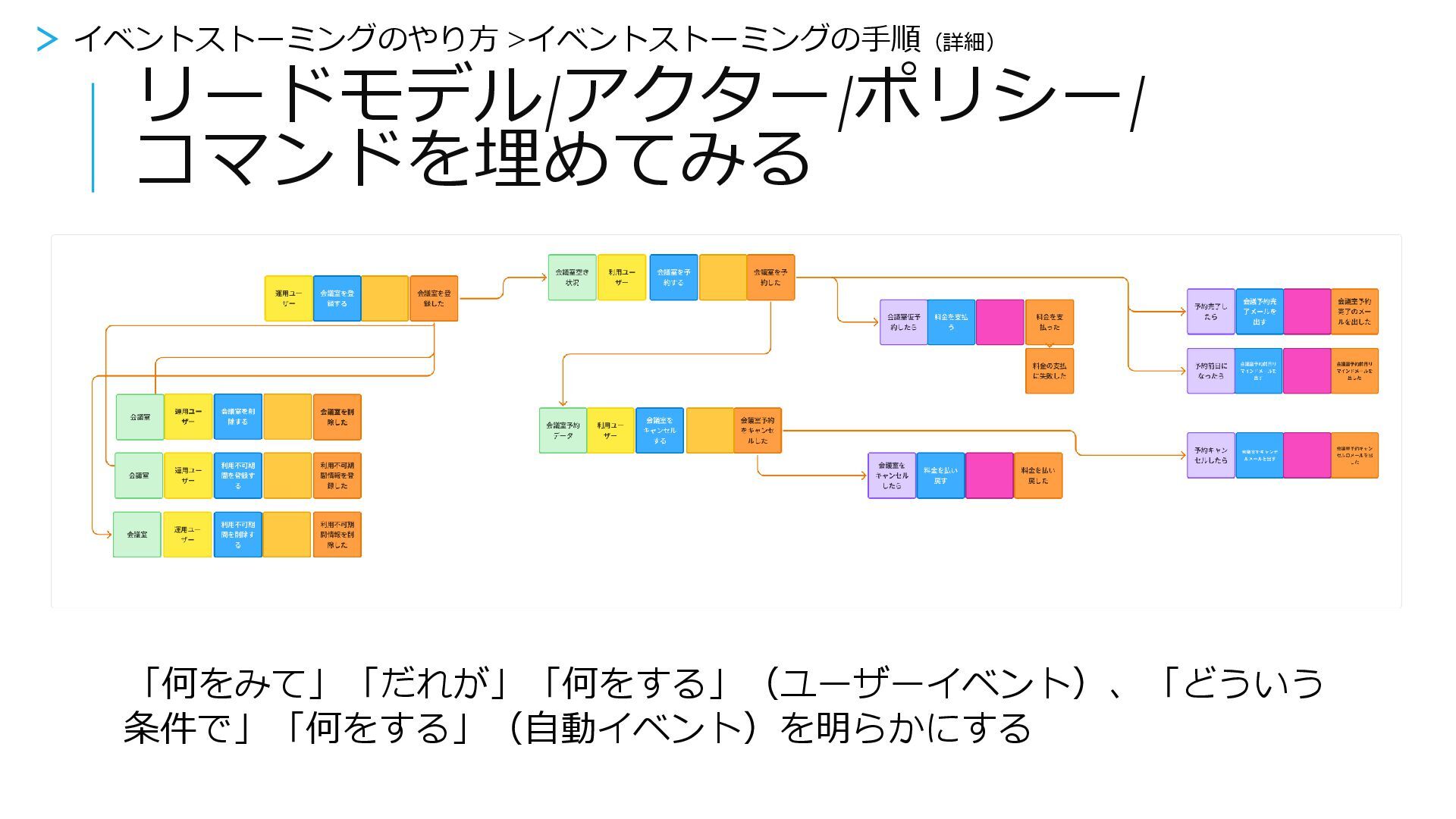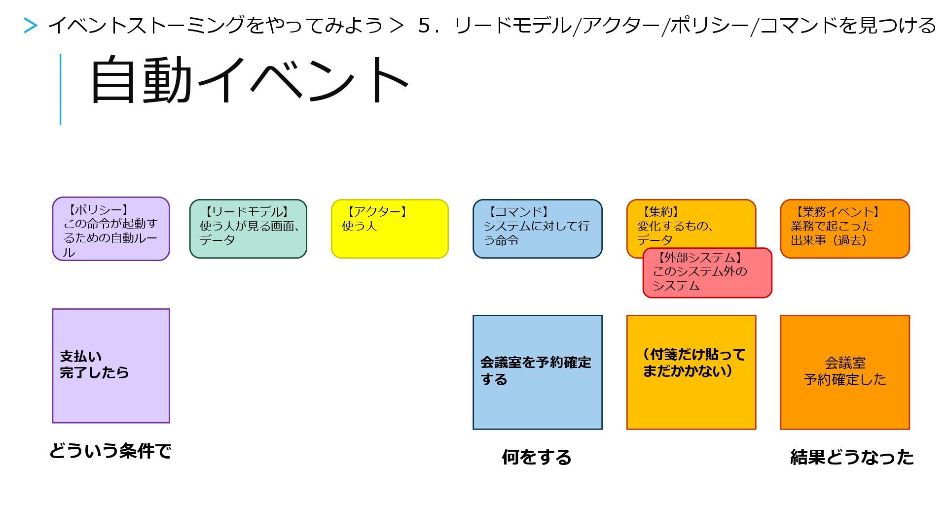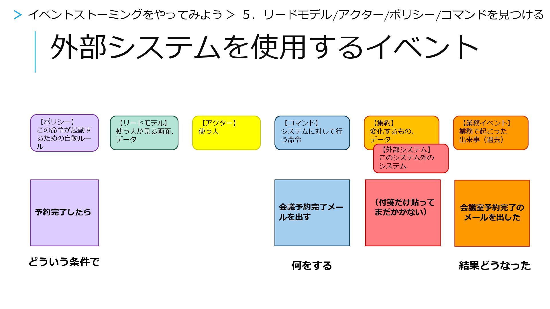 【アクター】 使う人 【コマンド】 システムに対して行 う命令 【集約】 変化するもの、 データ 【外部システム】 このシステム外の システム 【ポリシー】 この命令が起動す るための自動ルー ル 会議予約完了メー ルを出す (付箋だけ貼って まだかかない) 予約完了したら 会議室予約完了の メールを出した > イベントストーミングをやってみよう > 5.リードモデル/アクター/ポリシー/コマンドを見つける