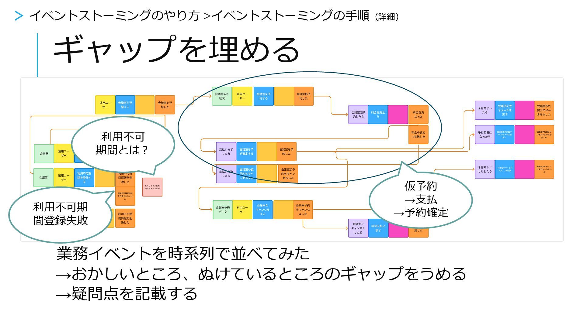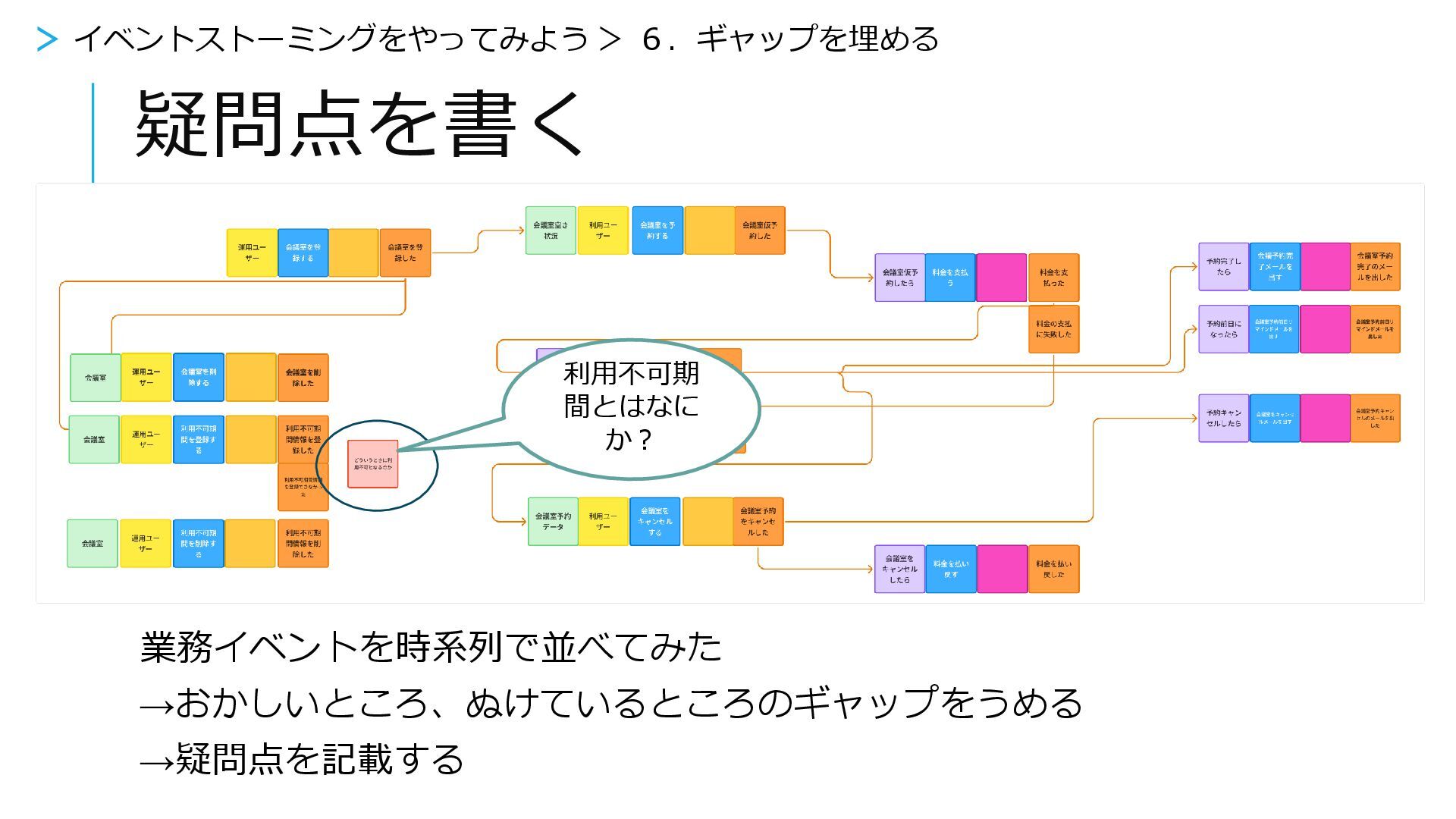 疑問点を書く 利用不可期 間とはなに か? > イベントストーミングをやってみよう > 6.ギャップを埋める 業務イベントを時系列で並べてみた →おかしいところ、ぬけているところのギャップをうめる