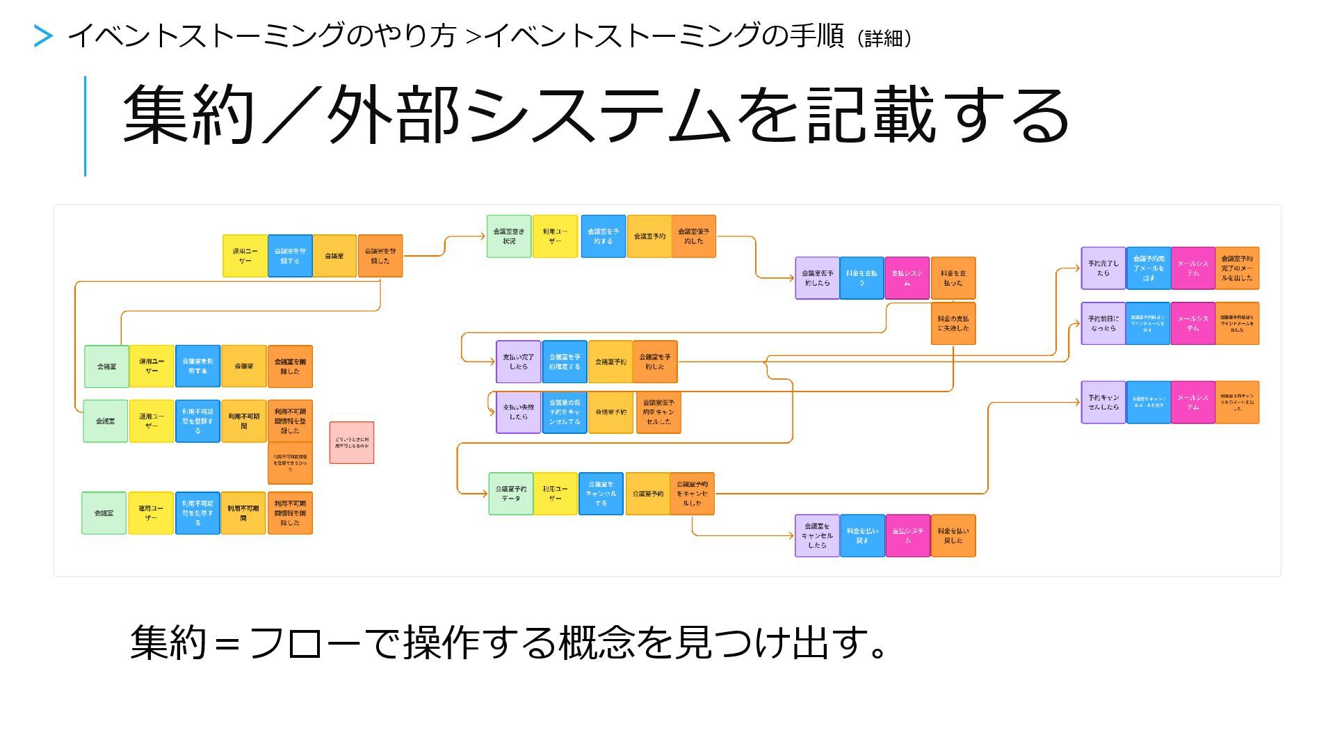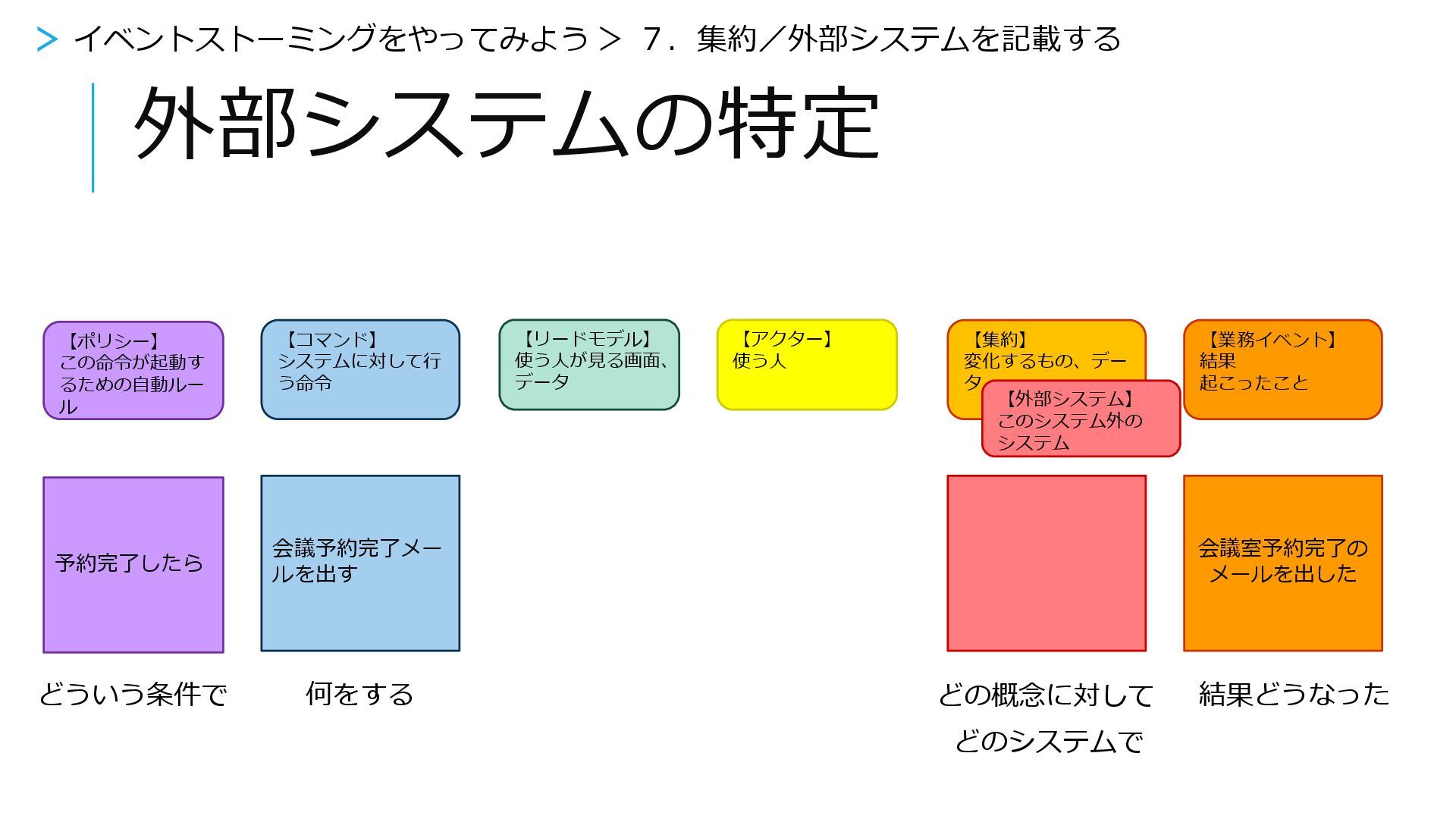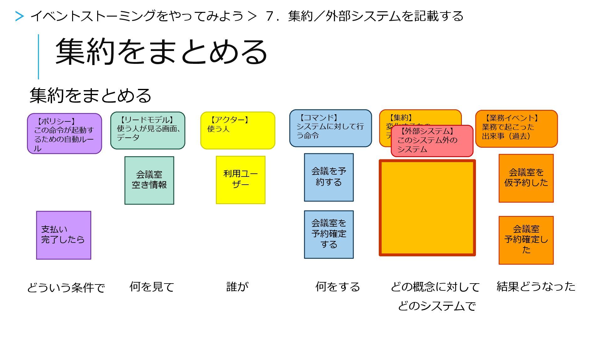 【外部システム】 このシステム外の システム 【ポリシー】 この命令が起動す るための自動ルー ル 会議予約完了メー ルを出す 予約完了したら 会議室予約完了の メールを出した どういう条件で どの概念に対して 結果どうなった 何をする どのシステムで 【リードモデル】 使う人が見る画面、 データ 【アクター】 使う人 > イベントストーミングをやってみよう > 7.集約/外部システムを記載する