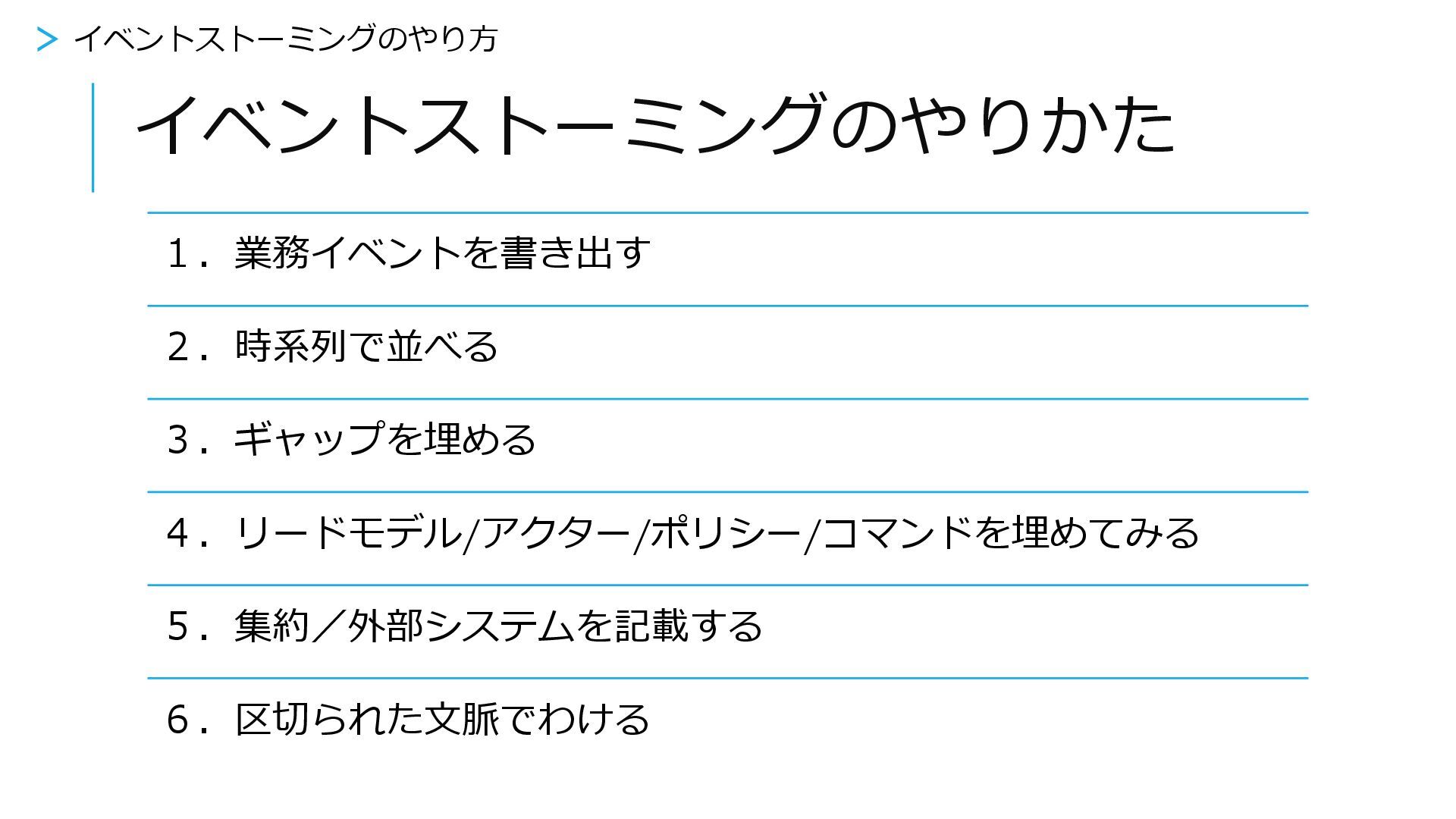 区切られた文脈でわける 1.お題の読み込み(10分) 2.業務イベントを書き出す(15分) 3.時系列で並べる(5分) 4.ギャップを埋める(5分) 5.もう1回業務イベントを整理する(10分) 6.リードモデル/アクター/ポリシー/コマンドを埋めてみる(10分) 7.集約/外部システムを記載する(5分) 8.区切られた文脈でわける(5分) >