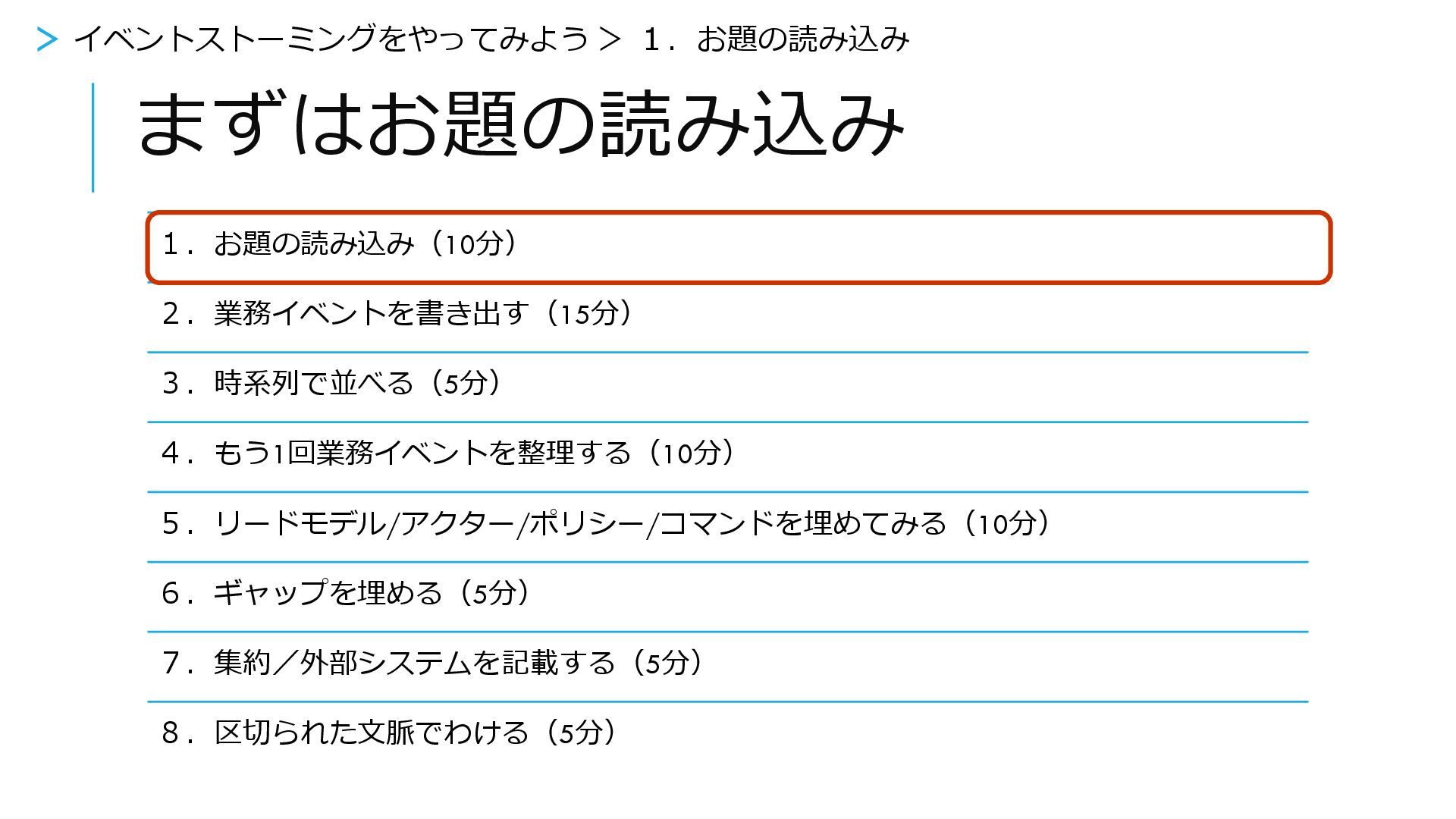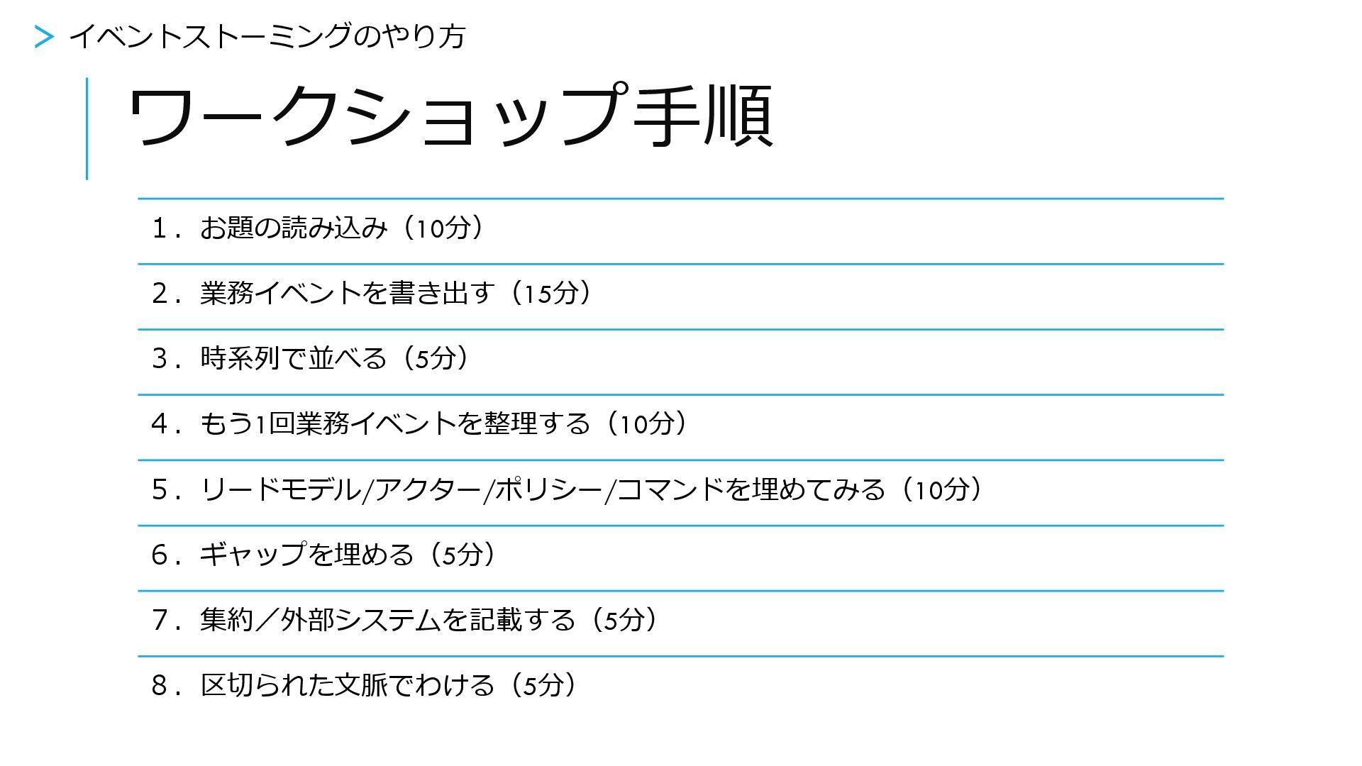 ギャップを埋める 1.お題の読み込み(10分) 2.業務イベントを書き出す(15分) 3.時系列で並べる(5分) 4.もう1回業務イベントを整理する(10分) 5.リードモデル/アクター/ポリシー/コマンドを埋めてみる(10分) 6.ギャップを埋める(5分) 7.集約/外部システムを記載する(5分) 8.区切られた文脈でわける(5分) >