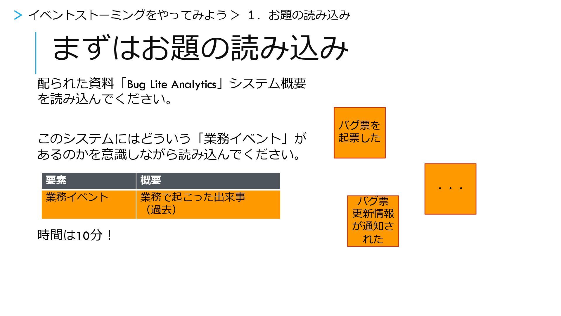 まずはお題の読み込み 配られた資料「Bug Lite Analytics」システム概要 を読み込んでください。 このシステムにはどういう「業務イベント」が あるのかを意識しながら読み込んでください。 時間は10分! バグ票を 起票した