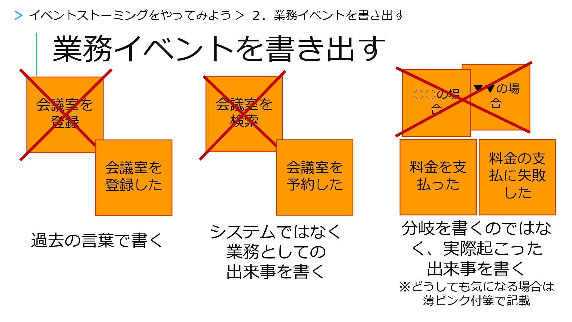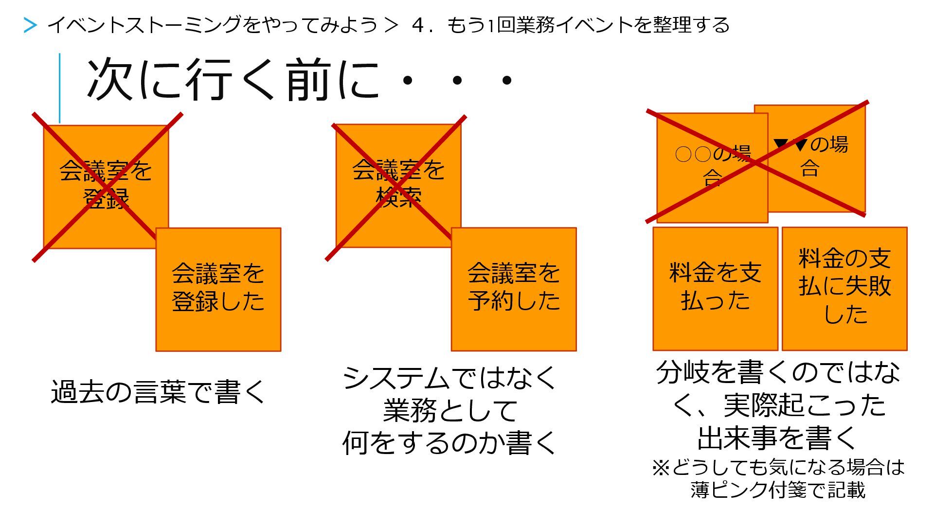 登録した 会議室を 予約した > イベントストーミングをやってみよう > 4.もう1回業務イベントを整理する ▼▼の場 合 ◦◦の場 合 料金を支 払った 分岐を書くのではな く、実際起こった 出来事を書く ※どうしても気になる場合は 薄ピンク付箋で記載 料金の支 払に失敗 した