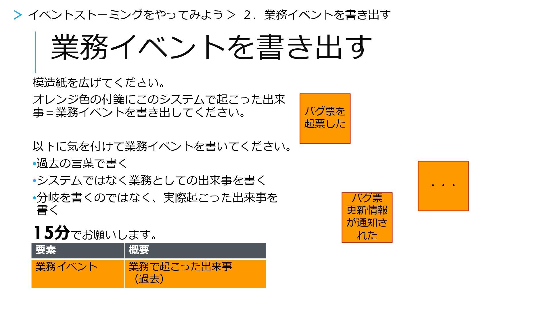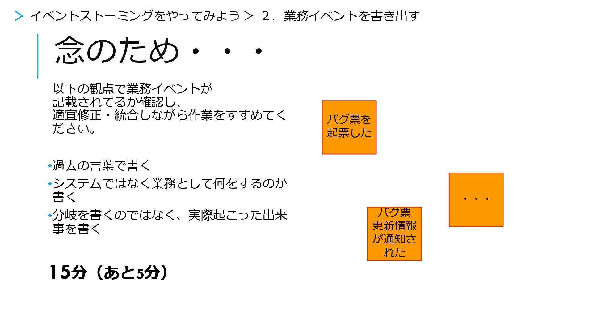 15分(あと5分) バグ票を 起票した ・・・ バグ票 更新情報 が通知さ れた > イベントストーミングをやってみよう > 2.業務イベントを書き出す