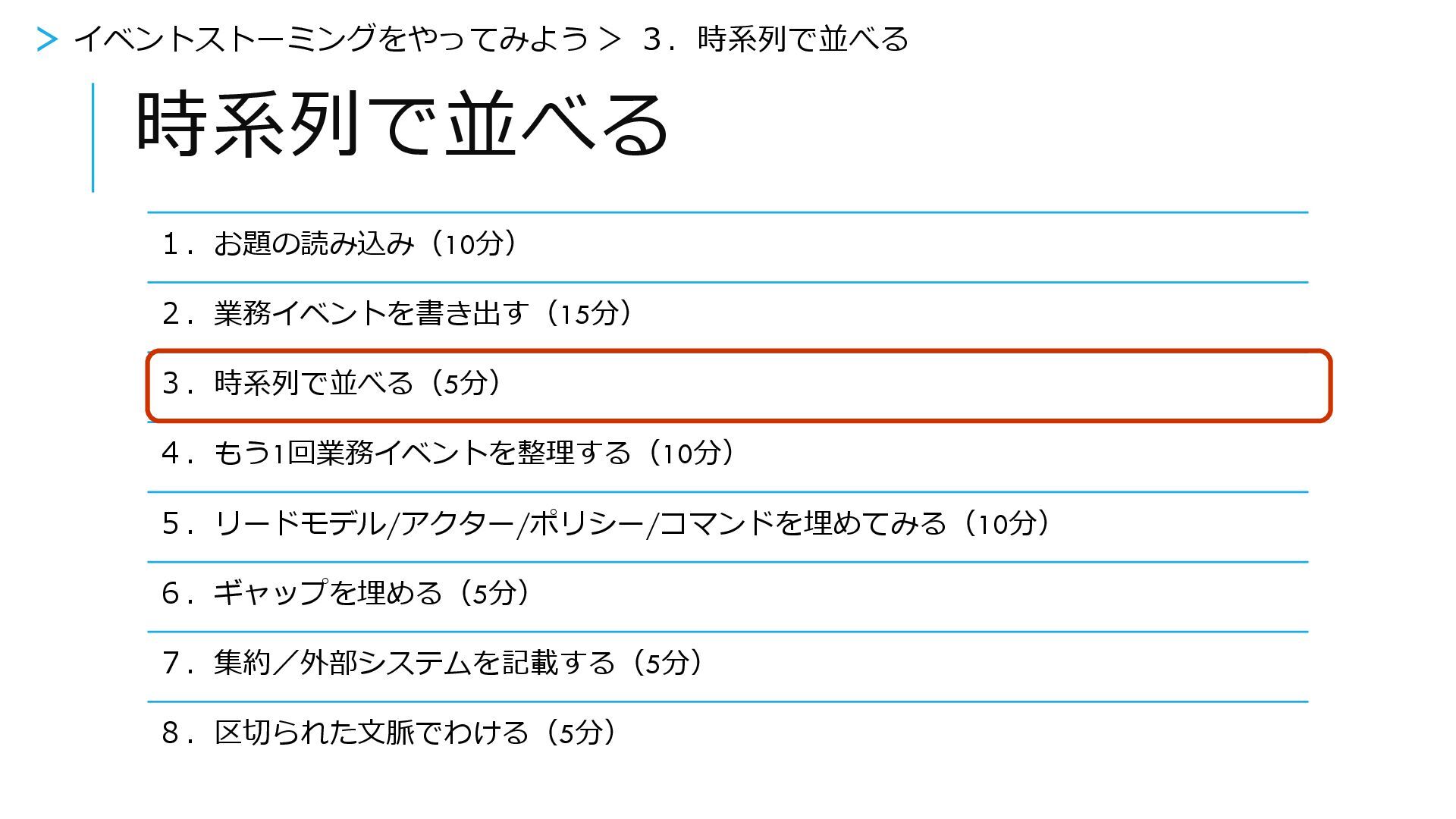 時系列で並べる 1.お題の読み込み(10分) 2.業務イベントを書き出す(15分) 3.時系列で並べる(5分) 4.もう1回業務イベントを整理する(10分) 5.リードモデル/アクター/ポリシー/コマンドを埋めてみる(10分) 6.ギャップを埋める(5分) 7.集約/外部システムを記載する(5分) 8.区切られた文脈でわける(5分) >