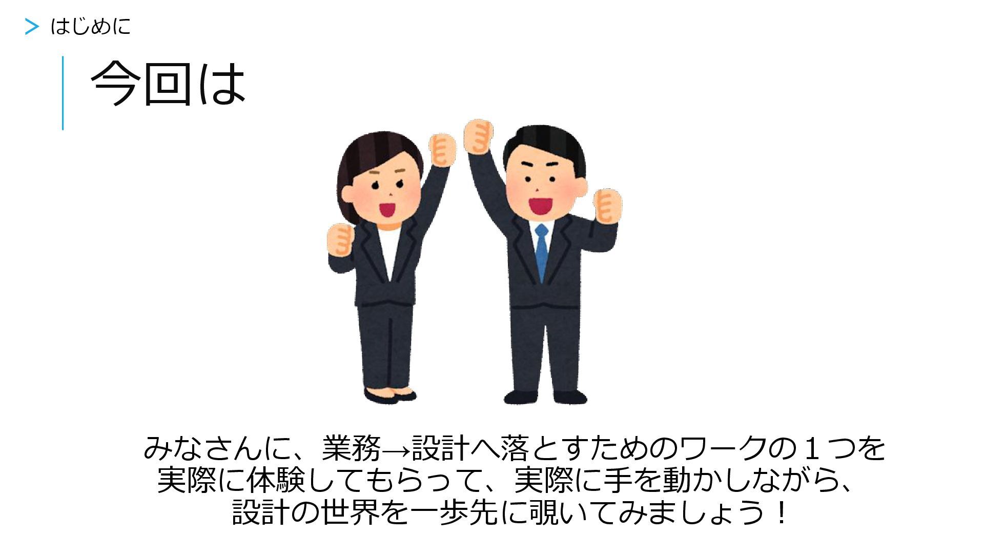 今回は みなさんに、業務→設計へ落とすためのワークの1つを 実際に体験してもらって、実際に手を動かしながら、 設計の世界を一歩先に覗いてみましょう! > はじめに