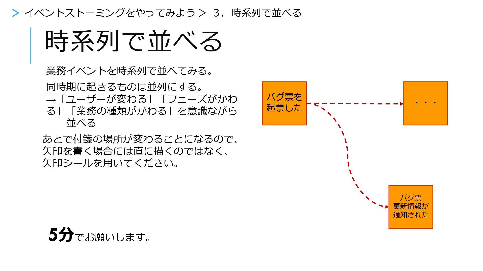 時系列で並べる 業務イベントを時系列で並べてみる。 同時期に起きるものは並列にする。 →「ユーザーが変わる」「フェーズがかわ る」「業務の種類がかわる」を意識ながら 並べる あとで付箋の場所が変わることになるので、 矢印を書く場合には直に描くのではなく、 矢印シールを用いてください。 5分でお願いします。
