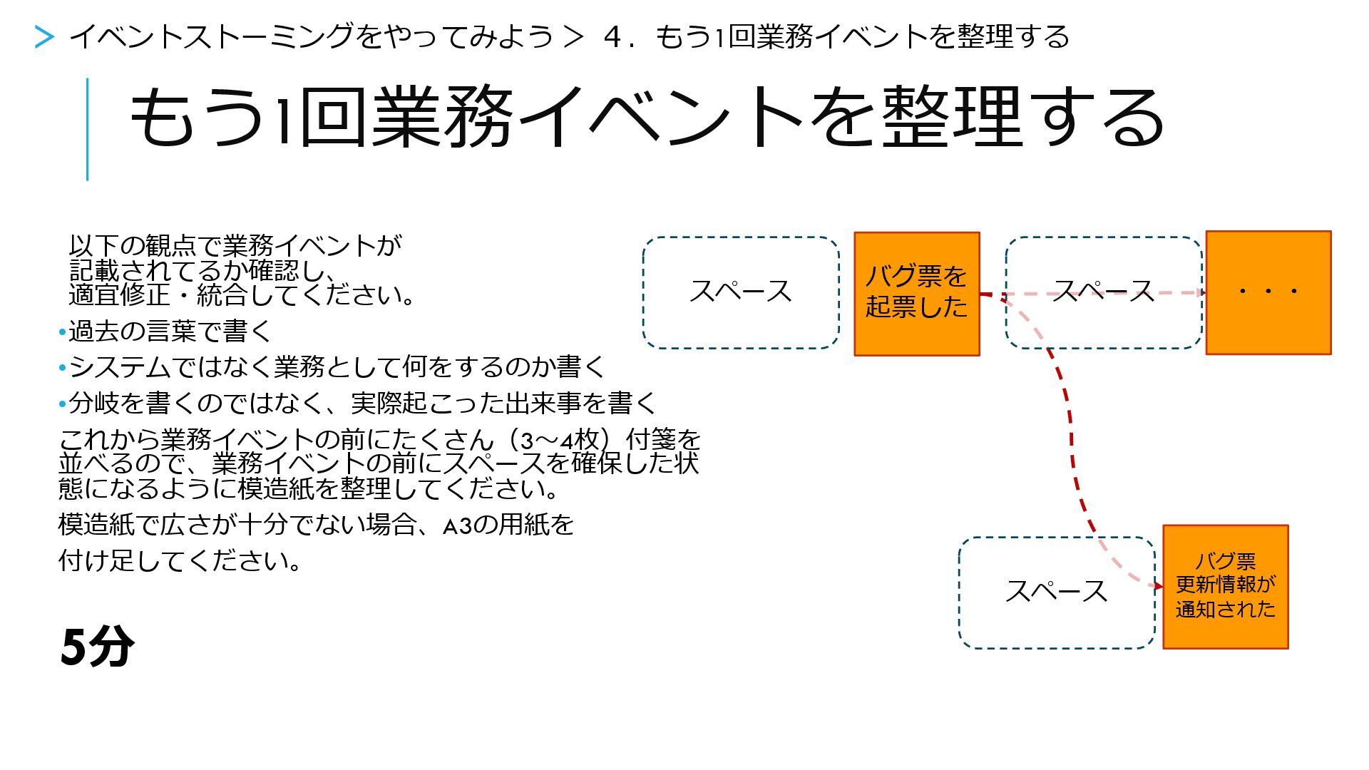 模造紙で広さが十分でない場合、A3の用紙を 付け足してください。 5分 バグ票を 起票した ・・・ バグ票 更新情報が 通知された スペース スペース スペース > イベントストーミングをやってみよう > 4.もう1回業務イベントを整理する