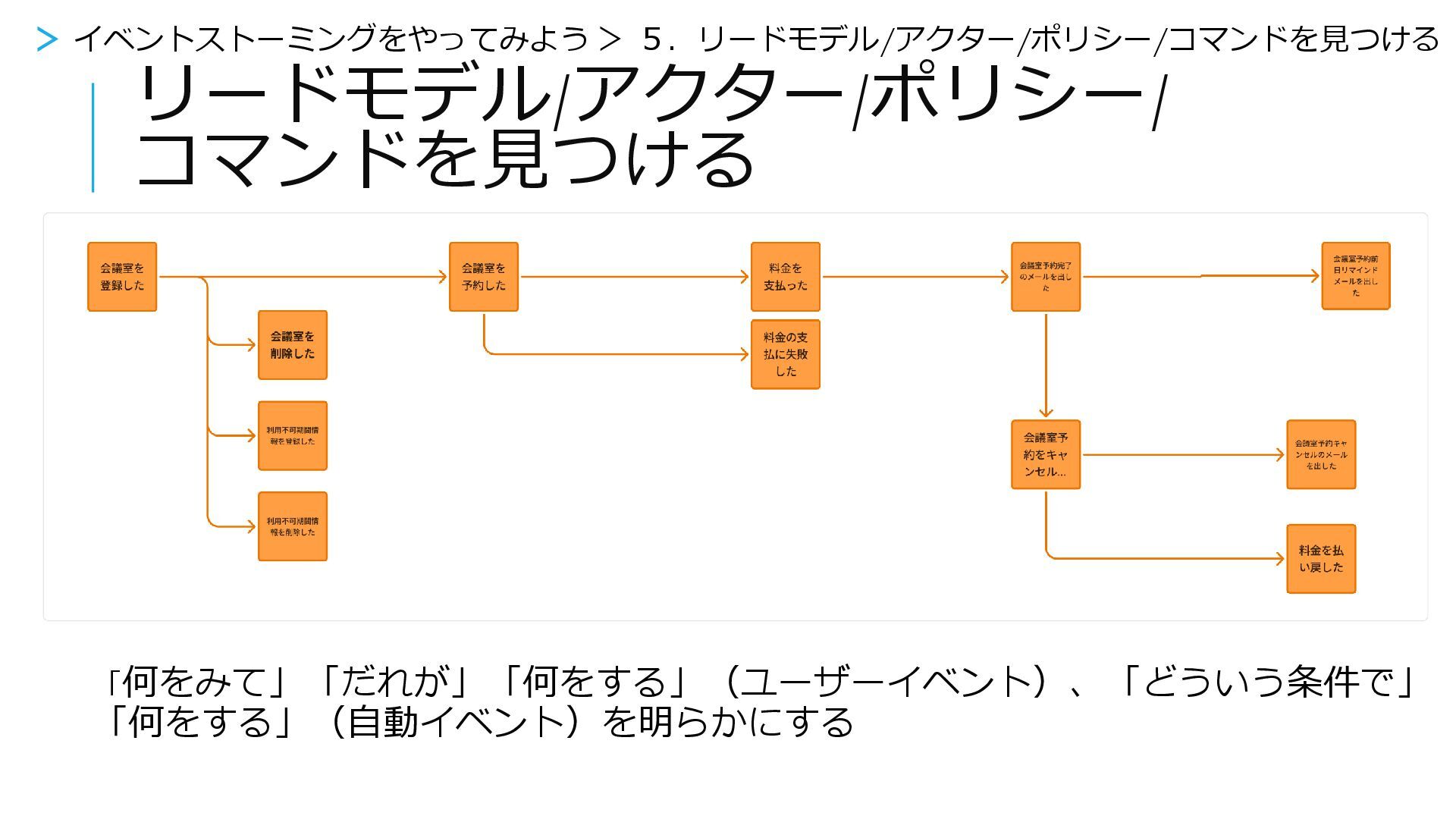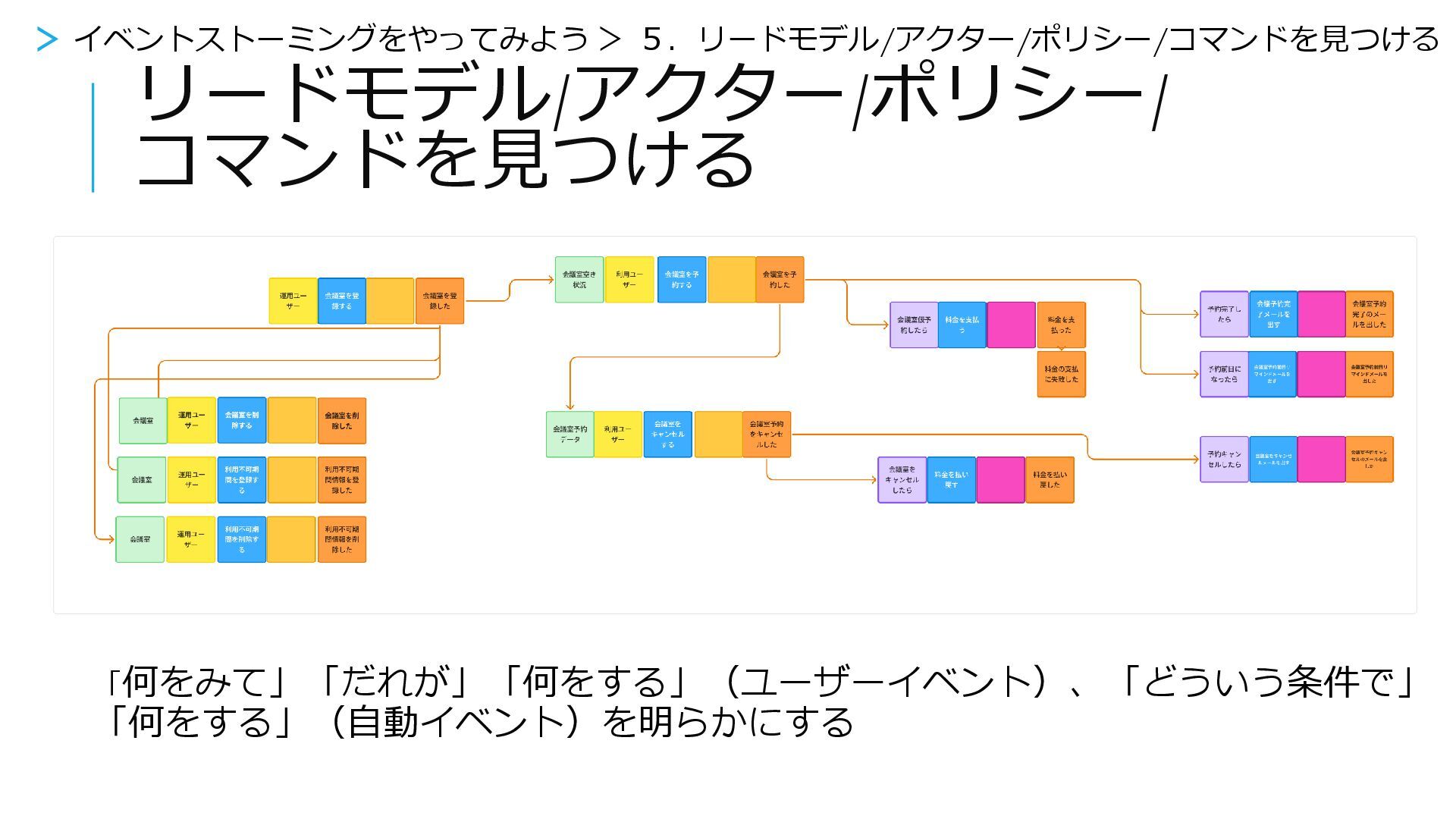 イベントストーミングをやってみよう > 5.リードモデル/アクター/ポリシー/コマンドを見つける
