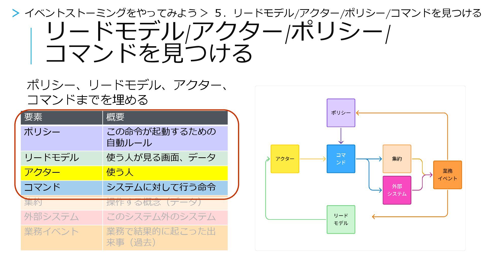 結果どうなった 何をする 【業務イベント】 業務で起こった 出来事(過去) 【リードモデル】 使う人が見る画面、 データ 【アクター】 使う人 【コマンド】 システムに対して行 う命令 【集約】 変化するもの、 データ 【外部システム】 このシステム外の システム 【ポリシー】 この命令が起動す るための自動ルー ル > イベントストーミングをやってみよう > 5.リードモデル/アクター/ポリシー/コマンドを見つける