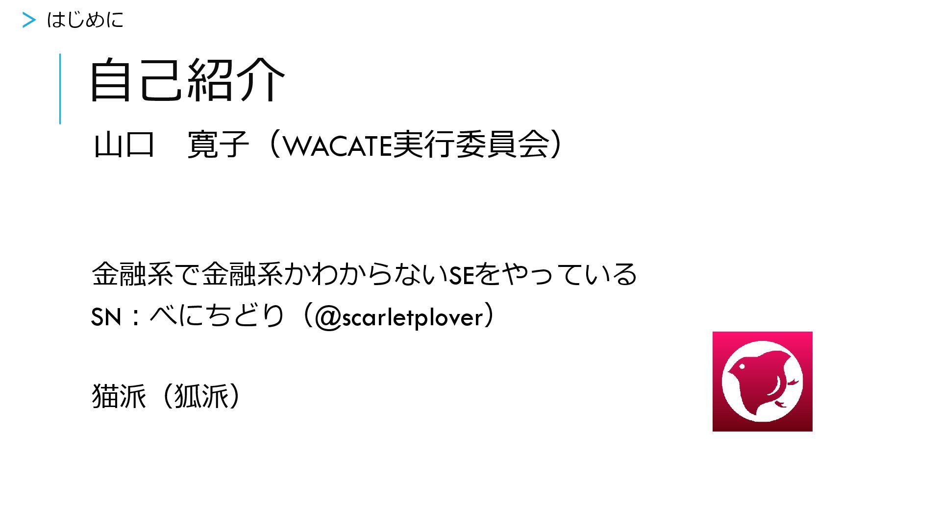 自己紹介 山口 寛子(WACATE実行委員会) 金融系で金融系かわからないSEをやっている SN:べにちどり(@scarletplover) 猫派(狐派) > はじめに